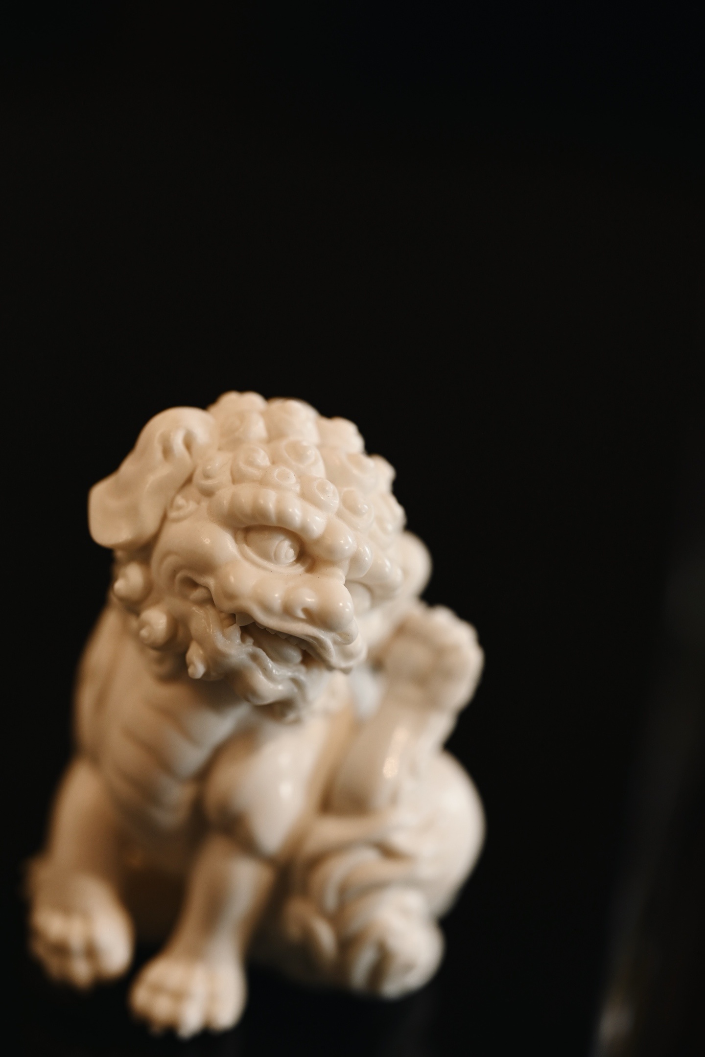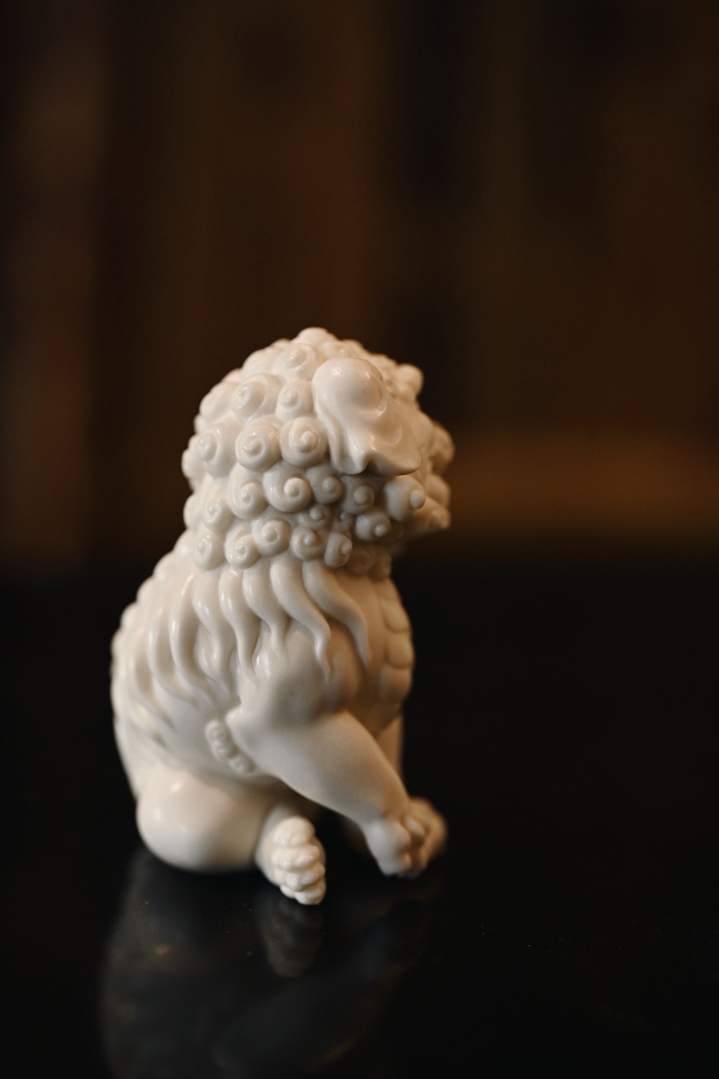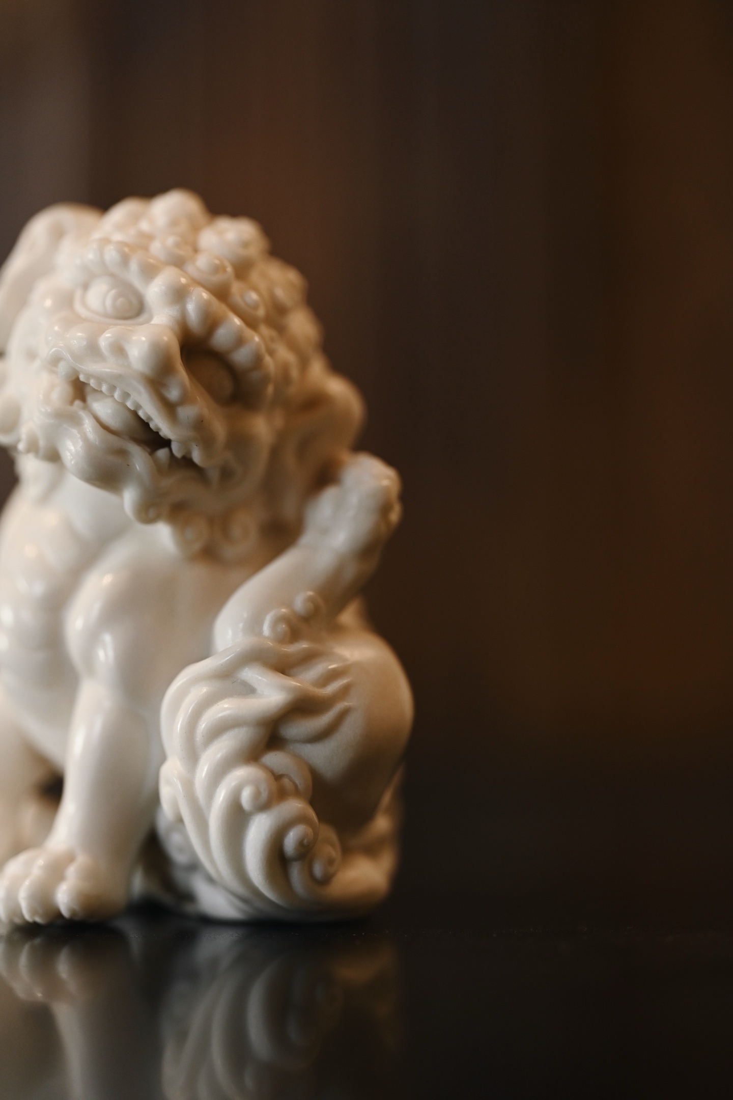 雕刻唐狮昂首挺胸,双目圆瞪,阔口锐牙,气焰逼人,颈鬃束束垂卷,层次分明,丝丝有序,肌骨饱满,气势十足。