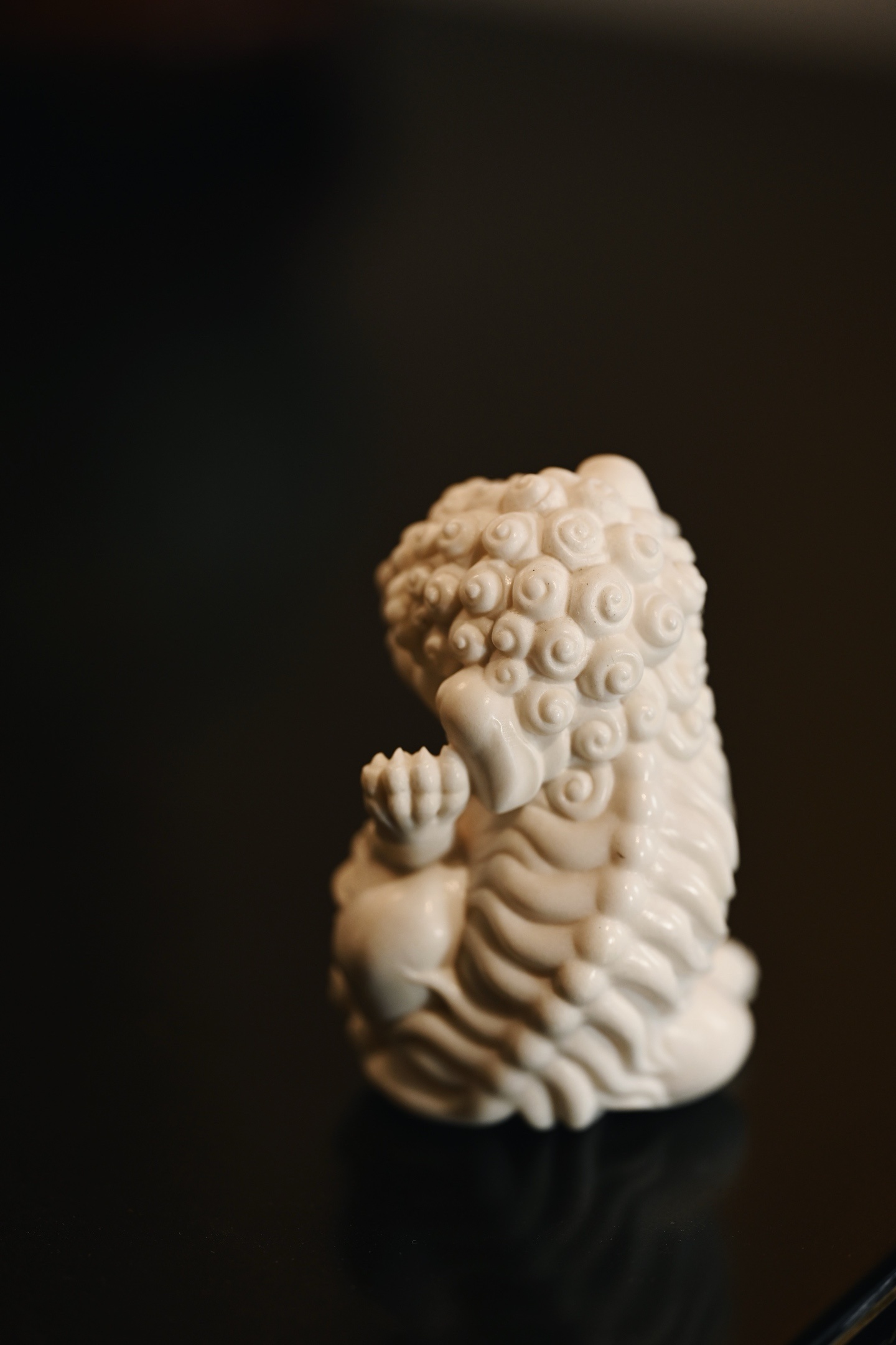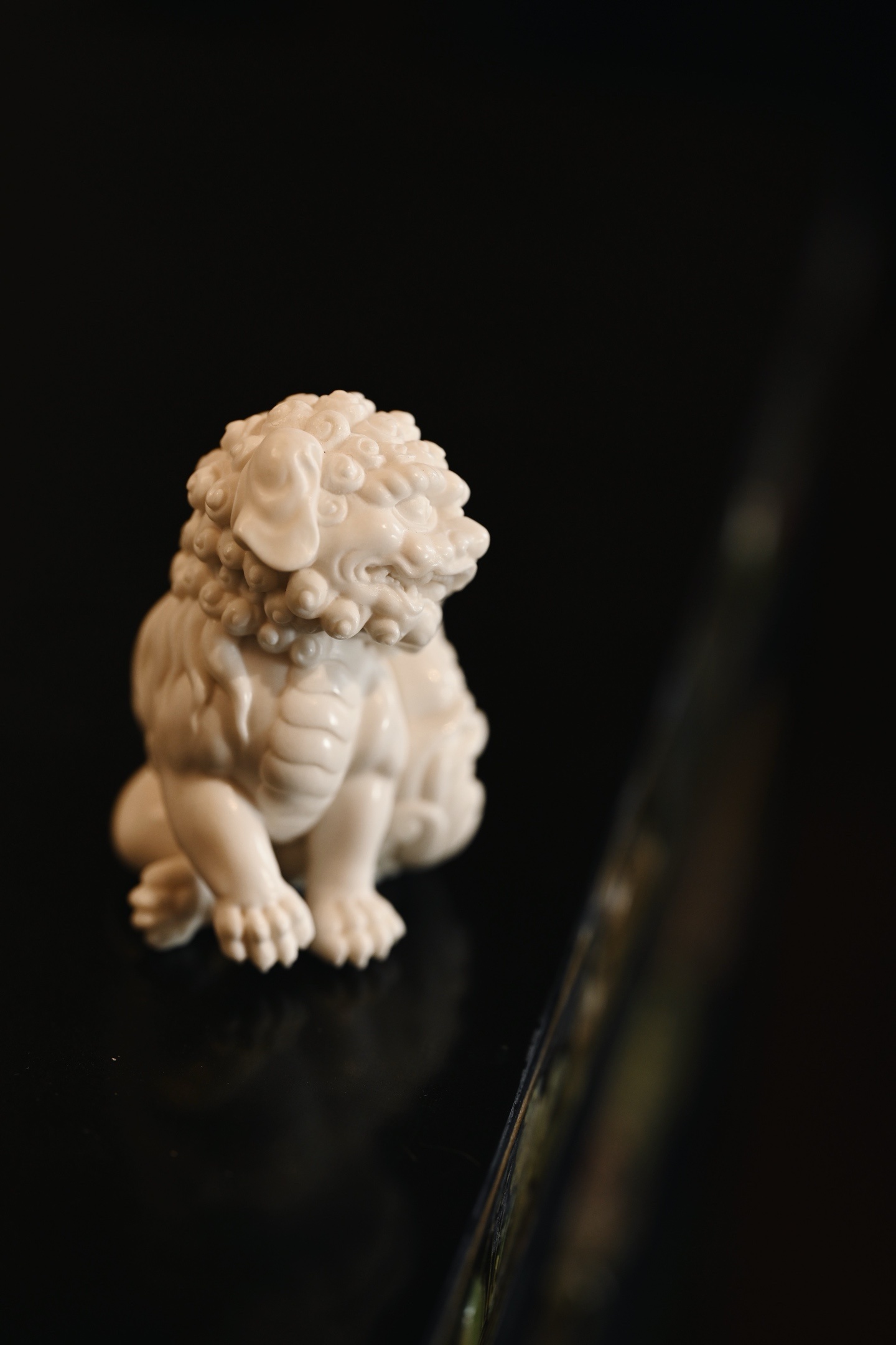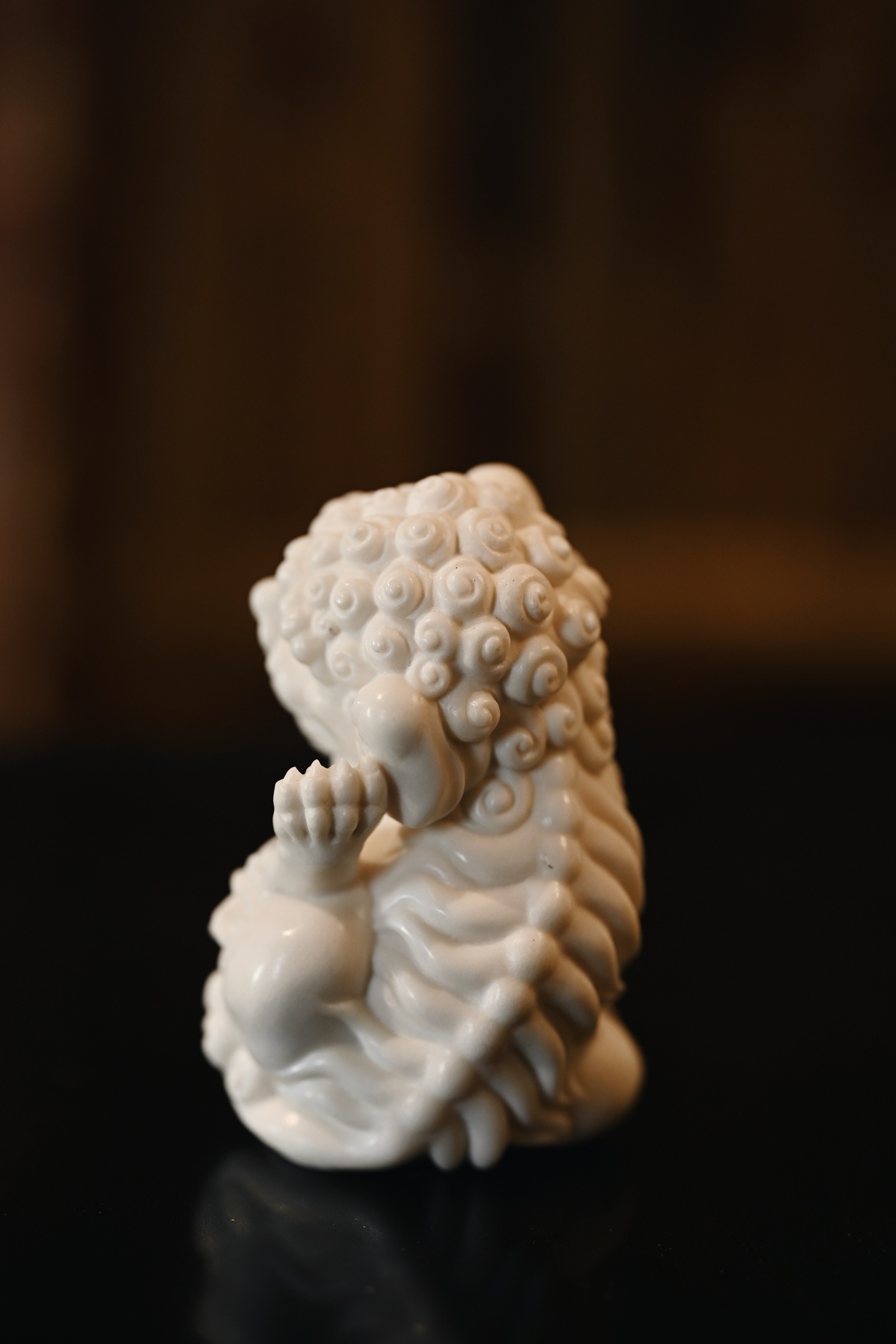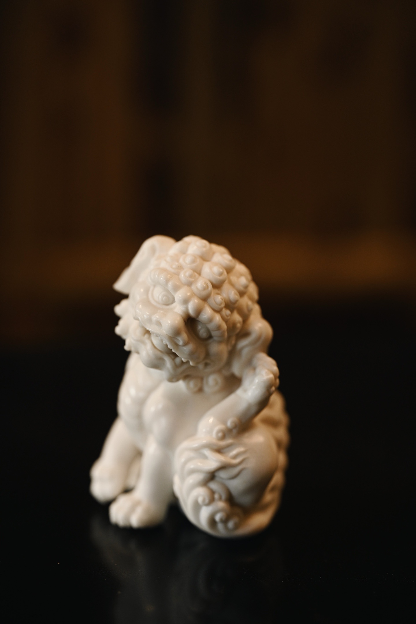 雕刻唐狮昂首挺胸,双目圆瞪,阔口锐牙,气焰逼人,颈鬃束束垂卷,层次分明,丝丝有序,肌骨饱满,气势十足。