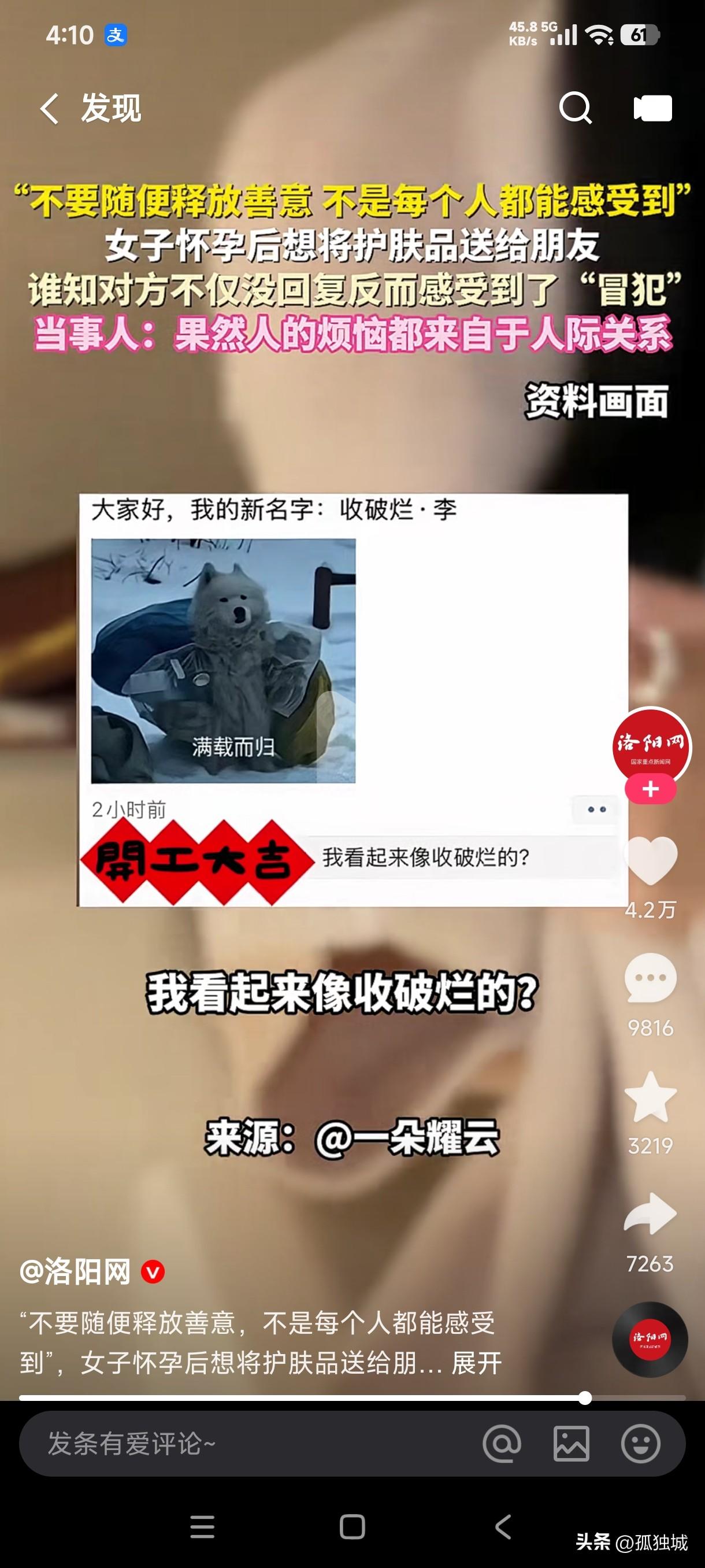 不要随便释放善意,不是每个人都能感受到。 女子怀孕后想将未拆封的护肤品送给朋友,她发消息朋友没有回复,过了一会她在朋友圈看到朋友发了一条,我看起来像收破烂的吗? 女子一片好心没想到对方不领情,反而还冒犯了人家,这究竟是朋友关系相处的不融洽,还是对方感觉女子在可怜自己,在给自己施舍?令女子也没想到的是,她发消息问朋友要不要,结果人家并没有给她回复,过了一会她却在朋友圈看到朋友发了一条说说,我看起来像收破烂的吗? 这种情况不是自己给自己找不痛快吗?好心给人家免费送,没想到人家不领情,这无疑是拿自己的热脸贴别人的冷屁股吗?并不是每个人都能感受到别人的善意,把善意留给最亲近的人,有些朋友只不过是利益关系罢了,表面看起来是朋友,背后地里也许比仇人还仇人是不是?