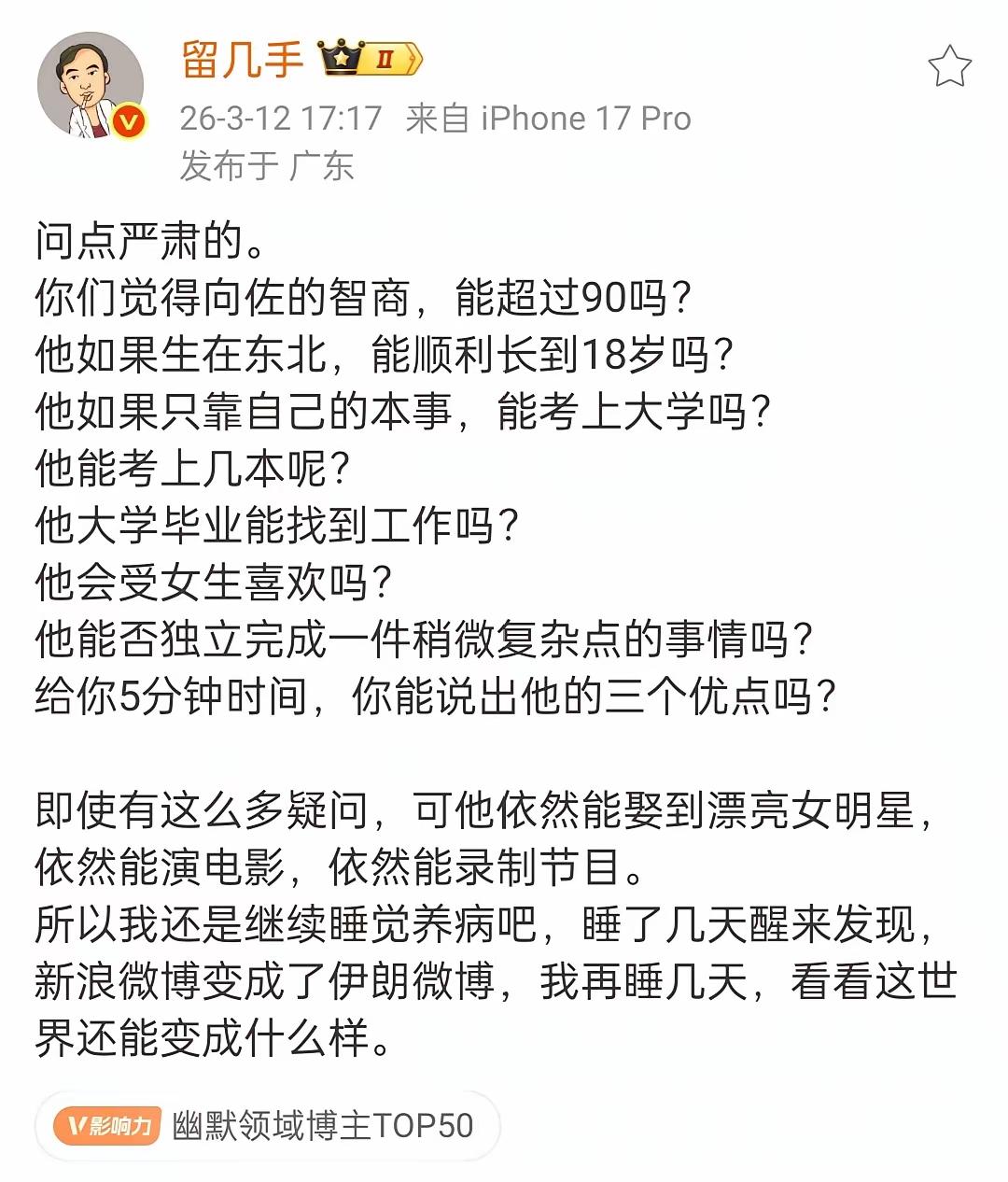 这位留几手先生说话真酸,向佐这人虽然抽象,但也没必要公开公然的挑衅吧!都是公众人物,互不揭短也是底线,他的人生就是不与平常人一样,开局太高端了,自己又与高端局不匹配,只好另辟蹊径,也算闯出了一片不一样的天地了,已经很好了。你敢发这篇文章肯定是知道向佐看到了也不计较,所以向佐这人还是有可圈可点之处的!
