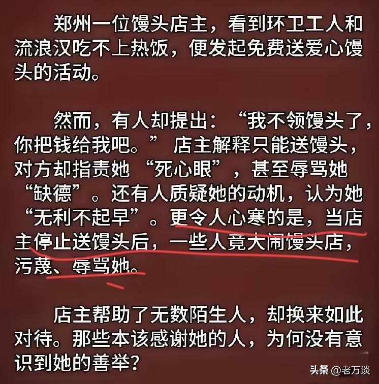 网友分享了一个好人故事,让人非常的感慨和难受,也让好心人非常寒心。事情是这样的,郑州有位包子店老板看到环卫工工作辛苦,没有时间吃上可口的热饭,所以自发的给环卫工送上爱心馒头。但是很多环卫工表示,把馒头换成前馒头店老板做出解释,自己只能送馒头,老板的行为就受到了不明真相环卫工诅咒和辱骂,甚至有人质疑他的初衷当老板停止送馒头的时候,更是有不少人辱骂他。看到这样的事情,真的让人非常的寒心,做好人居然还会被别人误解,做好人居然被人辱骂,好人难做,难道做好事还有错吗。当善心变成了道德绑架,对于善心人和社会而言,是莫大的悲哀。如果是这样,还有多少人愿意去做好事吗?不能让好心人寒心。