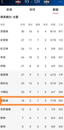 火箭大将霍勒迪的手感真是吓死人了!在昨天火箭客场以93:129惨败于掘金的比赛中,霍勒迪的投篮手感冰凉到了极点,他在替补出战的16分钟里,投篮10中1,其中三分球4中0无比低效的得到2分,他的场上正负值为-17。 NBA常规赛激战正酣,火箭客场奔赴丹佛挑战掘金,这本是一场西部排位关键战,结果比赛走势完全一边倒,火箭最终以93:129输掉36分,遭遇一场毫无还手之力的惨败。 整场比赛下来,火箭不仅整体进攻端彻底哑火,替补席还出现了严重的得分缺口,其中后卫霍勒迪的手感低迷,更是成了全场最扎眼的低效表现,甚至可以说是两队所有登场球员里手感最糟糕的一位。 这场比赛霍勒迪是以替补身份登场,总共出战16分钟,在有限的出场时间里,他的进攻端完全找不到状态。 全场出手10次仅仅命中1球,三分线外4次出手全部偏出,没有一粒三分球入账,整场比赛靠着零星的罚球得分,最终只拿到2分,这样的进攻效率放在常规赛里,确实称得上是极度低效。 更能体现他在场影响力的是,他的场上正负值低至-17,这也直观反映出他登场的时段里,球队不仅没能追分,反而被对手不断拉开分差。 把视角放到全场比赛来看,霍勒迪的糟糕手感并非个例,却成了火箭进攻崩盘的典型缩影。 全队整场三分球34投仅4中,外线彻底失去威胁,进攻端只能陷入低效的内线缠斗,面对掘金的联防和防守压迫,根本找不到破解办法。 而霍勒迪作为替补轮换的一员,球队本指望他能在主力休息时段分担火力、稳住节奏,可他连续出手不中,不仅没能填补得分空缺,反而让火箭的进攻停滞感更强,替补衔接段直接被掘金抓住机会打反击,分差一步步被拉大。 说白了,职业球员赛场出现手感起伏是很常见的事,毕竟篮球比赛的状态本就有好有坏,替补球员的出场时间本就碎片化,节奏调整不到位,出现单场低效也在所难免。 但这场比赛火箭的溃败是全方位的,主力阵容被掘金针对性限制,替补轮换又没能撑起场面,霍勒迪的低迷只是球队整体失常的一部分,并不是这场惨败的唯一原因。 纵观两队球员的整体表现,掘金这边多点开花,穆雷狂砍30分,约基奇拿下三双数据,全队攻防两端都保持着极高的效率。 反观火箭,除了少数几名球员得分上双,大部分球员都陷入得分荒,霍勒迪的10中1,更是把全队的进攻低效推向了极致。 单看这一场比赛,霍勒迪的进攻选择和出手手感确实没在线,多次尝试投篮都没能命中,在场期间没能给球队带来任何正向的进攻帮助。 当然,单场的低迷表现不能定义一名球员的整体实力,霍勒迪此前也有过不错的轮换表现,只是这场比赛恰逢球队整体崩盘,又赶上自己手感冰凉,才成了全场关注的低效点。 这场惨败也给火箭提了个醒,后续的常规赛里,替补阵容的稳定性需要尽快提升,角色球员的状态调整也至关重要,毕竟想要在西部站稳脚跟,轮换阶段的火力支撑必不可少。 以上都是个人观点,对此您有什么不同的看法,可以在评论区留言讨论!!!