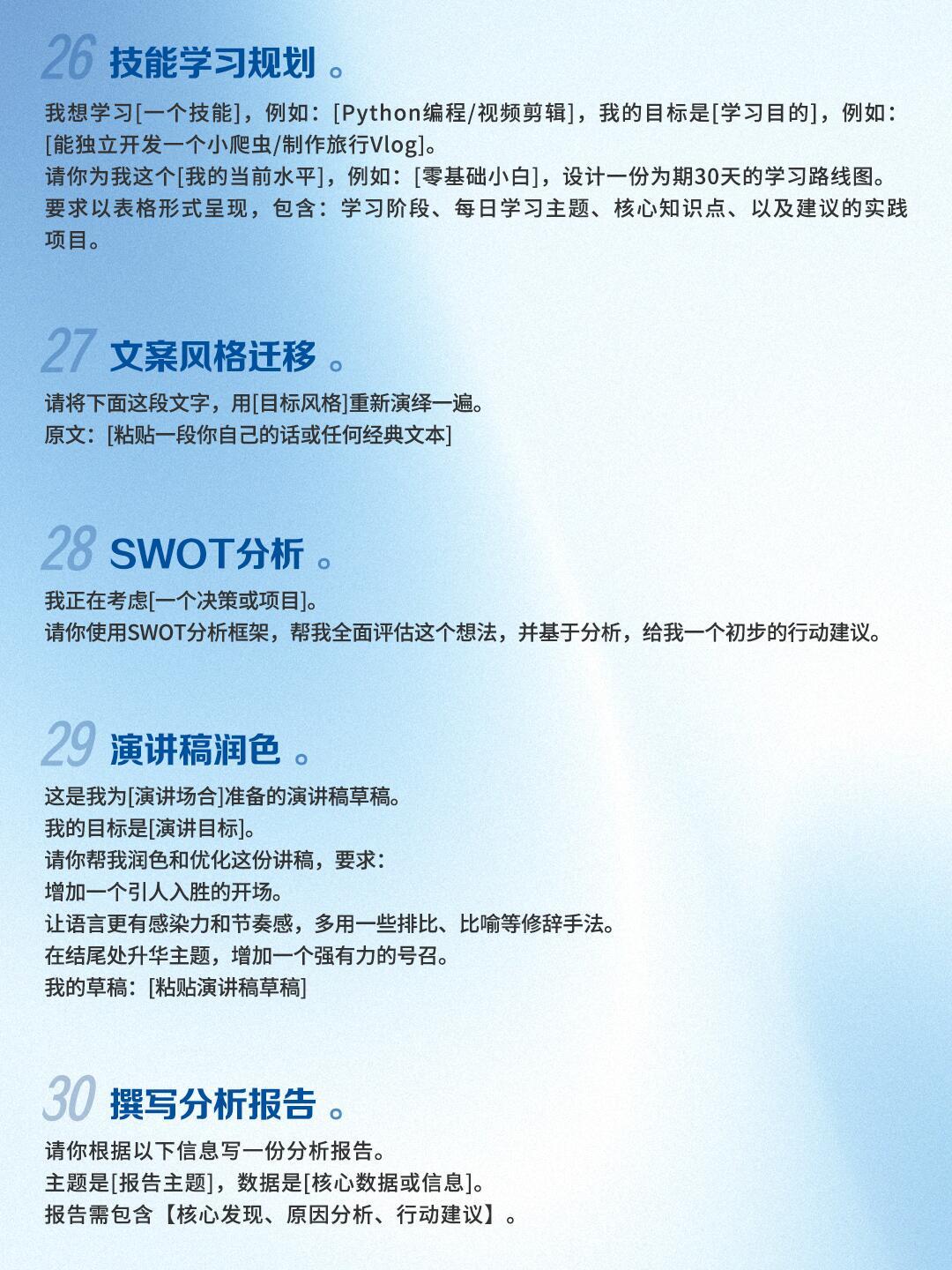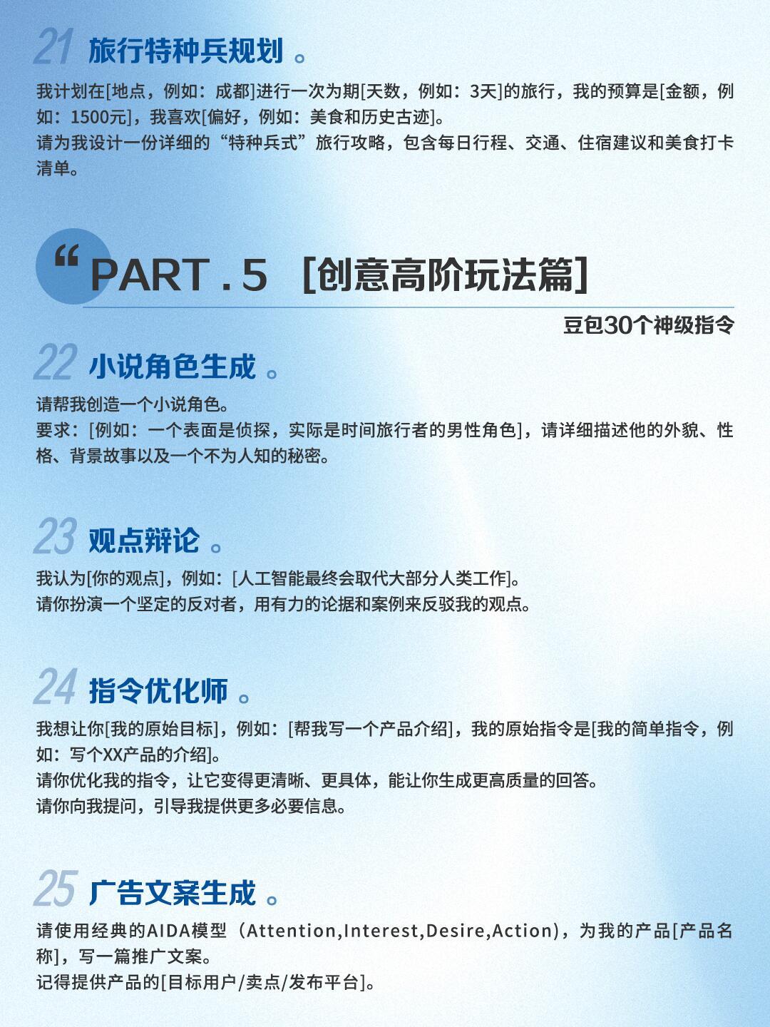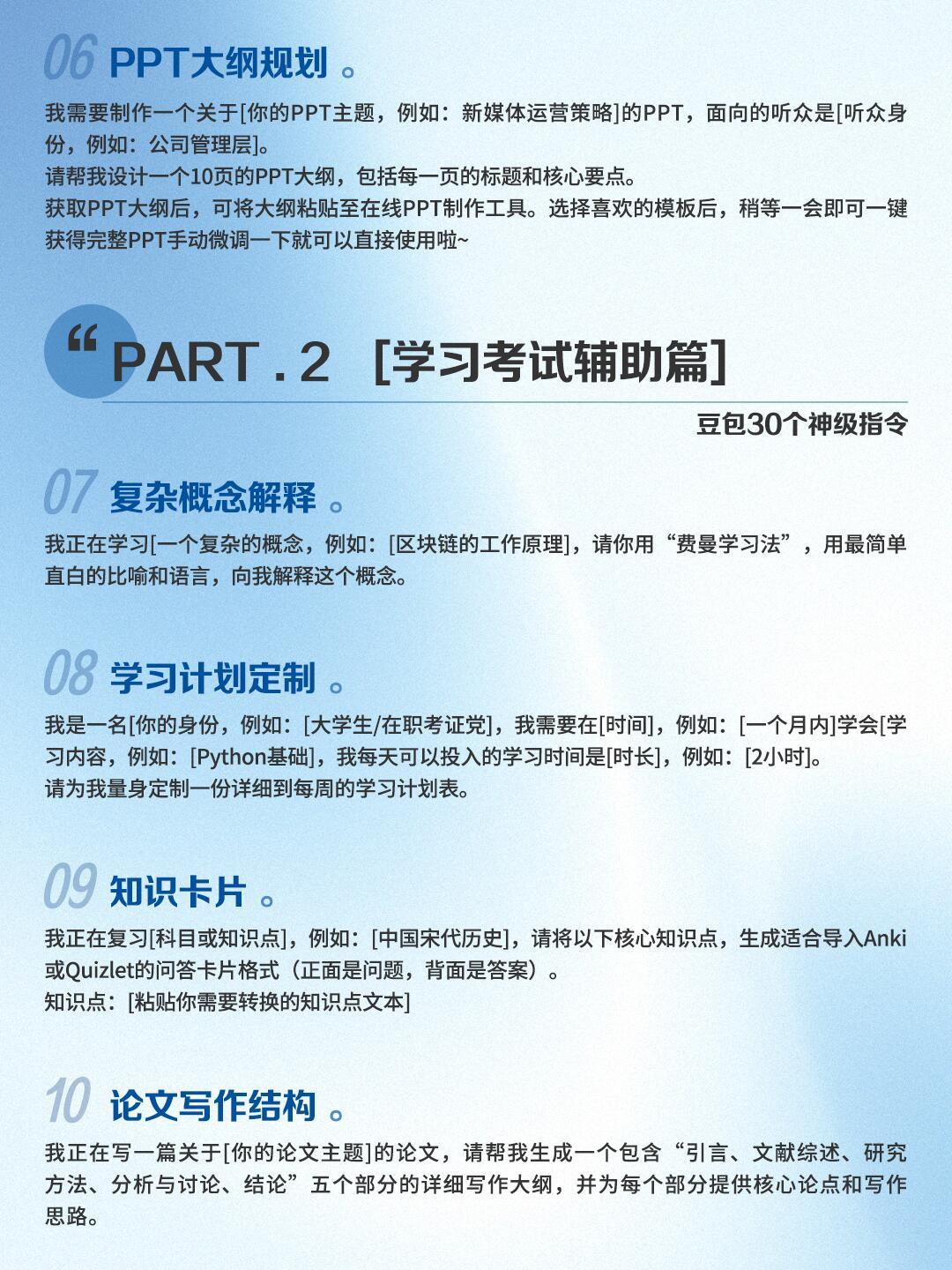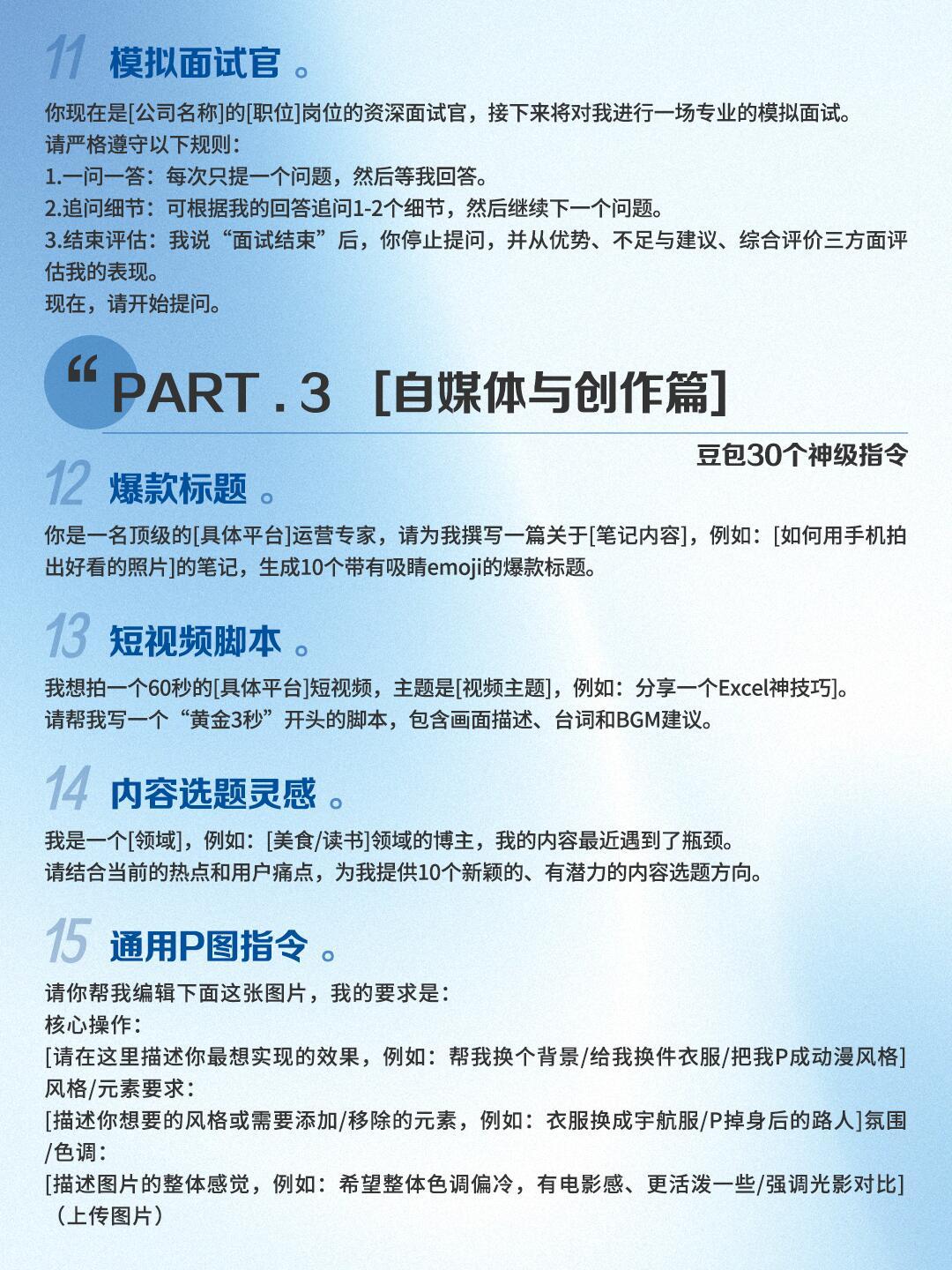 AI万能指令!30个场景大合集!谁还不会?!整整30个豆包快速指令,覆盖五大高频场景,不用费脑想话术,直接复制就能用!职场办公(周报、邮件、会议纪要全搞定)考试(计划、论文、知识点拆解)自媒体创作(标题、脚本、选题灵感)日常规划(送礼、旅行、健身餐)创意玩法(文案、角色、辩论)全场景适配!每个指令都给好了完整引导逻辑,不用自己琢磨怎么提问,直接填空就能用,省下来的时间摸鱼不香嘛!豆包 消极怠工