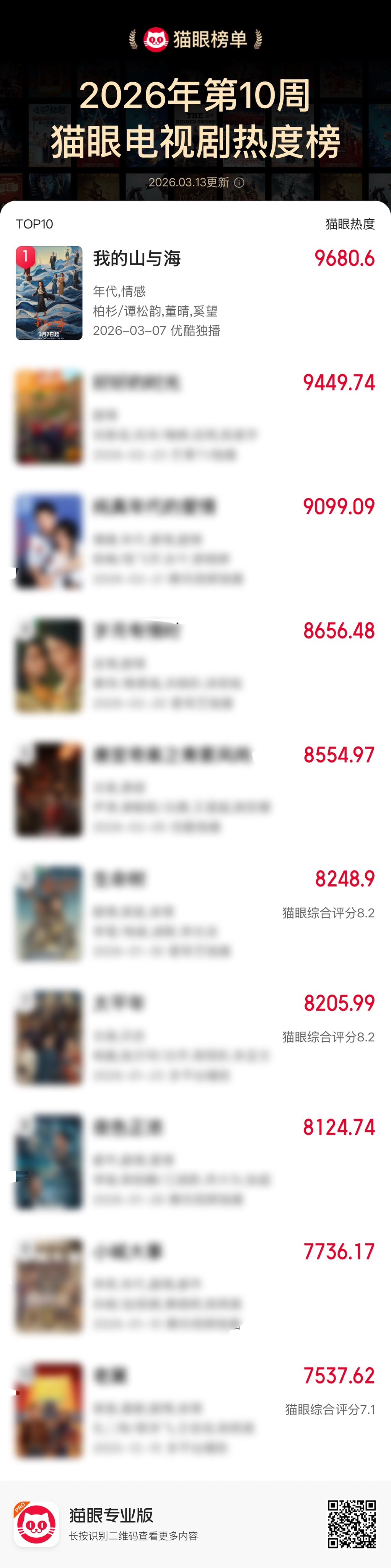 《我的山与海》持续领跑!猫眼电视剧热度、播放量双双TOP1,拿下猫眼2026年第10周电视剧热度榜TOP1。