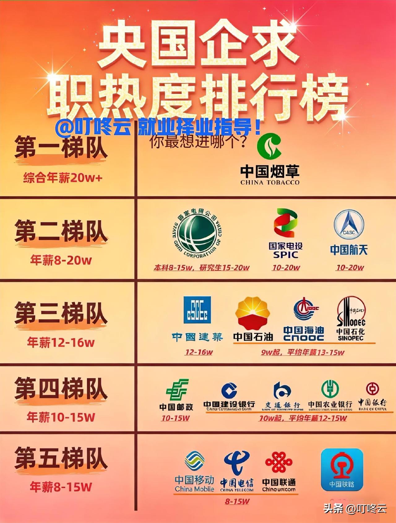 央企和国企分别都有哪些?热度榜出炉!2026年央国企求职热度榜揭秘!⭐央国企求职择业指导:梯次选岗,精准突围!良禽择木而栖,良才择主而侍!热门企业不一定适合,只有选择最合适自己的方向,才是最佳职业选择![点亮平安灯][点亮平安灯][烟花][烟花] @叮咚云 帮你解读重点和职业规划指导:📊数据洞察:据2025年校招数据,国家电网、中国烟草等第一梯队单位网申报名超114万人次,平均报录比达60:1,录取率不足2%;第二梯队国家电投、中国航天等岗位竞争比约30:1,而第五梯队运营商、铁路岗竞争比相对缓和,约10:1。薪资梯度与竞争强度正相关,第一梯队综合年薪20w+,第五梯队仅8-15w,呈现“高薪高竞争、稳岗适配性强”的就业规律。 💡择业建议:“良禽择木而栖,良士择职而仕”。应届生需结合自身竞争力选岗:电气、能源类专业可冲刺国家电网、三桶油等核心梯队,追求专业价值兑现;文科、管理类考生可瞄准银行、邮政等稳岗梯队,规避无效竞争。切勿盲目追捧头部,需以“专业匹配度+竞争适配性”为核心,锚定适合的薪资档位。 🚀行动指南:“长风破浪会有时,直挂云帆济沧海”。提前6个月备考行测与专业知识,针对性补齐简历关键词;关注春招扩招窗口,优先选择与自身学历、专业契合的梯队岗位。央国企求职非“一锤定音”,精准定位+扎实备考,方能在百万竞争中脱颖而出,斩获理想offer。[礼物][礼物][爆竹][爆竹] 欢迎关注@叮咚云 就业择业指导,帮你快速拿到央国企offer!将优先为粉丝职业规划指导,为你定制最适合的就业择业方案!欢迎留言交流讨论。[来看我][来看我] 免责声明:图片来自网络,仅供参考 铁饭碗岗位推荐 央企铁饭碗真相 应届生就业机会央企铁饭碗真相 央国企求职招聘 央国企求职招聘