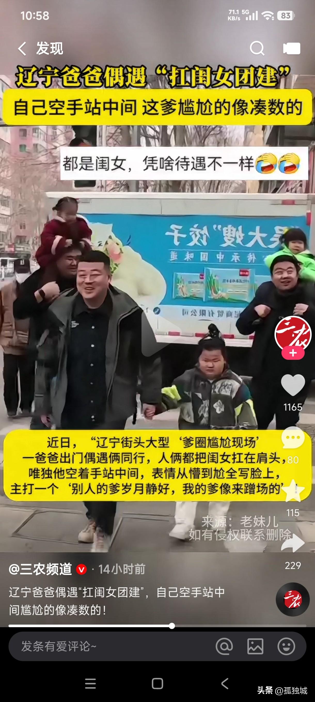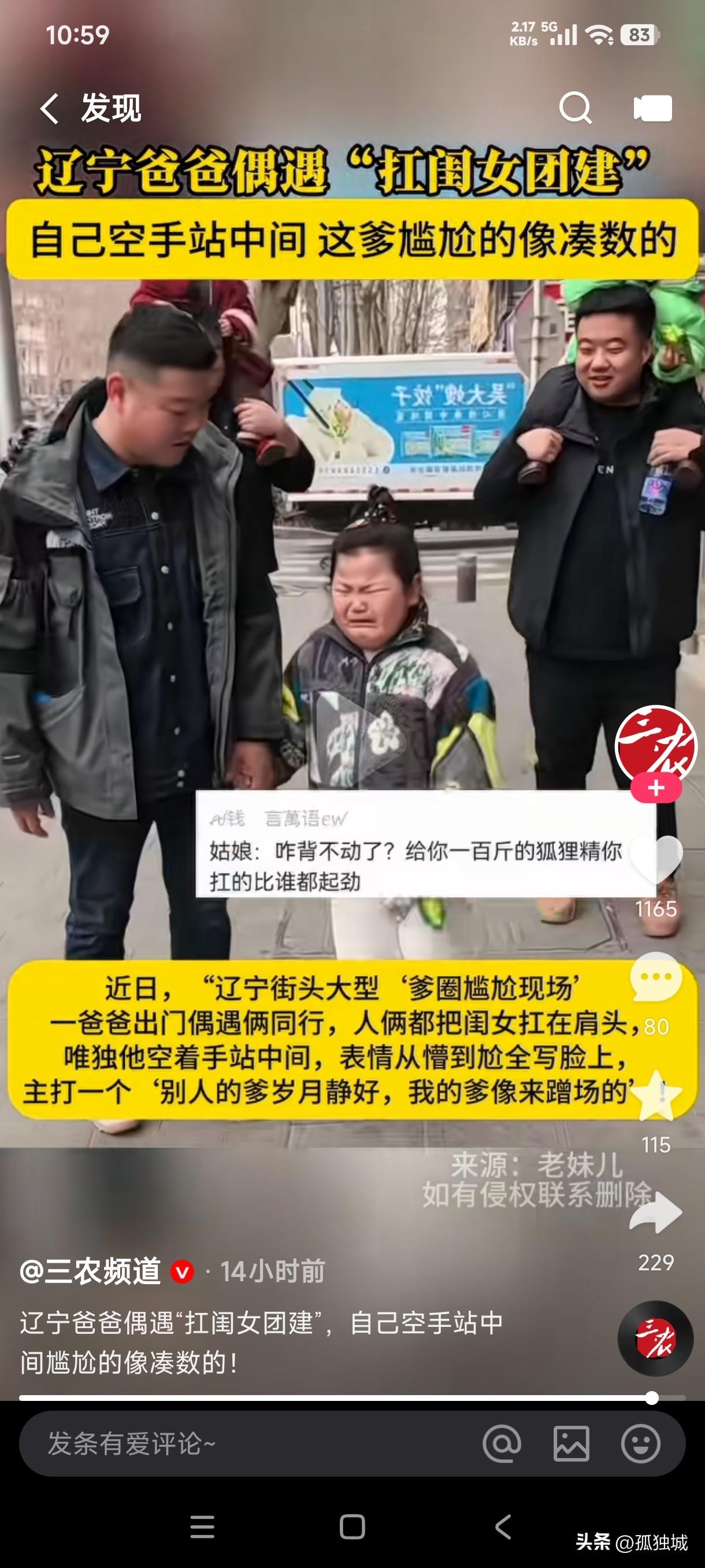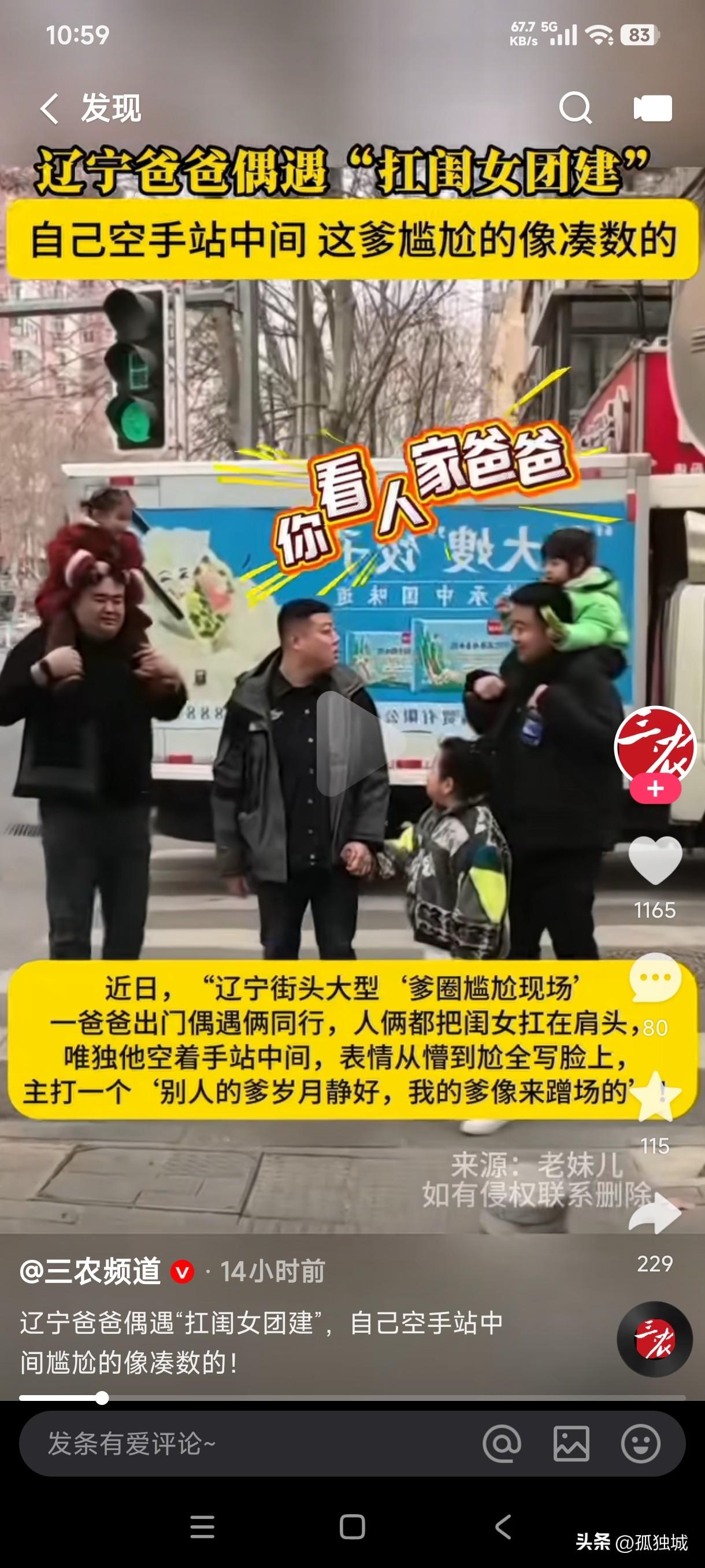 辽宁爸爸出门偶遇同行扛闺女团建,人家俩都将闺女扛肩上,唯独他父女俩手牵手站中间,从懵逼到尴尬全写脸上,这千金小姐和千斤小姐还是有区别的不是吗? 千金大小姐和千斤大小姐本来就不是一个级别的不是吗?这闺女看到别人的爹都扛着闺女,唯独他爹不扛她,这不是让自己在两个妹妹面前丢脸吗?这样的爹到底还能要吗?同样都是闺女,你看看这待遇简直是天差地别,闺女还要求让她爹背她,没想到她爹却说背不动,没想到闺女却说给你一百斤的腰精你扛的比谁都起劲,唯独扛不起自己的闺女? 别人的爹岁月静好,自己的爹就是凑数的,这是不是太伤闺女的心了?