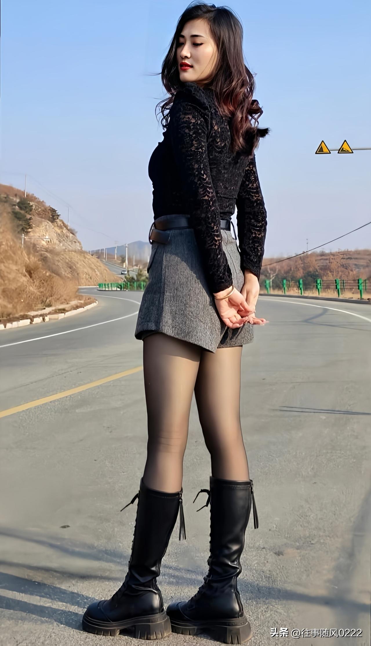都市酷girl穿搭,黑色西装裙搭配高筒靴,时尚又帅气
