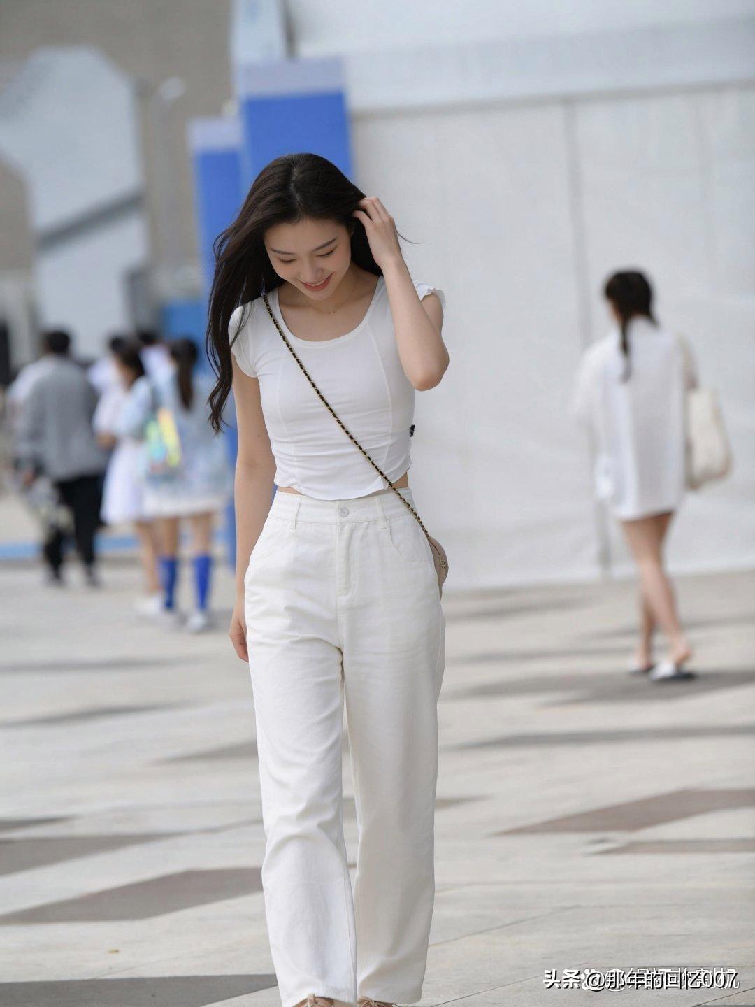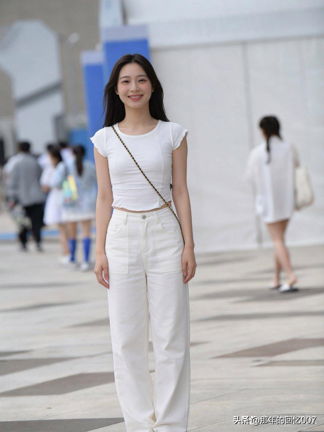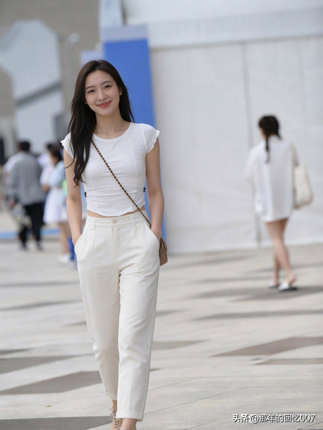 清新夏日穿搭,白色短袖搭配高腰裤,轻松自在!