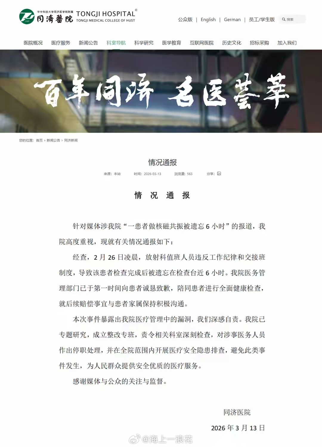 医院通报患者被遗忘6小时处理结果这家同济医院应该和上海同济医院均属于大医院吧,发生这样的事,确实太不可思议。