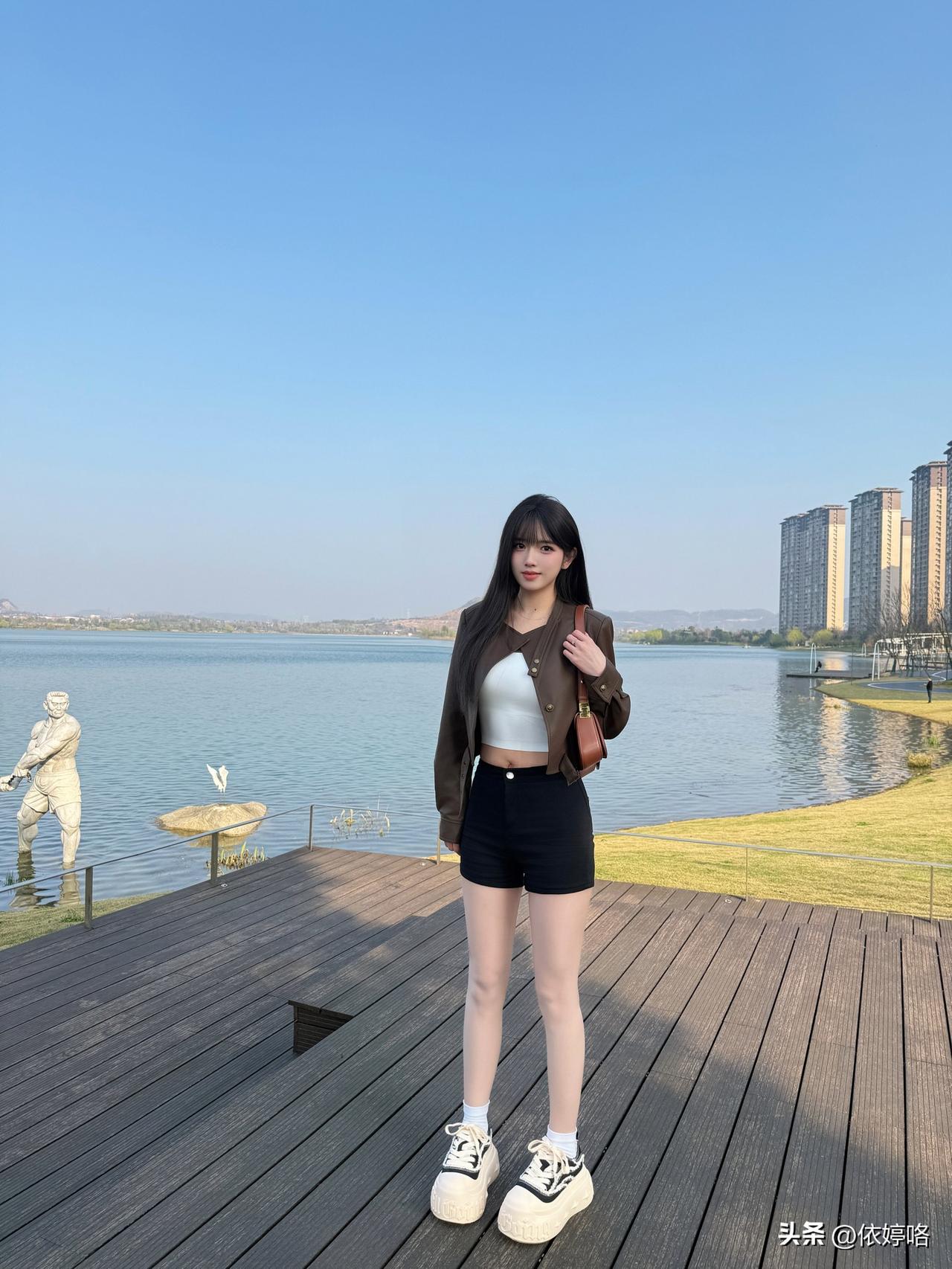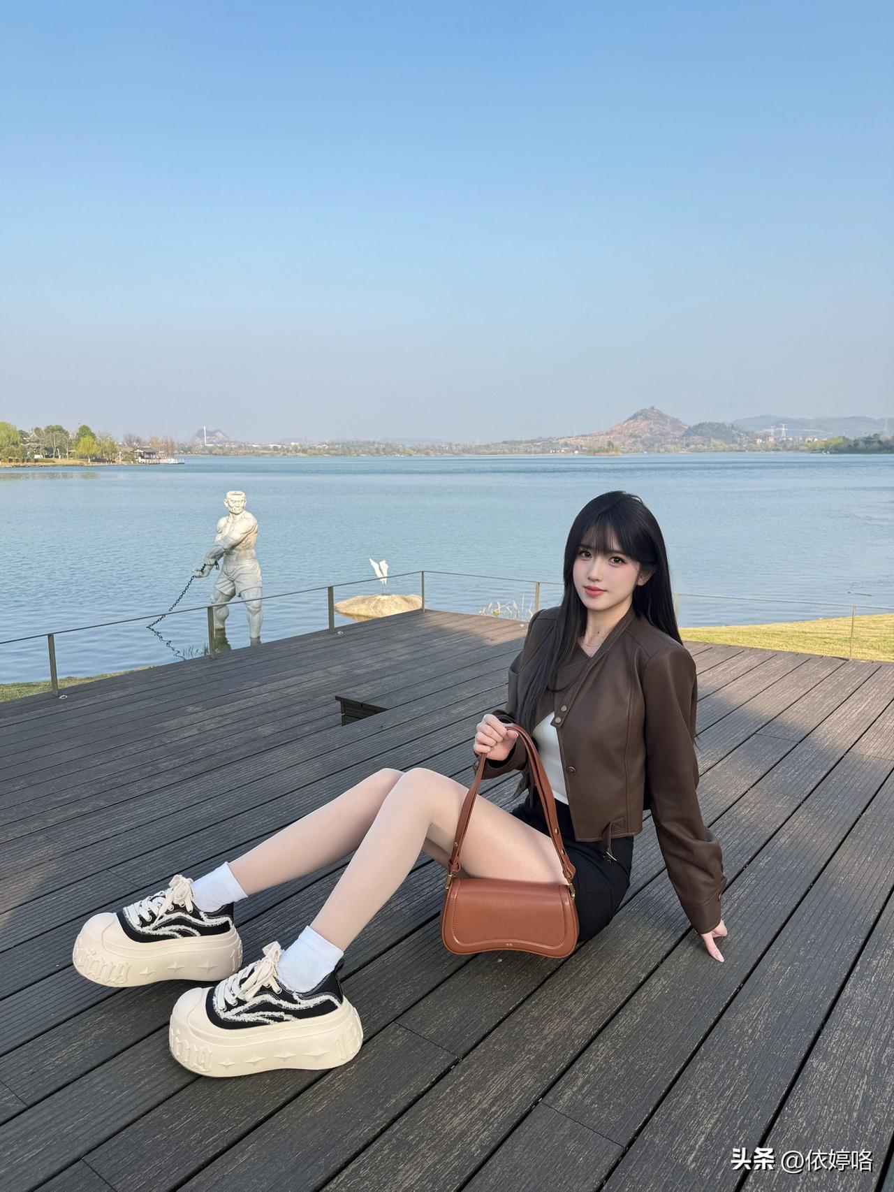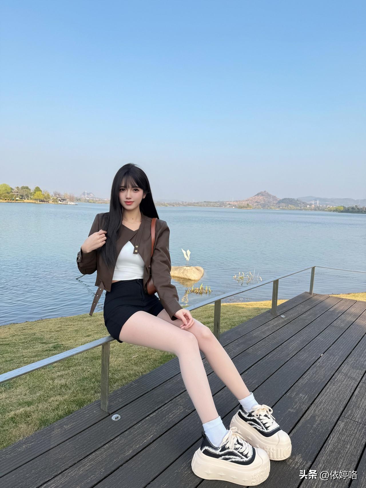 宝子们!在湖边随手拍都被追问链接的穿搭来啦~ 这件黑色字母T绝了!oversiz