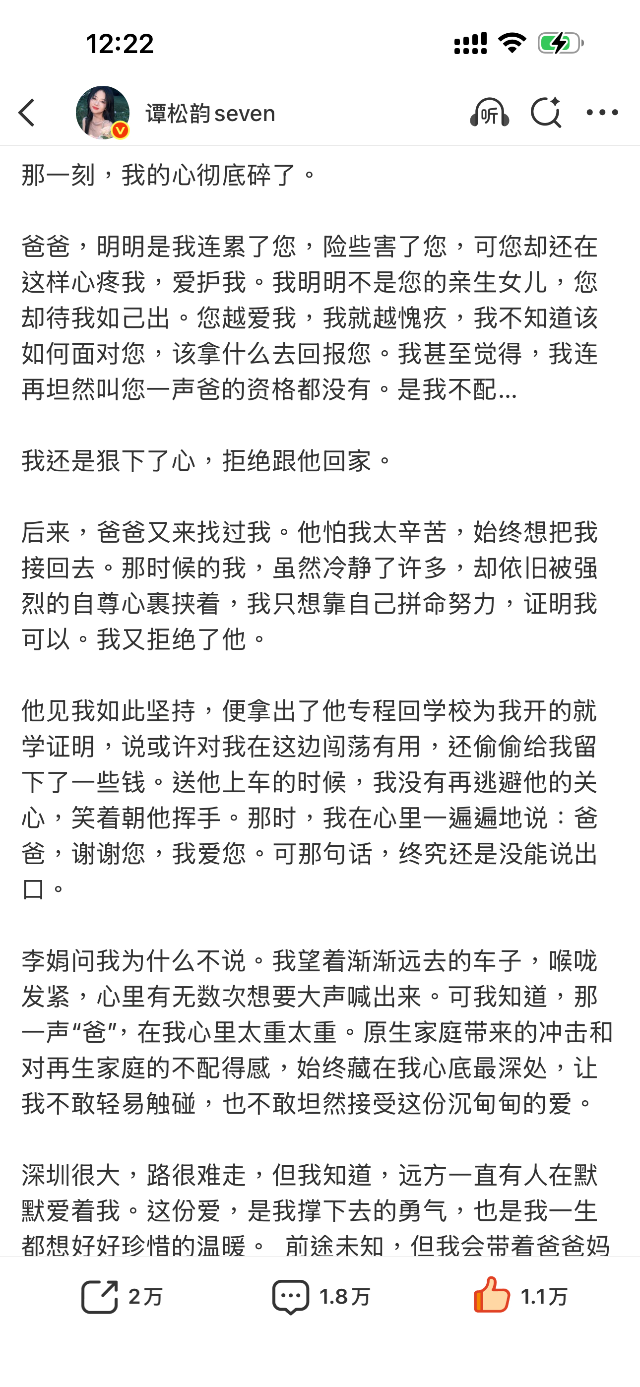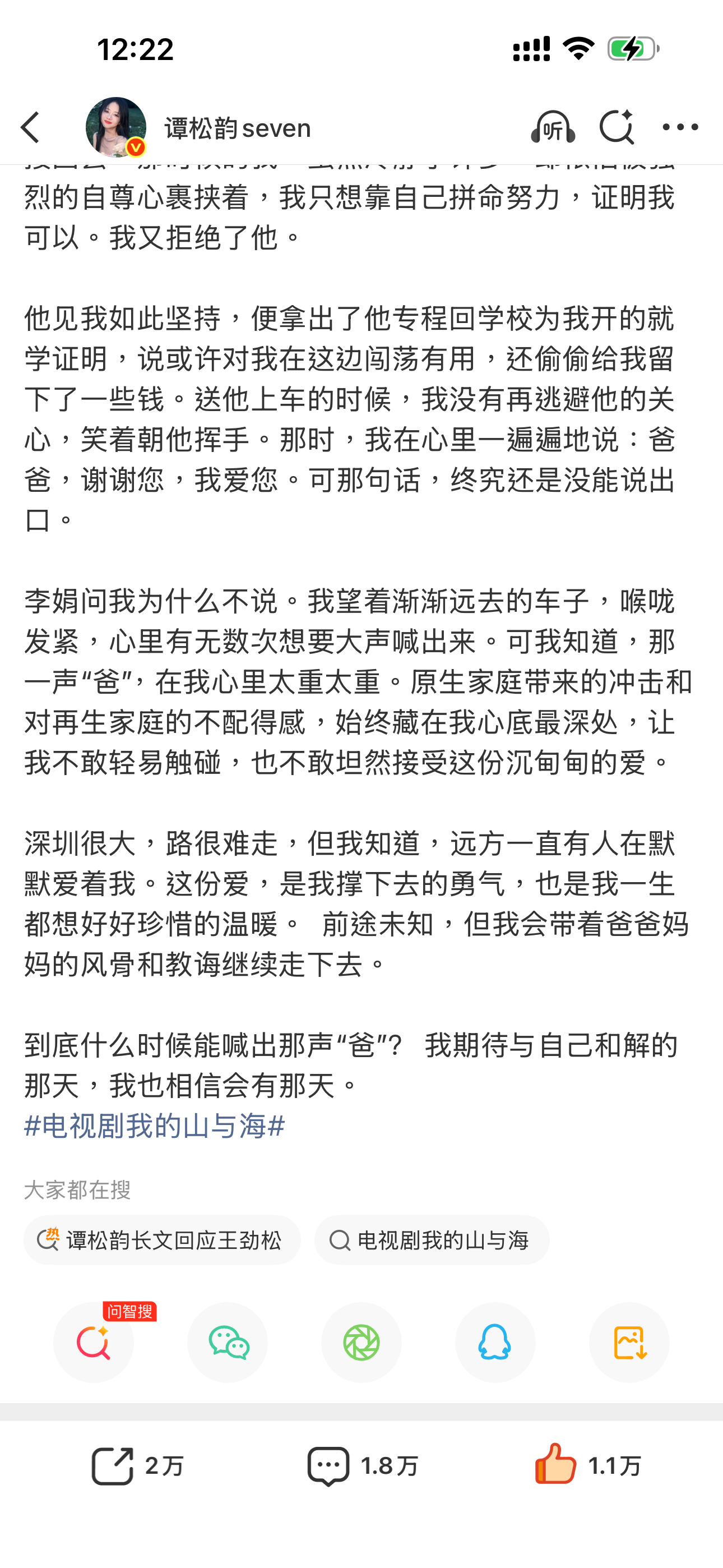 她把这种矛盾讲得特别真,没有煽情,也没有洗白,就是承认伤会让人退一步。能把角色的情绪在戏外继续讲清楚,我真的会更佩服她。谭松韵长文回应王劲松