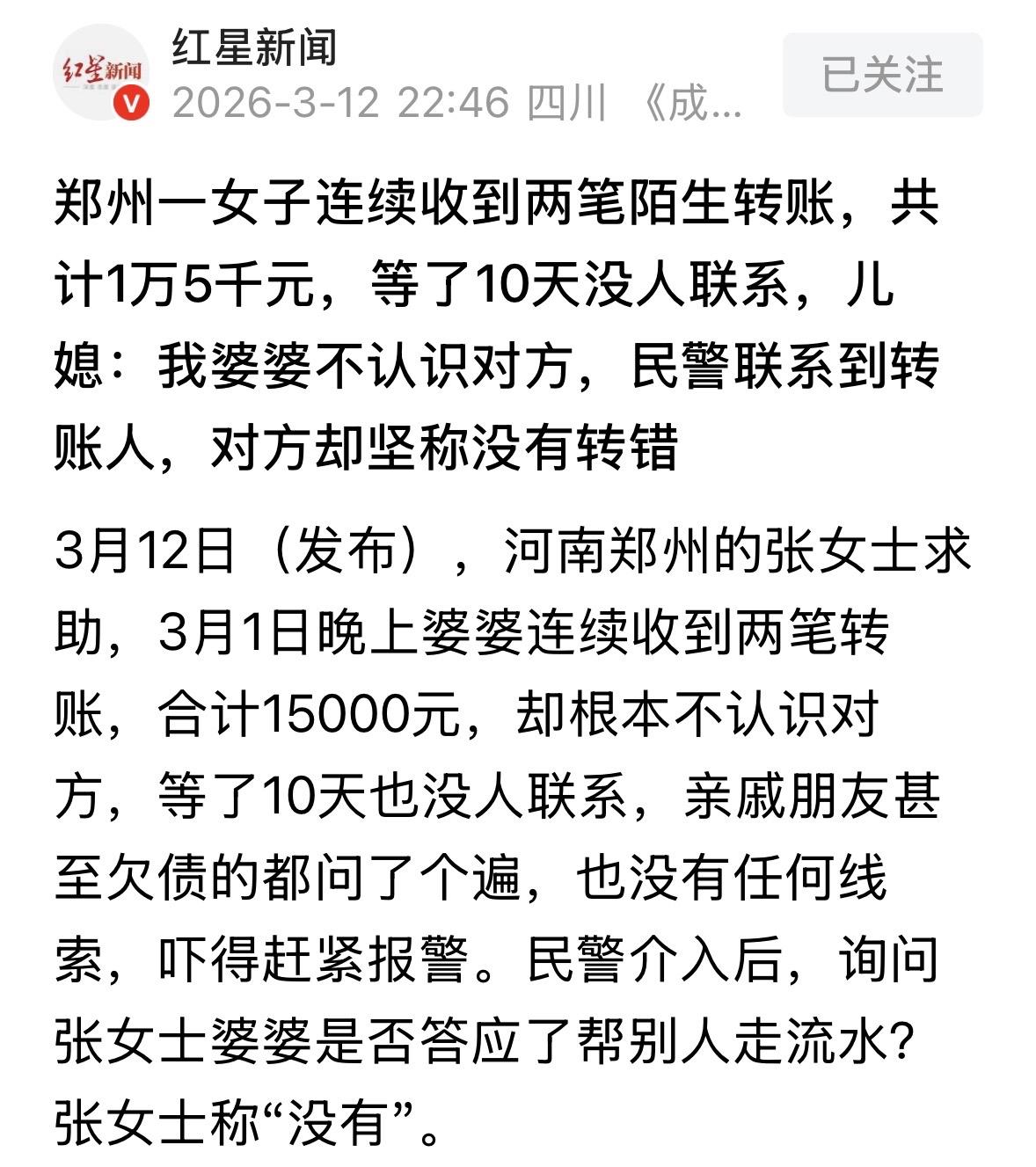 河南郑州,一老人卡里莫名转进了两笔钱,总共15000块,儿媳觉得蹊跷,让老人不要动这笔钱,接着把亲戚和欠债的人问了个遍,但大家都否认说没转过,等了10天后,依旧没人来认领这笔钱,儿媳心里十分不安,直接报了警,民警联系了转账人,对方却坚称自己没有转错,可儿媳表示他们根本不认识这个转账人,当中一定有问题…… 3月1号晚上,张女士家里乱成了一锅粥。 原因无他,婆婆的手机突然弹出通知,拿起来一看,银行卡里莫名其妙进了两笔钱,加起来整整15000块。 这可不是小数目。老太太连忙把手机递给儿媳妇张女士说:闺女,你快看看,是不是银行系统坏了?还是谁给转错了? 张女士接过手机,也是莫名其妙。 她作为年轻人,警惕性比较高,第一反应就是,这钱来路不正。 她赶紧帮婆婆回忆,最近有没有卖东西?有没有人借钱?甚至连以前欠婆婆钱的老赖都想了一遍。 结果问了一圈,亲戚朋友、左邻右舍,没一个说转过钱的。 这钱就像天上掉下来的馅饼,但张女士只觉得是个烫手山芋。 张女士跟婆婆商量,说咱不能贪这个便宜,万一是人家救命的钱呢? 于是,这一家子也没轻举妄动,而是等人来要钱。这一等就是10天,手机安安静静,既没人打电话来要钱,也没见警察上门。 这10天里,老太太觉都没睡踏实,总觉得这钱在卡里不安全,生怕哪天突然又没了,或者惹上什么官司。 张女士看着婆婆焦虑的样子,说算了!不等了,报警!让警察查清楚,咱心里才踏实。 民警到了之后,第一句话就问得很犀利:老人家,您是不是帮别人走流水了?就是把银行卡借给别人用? 绝对没有!张女士替婆婆抢答,说我妈连智能手机都用不利索,哪懂什么走流水,平时买菜都是给现金。 民警点了点头,开始查这笔钱的来源。 通过银行系统,很快联系上了那个转账的“神秘人”。 本以为这就是个简单的乌龙,结果对方的回答让所有人都懵了。 电话那头,转账的人一口咬定,说我没转错,就是转给她的。 这下张女士更迷糊了,甚至有点生气。她们就不认识,也没联系过这个人,结果对方非说没转错,这不是糊弄人吗?难道是诈骗新套路? 民警也皱起了眉头,这事儿确实透着蹊跷。既然不是误操作,那这笔巨额资金的流向就值得警惕了。 是不是涉及洗钱?还是某种新型的诈骗陷阱? 民警当场告诫张女士一家:千万别私自把钱转回去,也别动这笔钱,我们继续查。 目前,这事儿还在警方的跟进中。但这件事也给所有人提了个醒:天上不会掉馅饼,只会掉陷阱。 现在的骗子花样多,有时候故意给你转钱,然后谎称转错了,让你退还一部分或者全部,结果你一转,发现自己的钱被卷走了,或者卷入了洗钱案。 就像办案民警说的,遇到这种飞来横财,别高兴太早,先冷静下来。第一时间找银行核实,或者直接报警。 搞不清楚状况之前,这笔钱就在账上躺着,哪怕一分钱也别动,这才是保护自己钱包和人身安全的最好办法。 根据《反电信网络诈骗法》第31条第1款:任何单位和个人不得非法买卖、出租、出借电话卡、物联网卡、电信线路、短信端口、银行账户、支付账户、互联网账号等,不得提供实名核验帮助;不得假冒他人身份或者虚构代理关系开立上述卡、账户、账号等。 张女士婆婆虽没有主动出借账户,但收到不明大额转账且对方否认“转错”,高度疑似涉及“跑分”洗钱或诈骗诱饵。 依据这个法条,银行及公安机关有权对监测识别的涉诈异常账户采取重新核验身份、限制功能等措施。 张女士一家没有贪便宜并及时报警的做法完全正确,避免了因帮转回而沦为电诈工具人的法律风险。 对此,你怎么看? 关注@运良说法 学法律知识不迷路