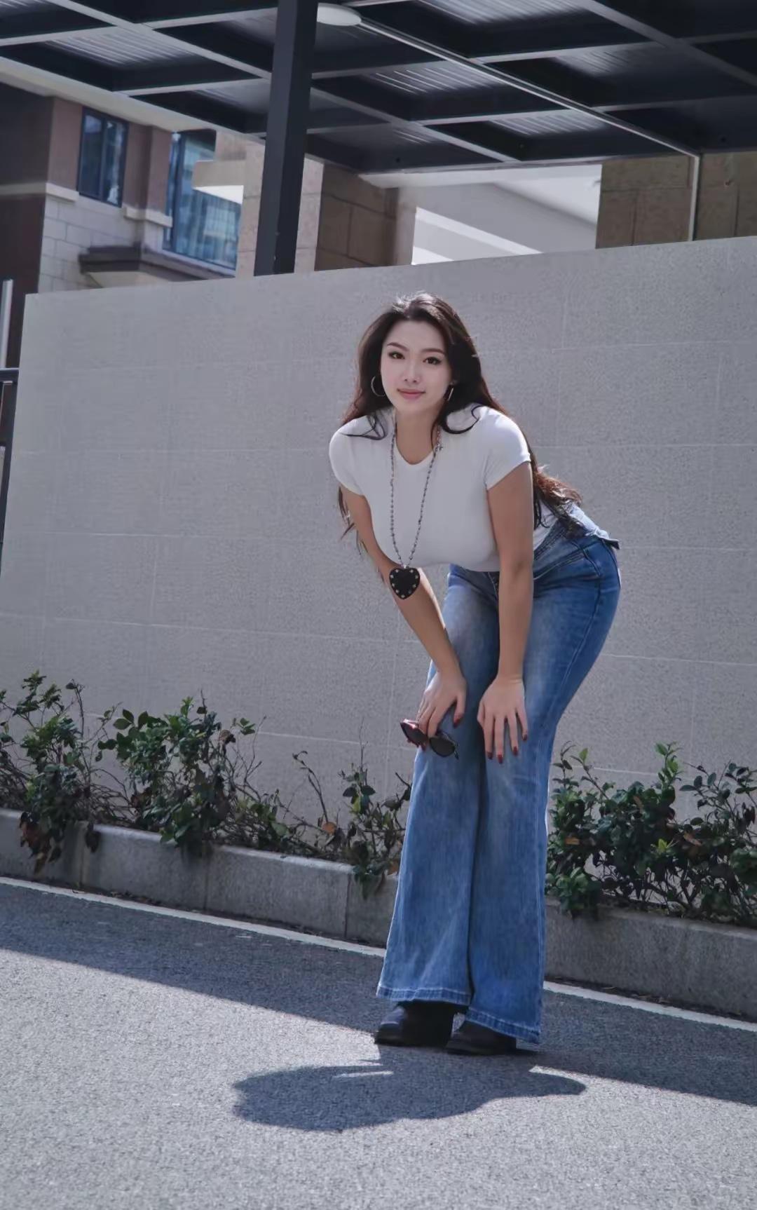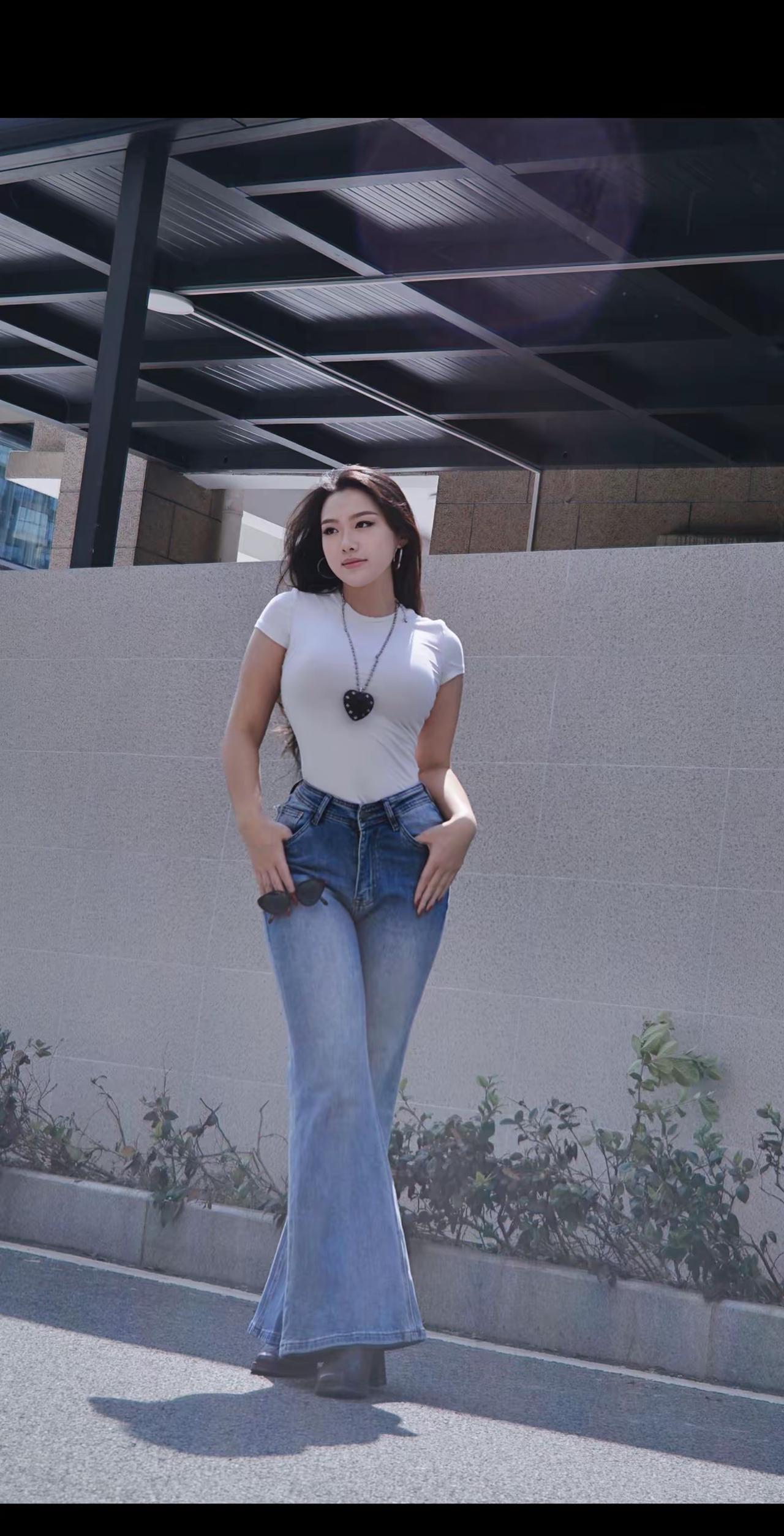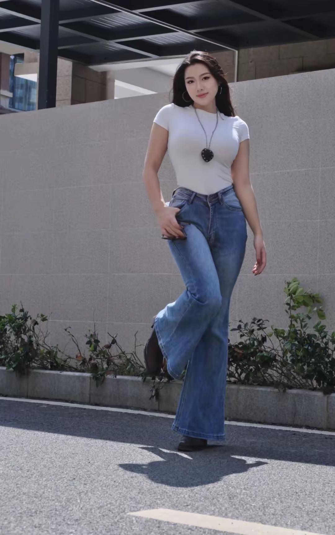 🌿 场景穿搭解析:都市休闲辣妹风 这套穿搭非常适合春日街拍、城市漫步、轻户外探店等场景,是经典又显身材的基础款组合: ✨ 核心单品 • 上衣:白色修身短袖T恤 选择重磅不贴肉的版型,既能勾勒曲线又不会过分暴露,干净清爽,适配各种下装。 • 下装:蓝色高腰微喇牛仔裤 高腰设计优化腰臀比,微喇裤型从膝盖处自然散开,完美修饰腿型,遮肉显瘦还能拉长腿部线条,是梨形身材的友好选择。 • 配饰: ◦ 黑色爱心吊坠长款项链:拉长颈部线条,增加穿搭层次感。 ◦ 大圈耳环:修饰脸型,增添复古辣妹感。 ◦ 墨镜:既是实用单品,也是凹造型神器。 • 鞋履:黑色粗跟短靴 粗跟设计兼顾舒适与高度,和微喇裤搭配,让整体比例更协调,走路也更稳。 🌟 风格亮点 • 经典永不过时:白T+牛仔裤是永远不会出错的王炸组合,简约又高级。 • 显身材天花板:修身T恤+高腰微喇裤,完美展现腰臀比和腿部线条,辣而不俗。 • 场景兼容性强:日常出街、约会、拍照都很合适,轻松切换休闲与精致感。 💡 搭配延伸 • 想更休闲:换一双小白鞋,搭配棒球帽,秒变美式复古风。 • 想更精致:外搭一件短款牛仔外套或小西装,通勤也能穿。 • 想更个性:换做旧色牛仔裤,搭配金属感配饰,街头感拉满。 牛仔裤 简约气质的穿搭