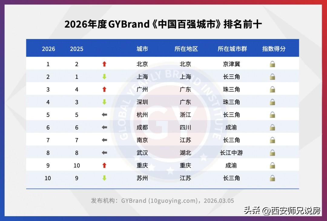 中国百强城市名单公布,除了北上广深四个特大城市外,杭州、成都、南京、武汉、重庆、苏州这六个城市分别排在5到10名。百强市排名