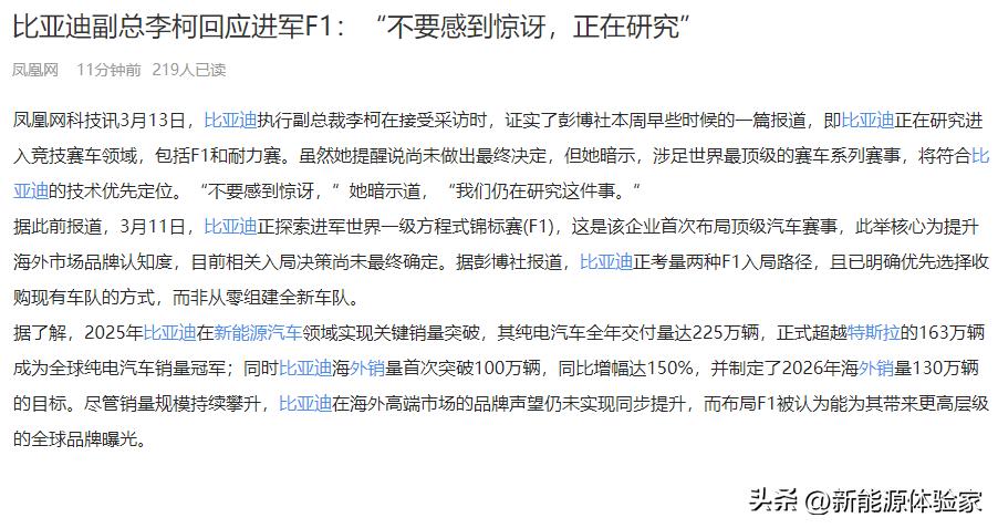 比亚迪副总李柯亲自放话——正在研究进军F1和耐力赛! 全球纯电销量冠军要踩上F1赛道了? 不搞从零组建,优先收购现有车队,效率拉满! 2025年纯电卖了225万辆,干翻特斯拉成全球第一,海外销量破100万,现在就差高端品牌声量了! 进F1=直接把技术牌甩到全世界脸上! 谁还记得当年奥迪、保时捷进F1的轰动?现在轮到中国品牌了! 你们觉得比亚迪要是真进了,能拿第几?会不会直接改写F1的能源格局?