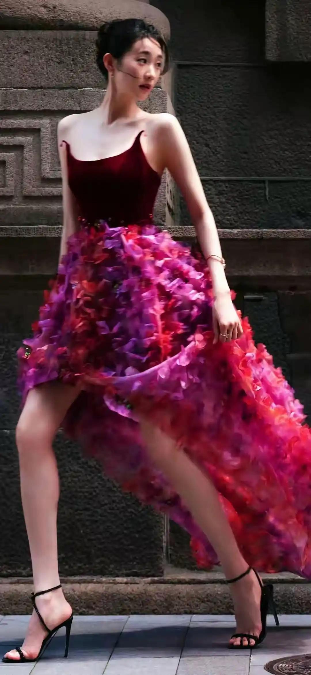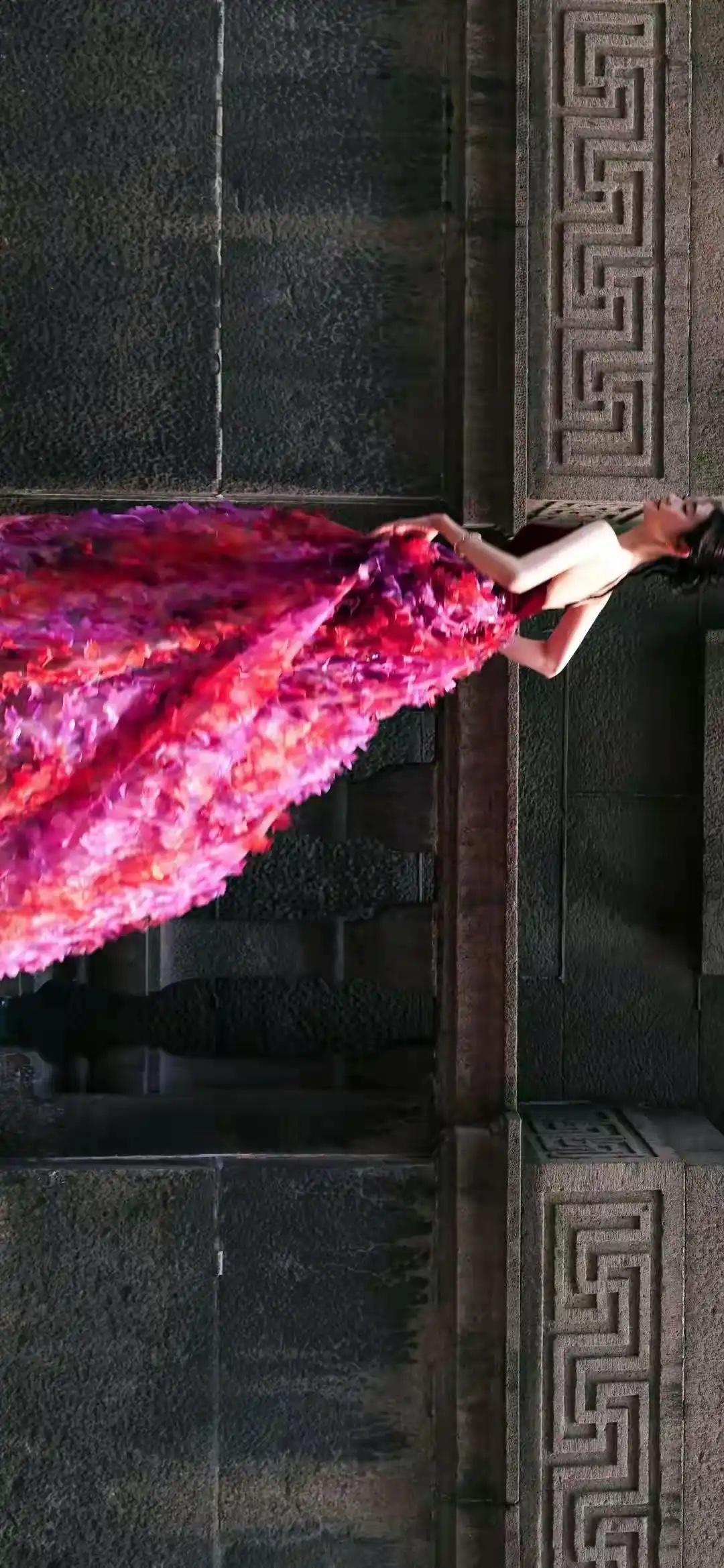 你觉得幸福应该是什么样的惊艳的红色裙摆,优雅地舞动在古风建筑前,仿佛穿越时空的精