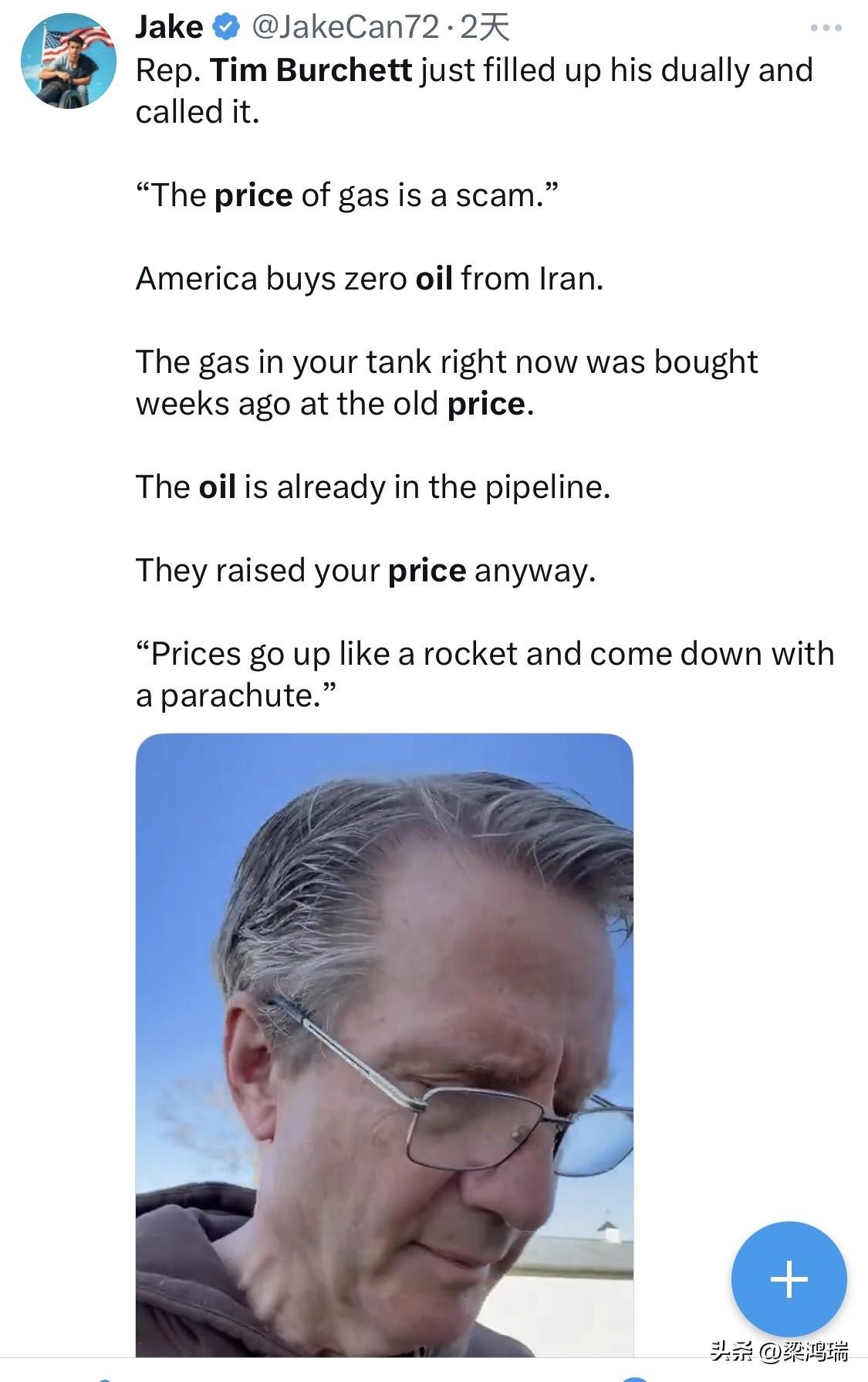 油价又涨了。 怪伊朗? 田纳西州国会议员蒂姆·伯切特 (Tim Burchett) 抛出一个事实: 美国从伊朗进口多少石油? 零。 一滴都没有。 那油价为什么涨? 他说,因为石油公司决定利用这个局势,狠赚一笔。 纯粹是贪婪。 一个简单的逻辑漏洞: 海外一出事,油价立刻飞涨。 可加油站储油罐里的汽油,是几个月前就采购、炼好的。 当时的价格,根本没那么高。 成本没变,售价却涨了。 这钱进了谁的口袋? 他形容油价: 涨起来像火箭,一飞冲天。 跌下来像降落伞,慢悠悠,还永远回不到原位。 这套剧本,美国人看腻了。 每次国际局势紧张,普通人的钱包就要被收割一次。 这到底是市场经济,还是合法的抢劫?