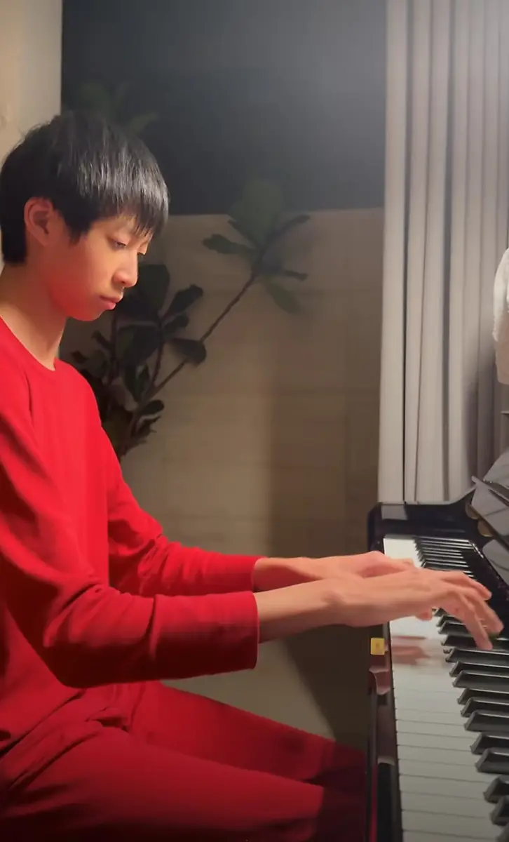 姚晨儿子穿红居家服弹钢琴 神情专注尽显少年沉稳帅气