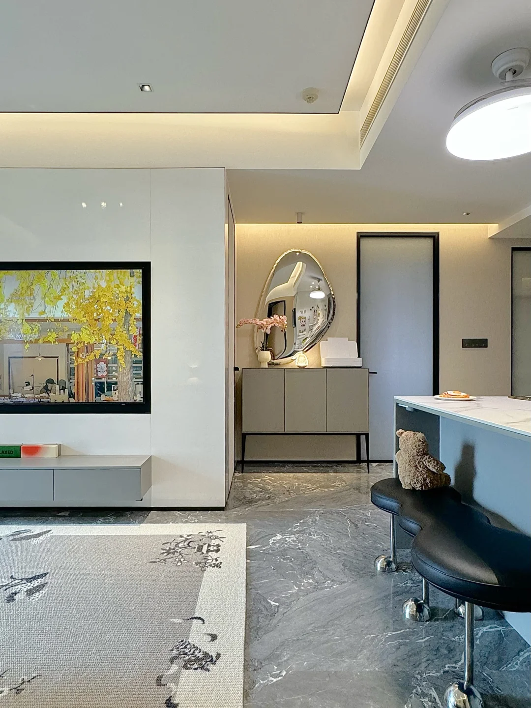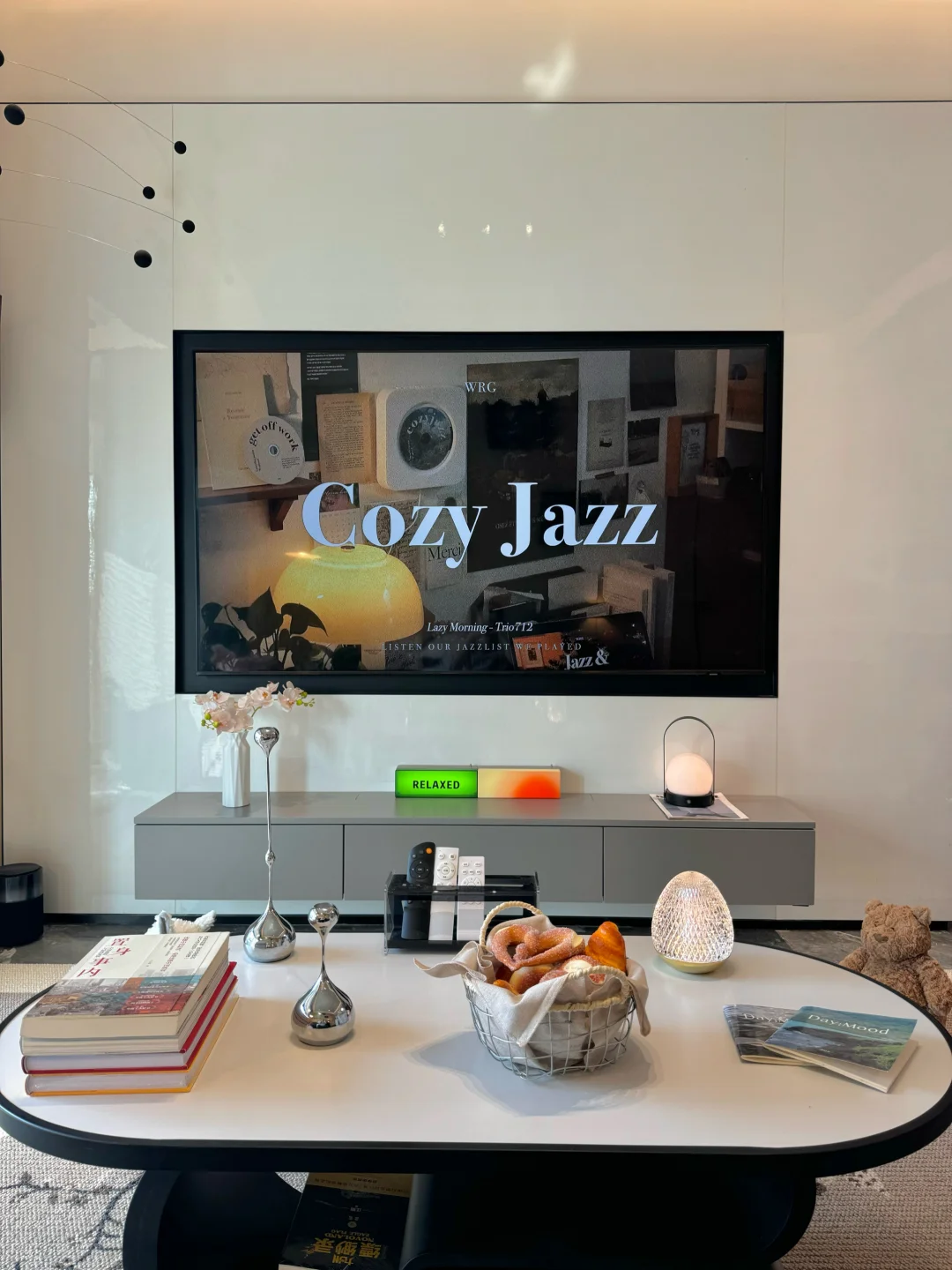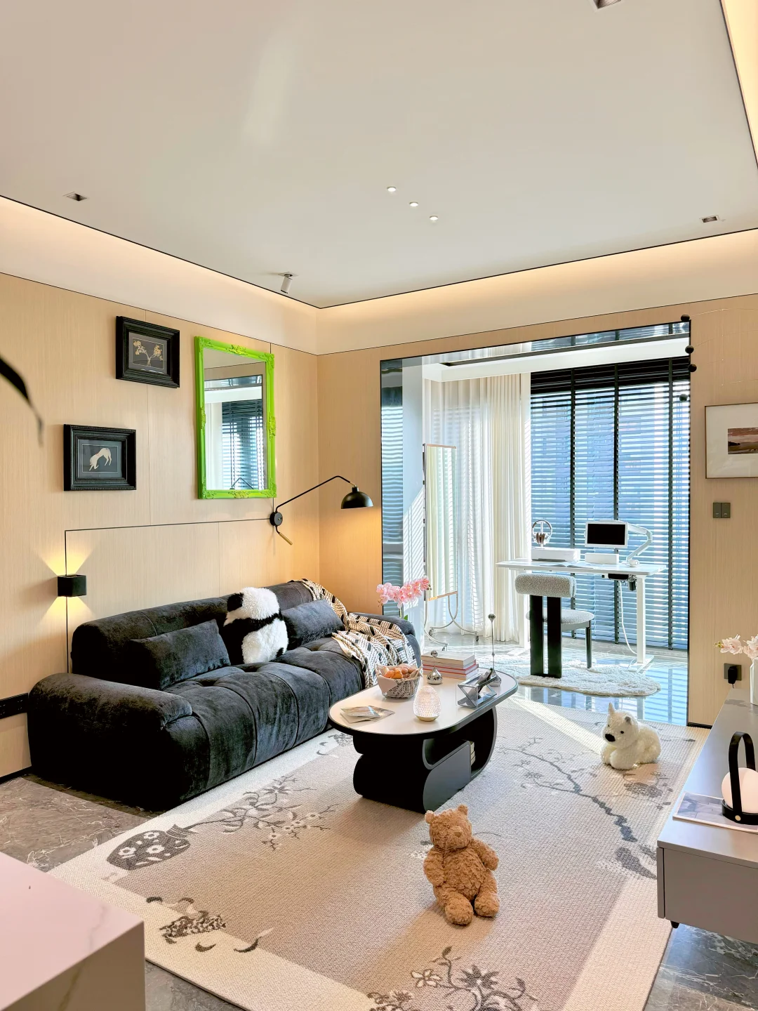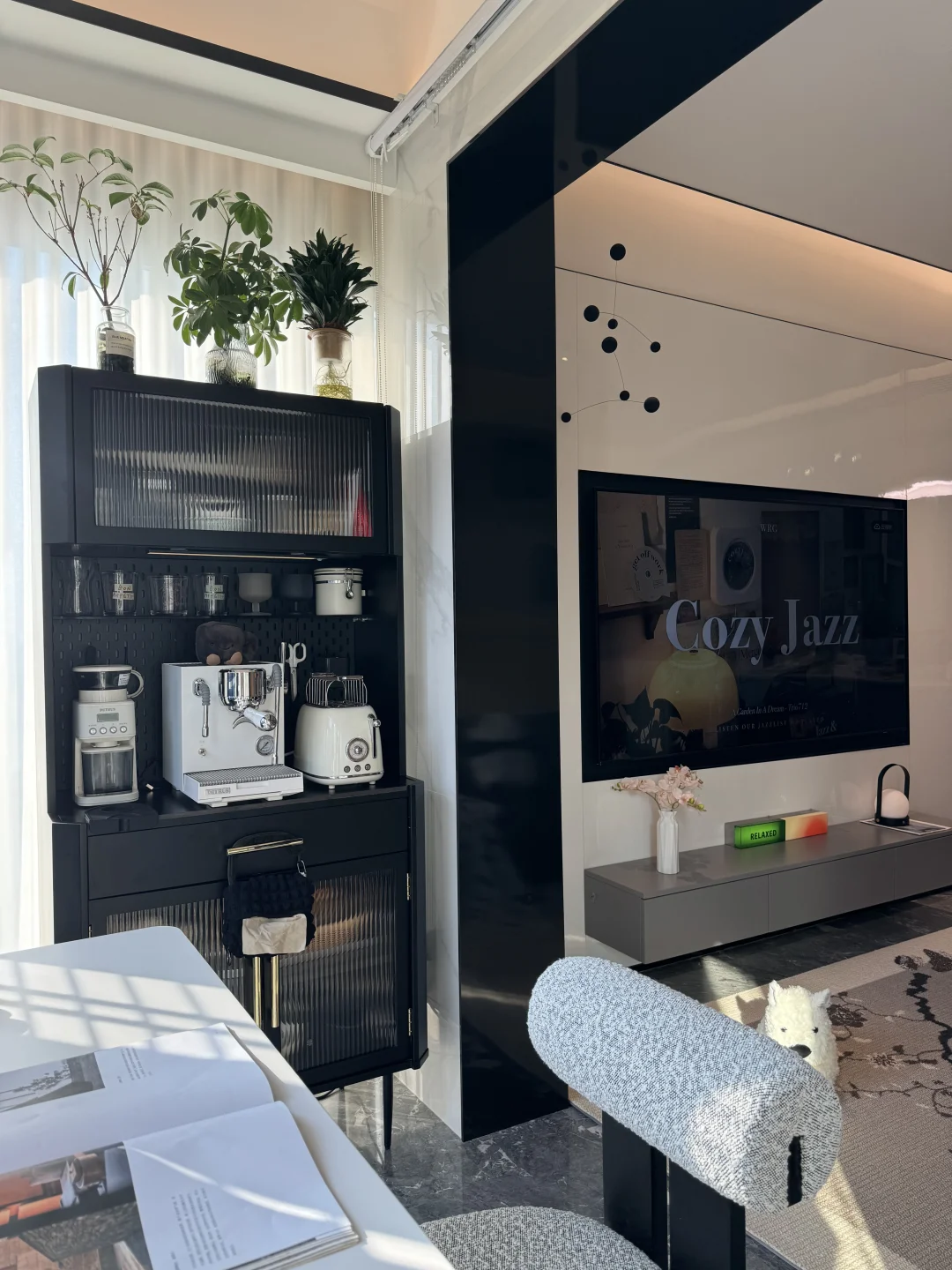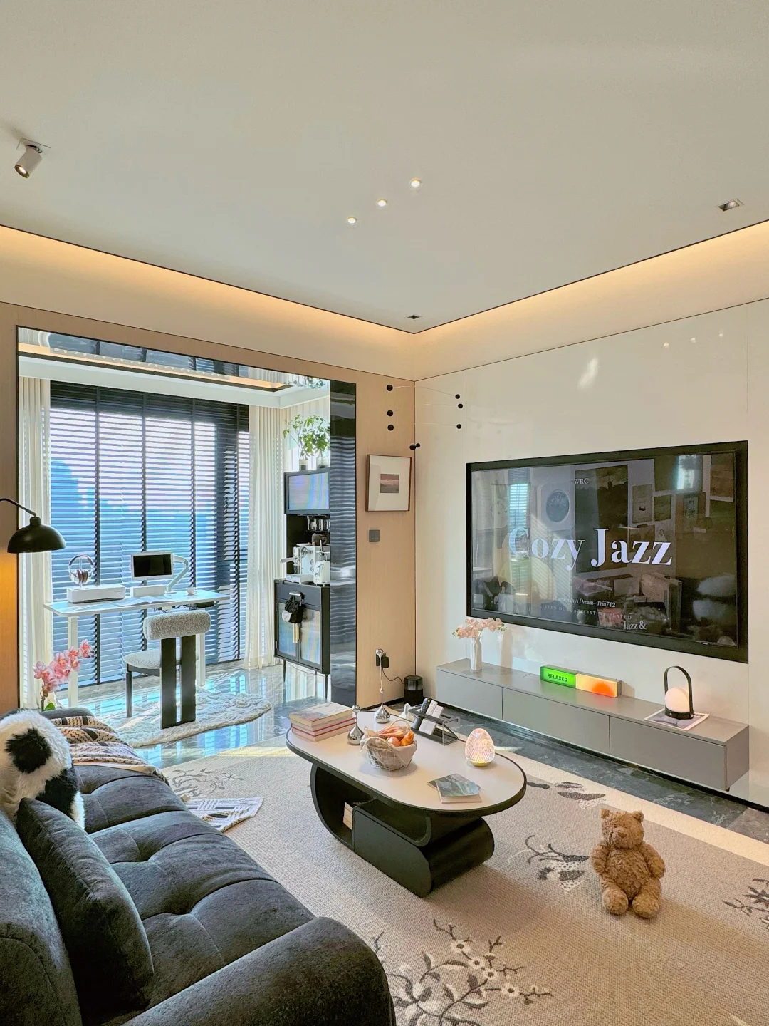 客厅我直接放弃了电视背景墙,电视内嵌+悬空电视柜,视觉更显大;阳台封窗后改成开放式书房+咖啡角,采光绝了。