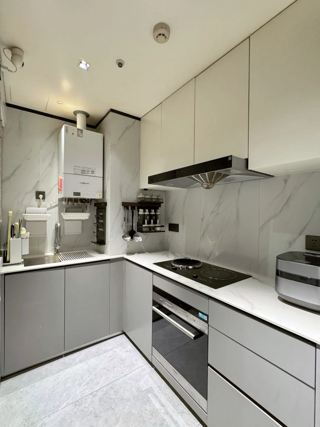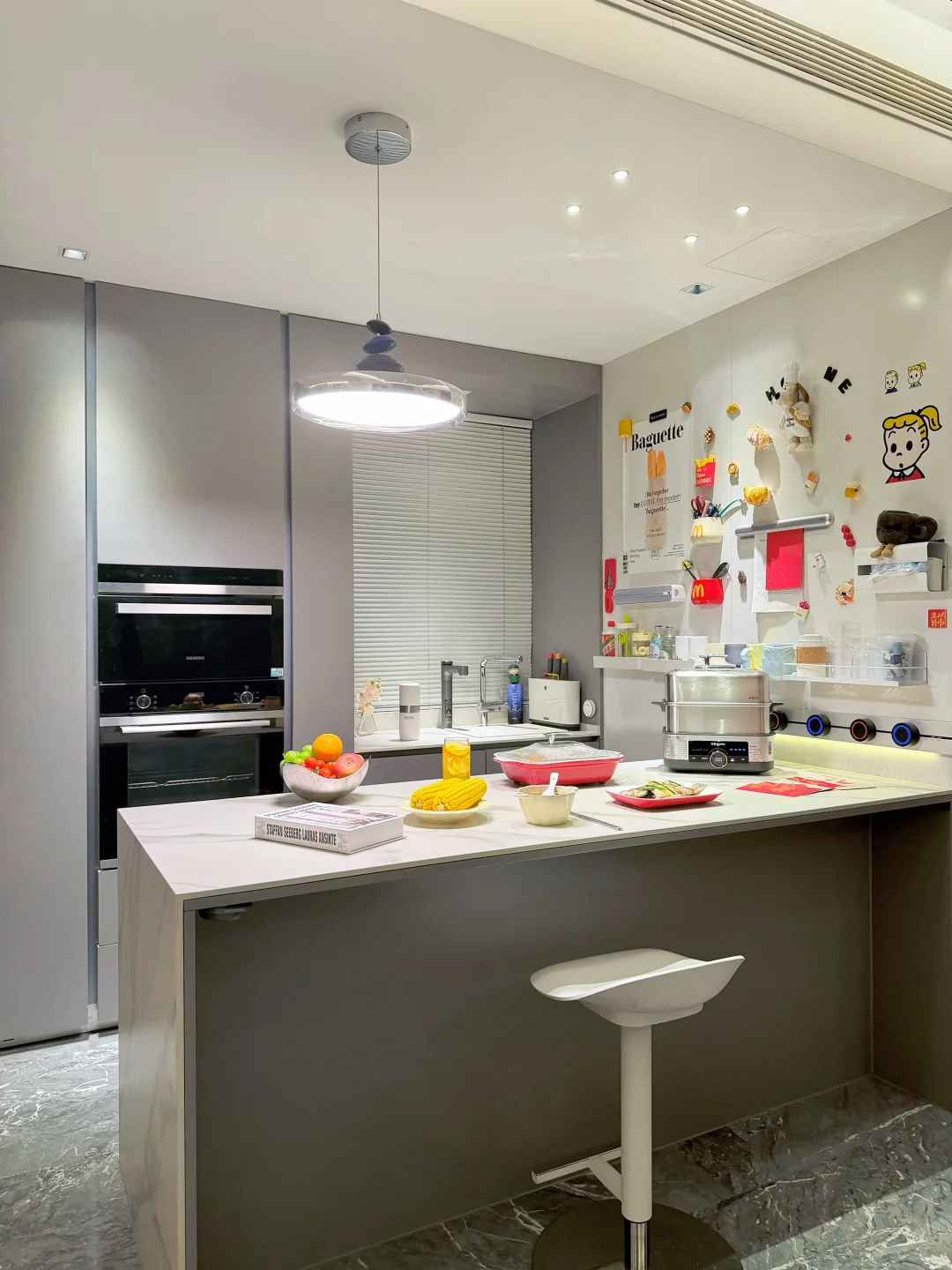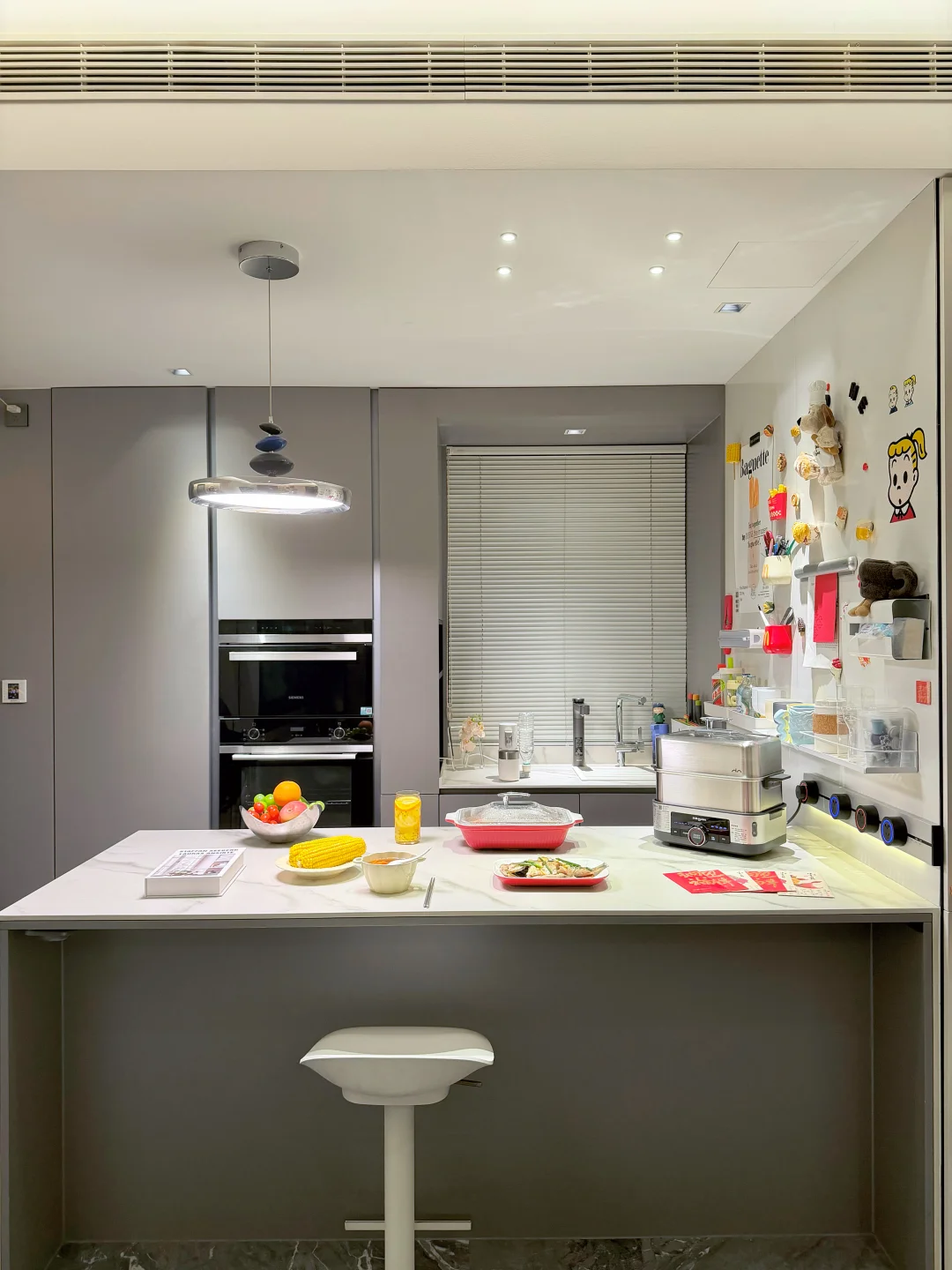 超爱美剧里餐厨一体的氛围感,又怕客餐厅沾油烟,干脆折中保留中厨爆炒自由,餐厅改造成西厨+水吧+餐厅多功能区,窗边做高柜冰箱电器全内嵌;岛台当餐桌,收纳翻倍,每天在这里吃饭玩手机超舒适。