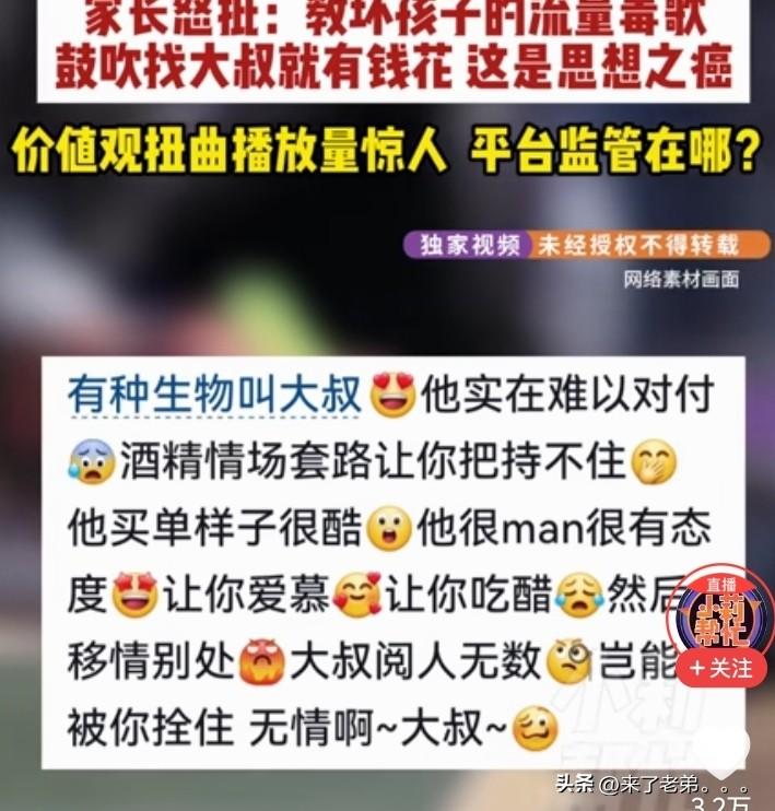 9岁小学生跟唱网络流氓歌曲,家长怒骂“思想之癌,流量毒歌”!引起了大家的关注,歌词中尽是歌颂大叔好的虎狼之词,内容大致是“有种生物叫大叔,让你把持不住,买单样子很酷。让你爱慕让你吃醋……” 这样露骨直白、充斥着畸形婚恋观和拜金主义色彩的歌词,竟然从小孩子嘴里流出,而且 小女孩儿所说这首歌在他们学校非常火爆,大家都在唱。而且她还天真的问妈妈“大叔能给我买单吗?” 大家都知道孩子几岁的时候是学东西最快的年纪,看到什么新鲜事物看到同学们都在模仿。自己也会加入其中,恐怕慢了跟不上大家的脚步。 我相信看了这个文章的家长们没有不愤怒的。因为它扭曲了孩子的思想。 对于小女孩来讲她的恋爱观会崩塌,她会认为大叔真好,有钱,给买单 小男孩会认为,自己一定要努力成为大叔那样有魅力的男人,什么魅力?那是妥妥的渣男! 现在很多年轻人的思想已经歪的不行了,不想结婚已经成了常态。 我们能任由这类歌曲继续荼毒下一代祖国花朵吗?