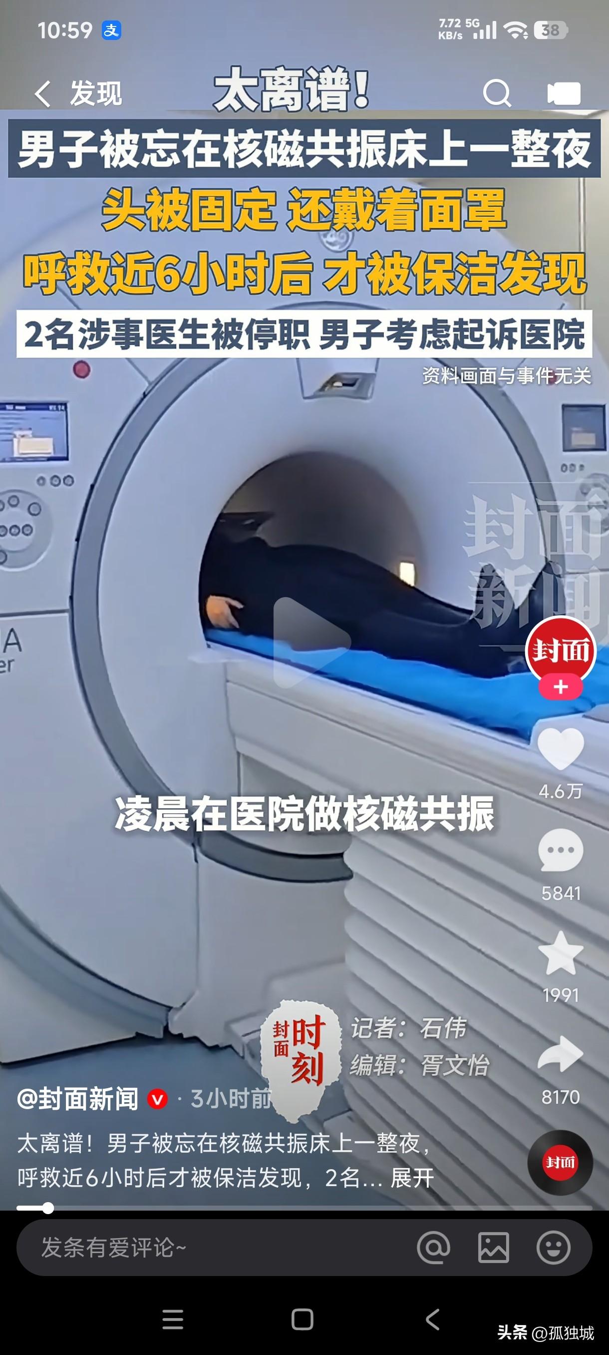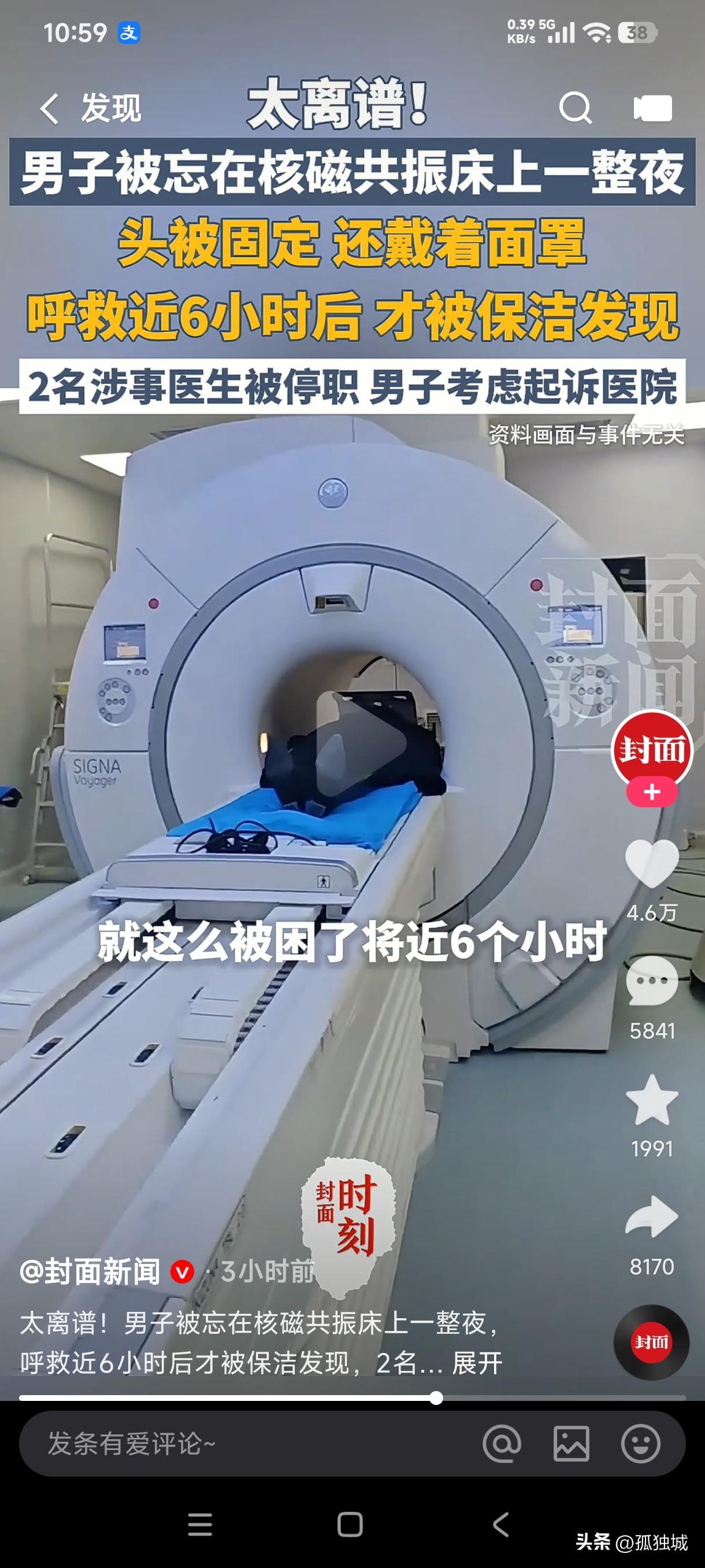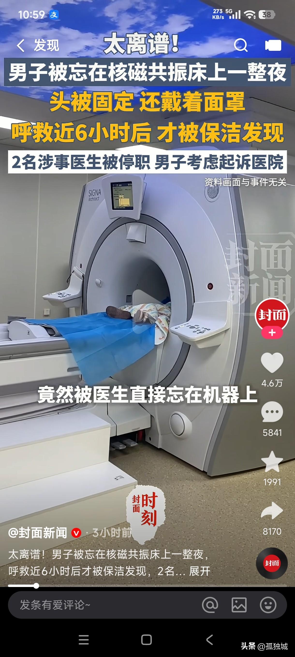 谁经历过这么离谱的事? 男子凌晨在医院做核磁,竟然被医生直接忘在机器上困了6个小时,最后被保洁发现才从机器上下来。 这可真是天大的奇闻,这男子如果没病是不是也被吓出病来了,躺在那上面整整6个小时,而且头被固定,还戴着面罩,叫天天不应叫地地不灵,这不是让人活活地受罪吗?这要不是被保洁发现,他不知道还要被困多长时间,而且他的妻子发现他做了核磁后没有出来,并且打电话也无人接,随即报了警,报警之后医院的工作人员给出的说法是他做完核磁就走了,但谁能想到医生给病人做完核磁后医生自己走了,却把病人忘在核磁床上了,这种不负责任的医生还有医德可言吗? 据医院给出的说法是2名涉事医生已经被停职,这种毫无医德的人应该直接给开除才合理,这简直是拿病人的生命当儿戏,这哪里是看病救人,这不是害人吗?