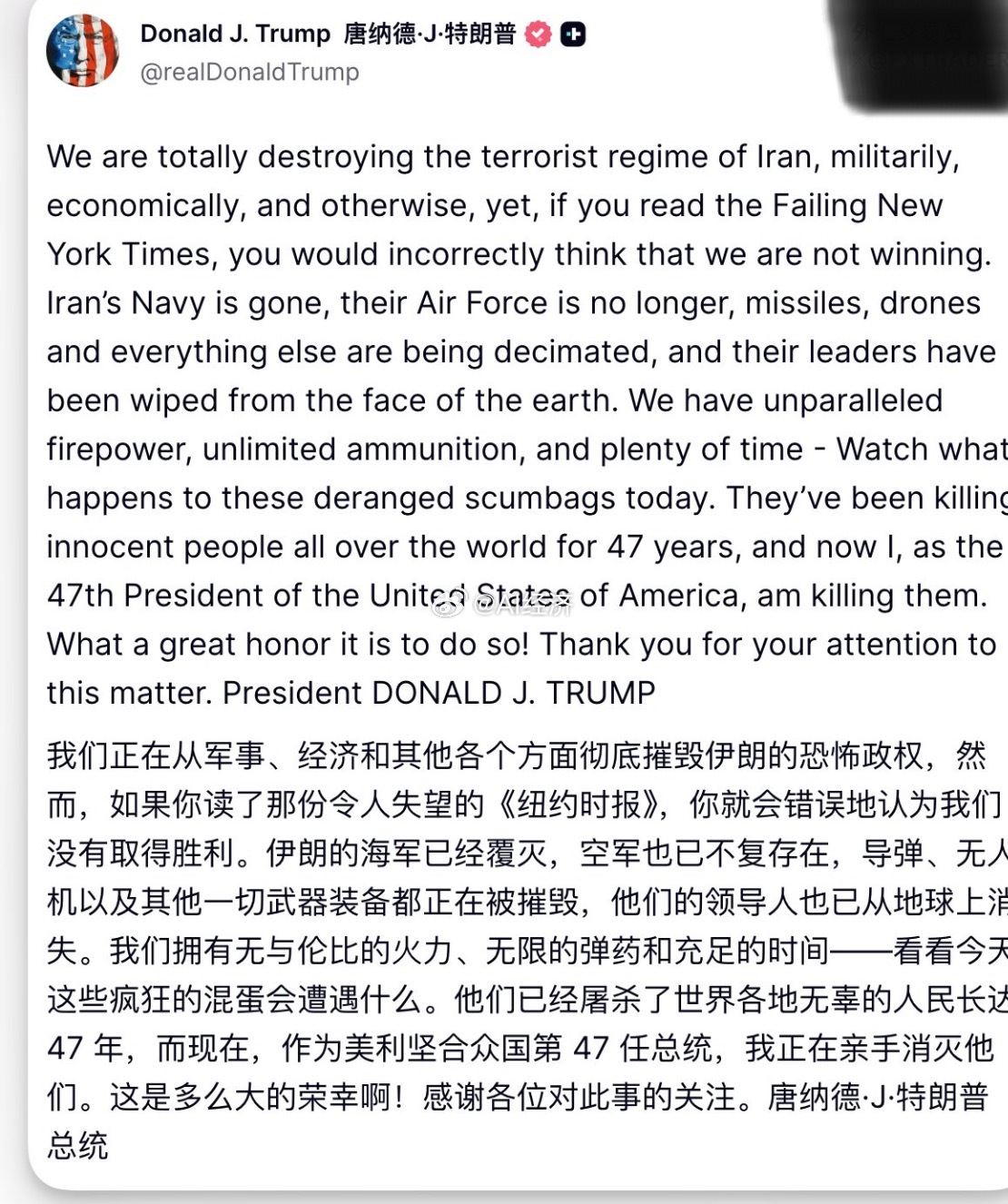 特朗普:美国正从军事、经济等各方面彻底摧毁伊朗恐怖政权。