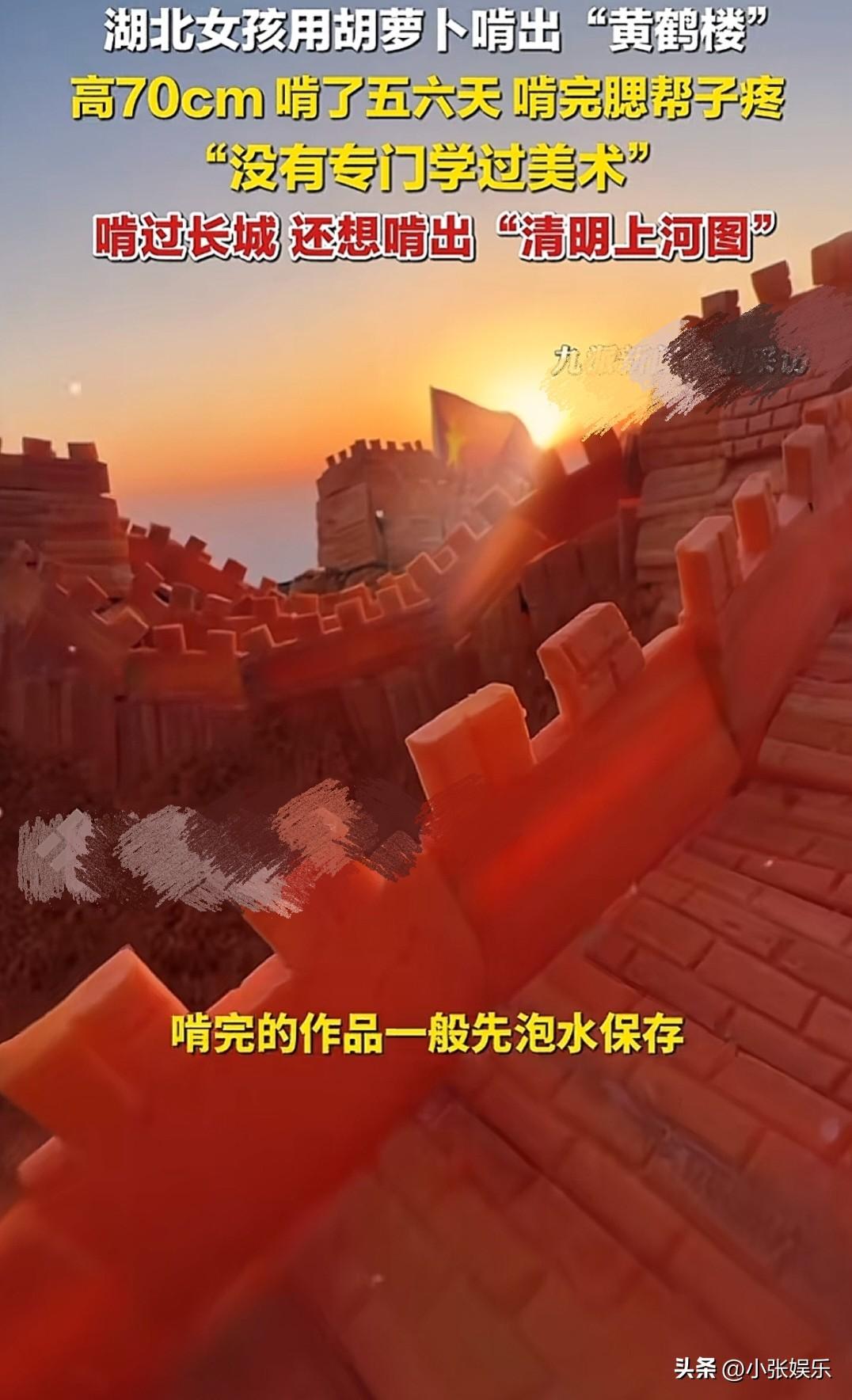 她用胡萝卜啃出黄鹤楼,啃完腮帮子疼,却啃出了平凡人的热爱光芒 湖北恩施的农家小院里,一堆胡萝卜摊在木桌上,女孩穿着毛绒外套,对着根胡萝卜“咔哧咔哧”地啃。没人觉得这能啃出啥花样,连她自己都说“没专门学过美术”。 她啃了五六天,从白天啃到夜里打盹,腮帮子酸得疼。最后,一根胡萝卜变成了70厘米高的黄鹤楼,飞檐翘角、楼阁层叠,跟真的一样。之前她还啃过长城,那胡萝卜块一块一块堆起来,像模像样。啃完的边角料,大点的削皮还能吃,不能吃的就拿去喂猪喂鸡,一点不浪费。每次啃完,她嘴巴周围都染着一圈胡萝卜汁,像个贪吃的小孩。 这哪是啃胡萝卜啊,是把对传统文化的喜欢,一点点用牙齿雕出来。没有专业工具,就靠一口牙和一股子韧劲,把平凡的胡萝卜,变成了能看见的热爱。 原来热爱不分贵贱,哪怕只是一根胡萝卜,也能在普通人手里,开出花来。