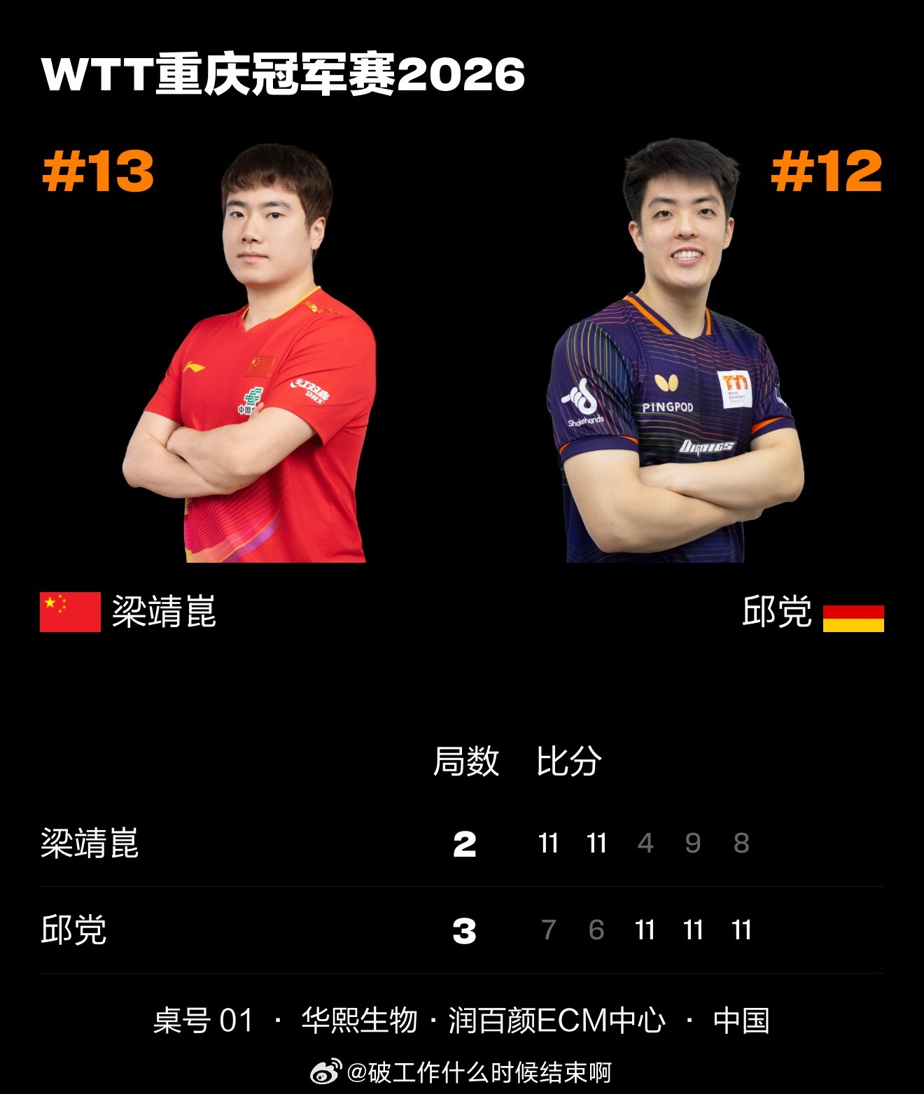 🏓梁靖崑2-3(11-7、11-6、4-11、9-11、8-11)邱党