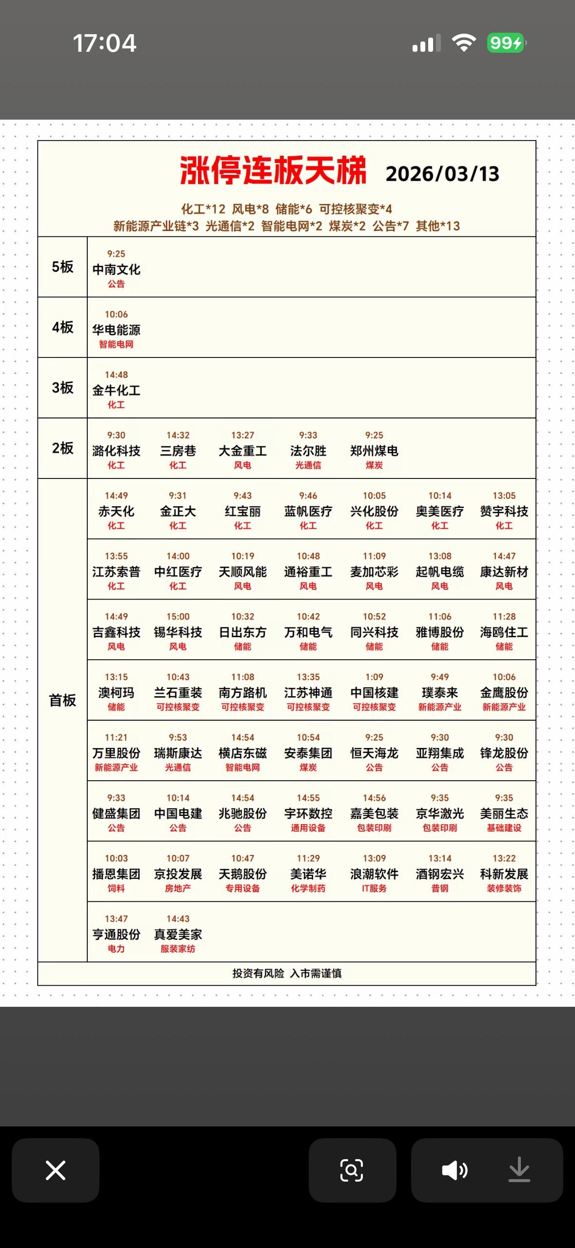 2026年3月13日涨停板天梯,强势股一览! 2026年3月13日的涨停板天梯很有看头。当日连板情况里,5连板的中南文化因资产重组备受关注,它拟收购江阴苏龙热电57.3%股权转型数字经济,收4.49元,成交额4.3亿,量化基金净买3000万。4连板的华电能源,受中东冲突致卡塔尔煤炭出口受限影响,绑定国家能源集团搞风光电一体化,收4.27元,游资“佛山无影脚”净买4000万。还有ST金鸿也是4连板。 从主线分布看,化工、绿电等板块表现突出。不过市场短线情绪低迷,连板股晋级率不高,封板率较前日下降。这市场真是充满变数啊!