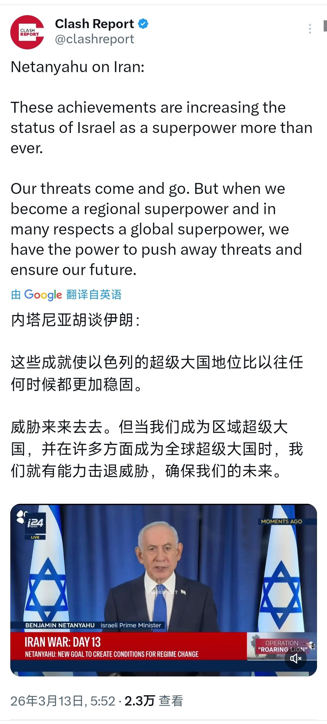 内塔尼亚胡今天放了狠话,说以色列已经成了“全球超级大国”。 他在接受采访时表示:“这些成就使以色列的超级大国地位比以往任何时候都更加稳固。威胁来来去去。但当我们成为区域超级大国,并在许多方面成为全球超级大国时,我们就有能力击退威胁,确保我们的未来。” 当前中东地区的冲突还在持续升级,根据联合国难民署 3 月 12 日发布的最新官方数据,本轮局势升级以来,伊朗、黎巴嫩、阿富汗、巴基斯坦等国,已经有超过 410 万人在本国境内流离失所,还有 11.7 万人被迫逃往其他国家寻求庇护,这些数字还在随着冲突的延续不断增加。 与此同时,以色列在军事行动中持续对外释放强硬信号,多次公开宣称已经掌控伊朗部分领空,尤其是首都德黑兰上空的制空权,还通过军事打击摧毁了伊朗大量导弹发射装置和军事设施。 一边是数百万民众无家可归的人道主义危机,一边是以色列不断强化的军事行动,内塔尼亚胡在这个时候提 “全球超级大国”,根本不是客观评价国家实力,而是出于现实需求的政治叙事。 内塔尼亚胡现在最需要的不是低调谦逊,而是用 “超级大国” 的说法,为自己的政策和当前的局势寻找合理性。首先从以色列国内情况来看,持续的冲突让以色列民众承受着安全压力和生活影响,国内对于战争的走向、政府的决策存在不同意见,部分民众对长期的军事行动感到疲惫。 内塔尼亚胡抛出 “超级大国” 的定位,就是要给国内民众传递信心,用 “国家实力强大、能抵御一切威胁” 的说法,凝聚国内支持力量,巩固自身的执政基础,转移民众对国内矛盾和战争代价的关注。 从对外博弈的角度来说,内塔尼亚胡的这番话,是说给中东地区对手和国际社会听的。中东地区局势复杂,以色列长期和周边国家存在分歧与对抗,近期针对伊朗的一系列军事行动,让地区紧张局势达到新高度。 宣称以色列是全球超级大国,本质上是一种威慑手段,想借此打压对手的底气,让周边势力不敢轻易对抗以色列。同时,以色列一直依靠美国的支持,强调自身超级大国地位,也是在向美国等盟友证明,以色列有能力承担中东地区的战略角色,巩固和盟友的合作关系,为后续的军事行动和政策推进争取外部支持。 更关键的是,内塔尼亚胡想用 “超级大国” 的叙事,合理化以色列当前的军事行动。他把冲突的起因归结为以色列面临外部威胁,而成为超级大国,就能合法地击退这些威胁,这种逻辑刻意忽略了冲突带来的人道主义灾难,忽略了数百万流离失所的普通民众的苦难。 410 万人流离失所,意味着无数家庭失去家园、失去生计,基本的生活保障都难以实现,这是摆在眼前的真实悲剧,而以色列宣称接管伊朗领空的行为,进一步加剧了地区动荡,让和平的可能性变得更加渺茫。内塔尼亚胡的表态,完全避开了这些现实问题,只强调自身的强大和安全,本质上是为持续的军事行动找借口。 从客观事实来看,以色列在军事、科技领域确实有一定实力,是中东地区军事力量较强的国家,但 “全球超级大国” 的说法,完全不符合实际情况。 全球超级大国需要具备足够的人口规模、经济总量、全球治理影响力、文化辐射力等多方面条件,以色列人口不足千万,经济规模和全球主要大国差距明显,在国际社会上,其军事行动多次遭到联合国和多数国家的批评,多次联合国会议都通过决议,要求以色列停止军事行动、保障平民安全、缓解人道主义危机。 所谓的 “全球超级大国”,只是内塔尼亚胡单方面的政治表述,不是国际社会公认的事实,也和以色列的实际实力不匹配。 内塔尼亚胡的这番狠话,看似是对国家实力的自信宣言,实则是当下局势下的政治选择。他需要用 “超级大国” 的叙事,稳定国内民心、威慑地区对手、合理化战争行为,而不是客观看待中东的真实局势和人道主义危机。当前中东最需要的不是某个国家自称超级大国,而是停止冲突、保障平民安全、解决流离失所民众的基本生活问题,通过对话协商实现地区和平。 410 万流离失所的民众、持续升级的地区冲突,都在证明,强硬的口号和虚假的实力定位,解决不 了实际问题,更换不来真正的安全。 内塔尼亚胡的 “超级大国” 说法,终究只是服务于自身政治需求的表述,无法改变中东地区的现实矛盾,也无法掩盖冲突带来的人道主义伤痛。只有放下对抗思维,推动停火和谈,才能让中东民众摆脱苦难,让地区走向稳定与发展。