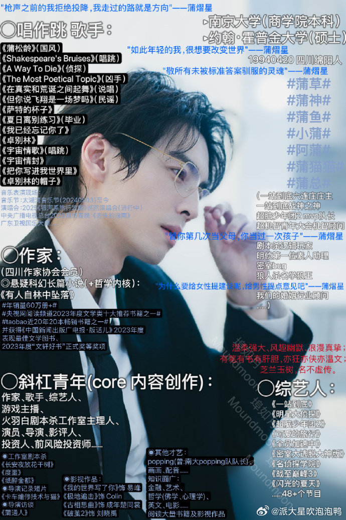 蒲熠星真干一行行一行主咖和Ta的朋友们✨蒲熠星的斜杠青年属性真的被彻底认证了,学历、音乐、文学、脑综各个领域都能出彩,不是空有标签而是真的有拿得出手的成绩🐮