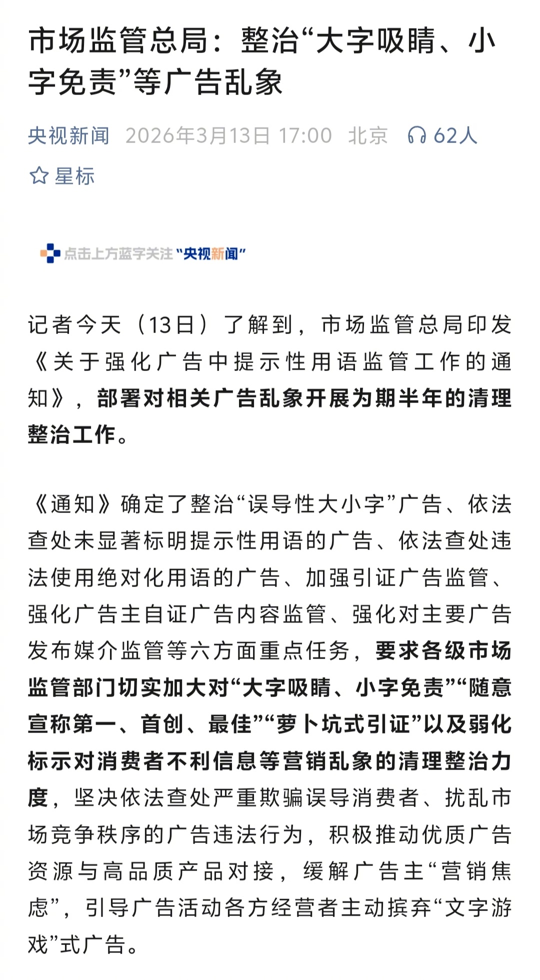 市场监管总局:整治“大字吸睛、小字免责”等广告乱象。