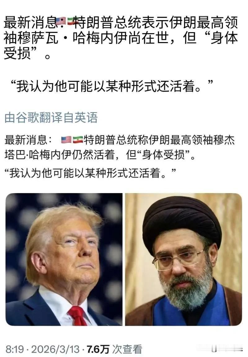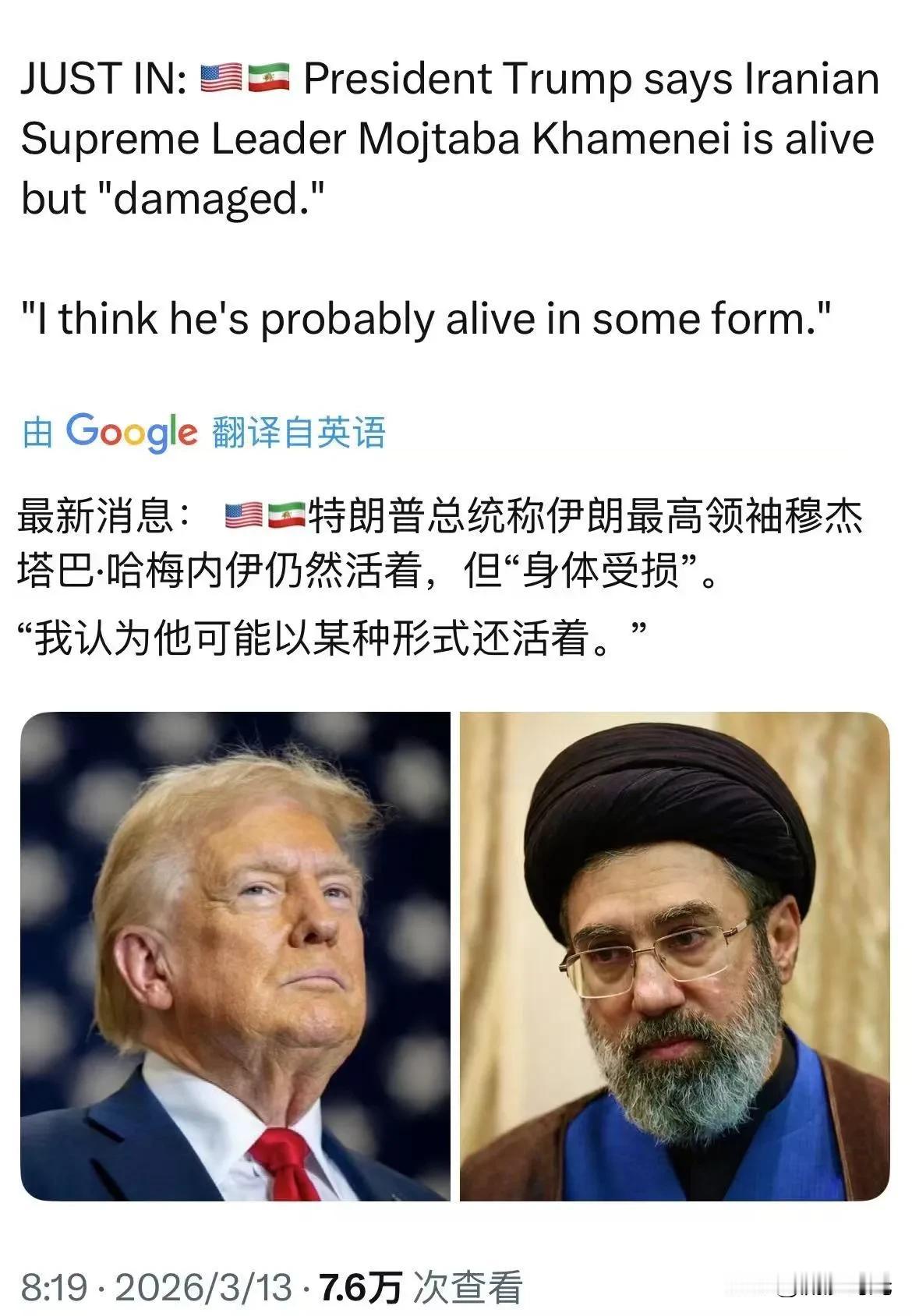 最新消息:特朗普总统称伊朗最高领袖穆杰塔巴·哈梅内伊仍然活着,但“身体受损。“我认为他可能以某种形式还活着。