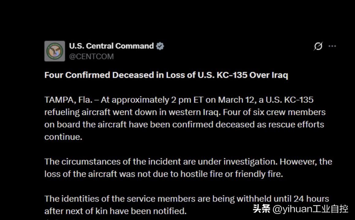 在伊拉克安巴尔省坠毁的美军KC-135加油机上真的有6名机组人员,正常这种加油机上只有三名乘员,正副驾驶员和加油操作员,这架飞机有点怪。 美国中央司令部刚刚发布消息称,机上6名机组人员中已有4人确认遇难,搜救工作仍在进行中。另外两人也是凶多吉少,说不定在加油机坠地燃烧时气化了。 中央司令部在声明中,再次排除飞机被敌方或友军击落的可能性。不过美国人遮遮掩掩的,人都找到四个了,也不提飞机残骸的事,说不定真是伊拉克民兵打下来的,坠机过程中还撞坏另一架加油机的尾翼。