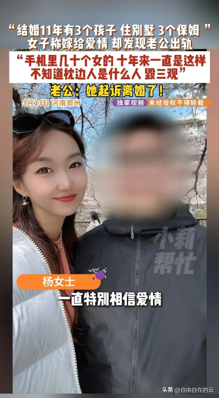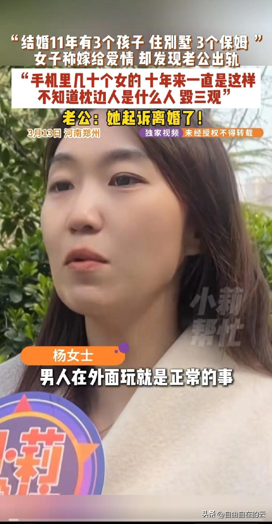 太毁三观!河南郑州,干练、漂亮的杨女士求助电视台,说自己的老公不仅出轨还家暴,现在他又把房子的密码给换了,害的她有家不能回。 这是怎么回事呢? 杨女士称,自己和老公是留学认识的,结婚已经11年了。她老公出生在一个高知家庭,他们平时生活富裕,住的是别墅,家里有3个保姆。她还生了3个孩子,原来是让人羡慕的一家五口。 她一直以为老公很爱她,可是去年她却发现老公出轨了,她老公有个专门联系女人的手机,里面存着几十个女人的电话号码。 杨女士说,其实他老公早就出轨了,家里人和老公公司的下属都知道,就把她一个人蒙在鼓里。 她老公的想法是,男人在外面有女人很正常,就是玩玩而已,也不影响家庭。他和外面的情人有约定,只谈情不牵扯家庭。 但是杨女士受不了,她觉得自己也很优秀,再工作上,她负责的销售部门累计销售额有两个多亿。在家里她也是贤妻良母,能照顾好孩子,也孝敬老人,她对这个家做到了问心无愧,所以她很委屈。 两人就发生了争执,让杨女士寒心的是老公家暴了她,扇耳光,还骑在她身上打她,甚至把她推下楼梯,多亏她女儿给她打的120。 不过即使这样,杨女士还是希望老公能幡然醒悟,回归家庭。毕竟他们都有3个孩子了。可是家暴后,她就带着女儿离开了家,等她想回家时,发现家里的密码被换了。 记者陪着杨女士来到她家时,发现大门的密码确实换了,杨女士给他老公打电话,他老公不承认换密码。他对他们的事也不愿多说,就说已经起诉到法院了,等法院的判决吧。 我认为杨女士和丈夫本来就是两种人,杨女士想要独一无二的爱情,她希望丈夫这辈子只爱她一个人。而她的丈夫认为,只要我不把外面的女人领到家里就行,我在外面怎么玩你也不要干涉。两人三观完全不合,即使勉强在一起,也不会幸福的。 我觉得杨女士不再再纠结了,趁着自己还年轻,也有能力,赶紧去寻找属于自己的幸福吧。 对于这件事,你怎么看呢?