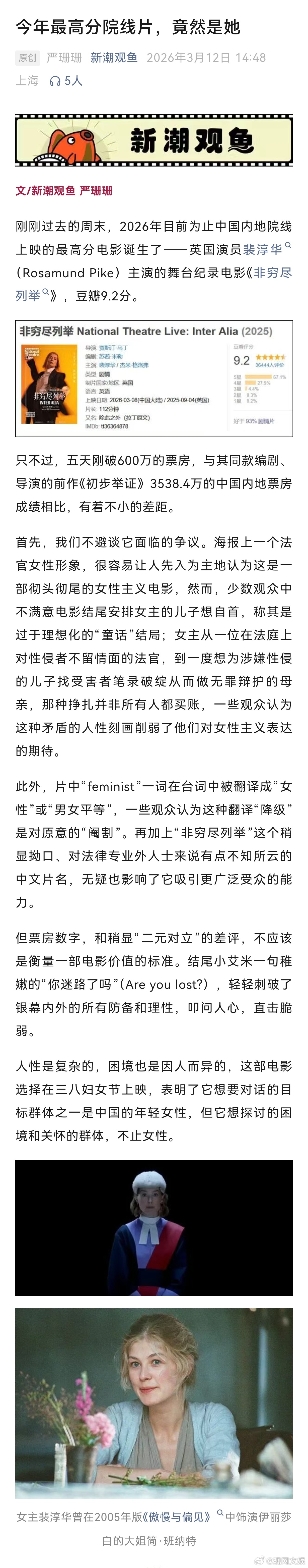 【今年最高分院线片,竟然是她】非穷尽列举为何评分高却票房遇冷刚刚过去的周末,2026年目前为止中国内地院线上映的最高分电影诞生了——英国演员裴淳华(Rosamund Pike)主演的舞台纪录电影《非穷尽列举》,豆瓣9.2分。非穷尽列举豆瓣9.2分