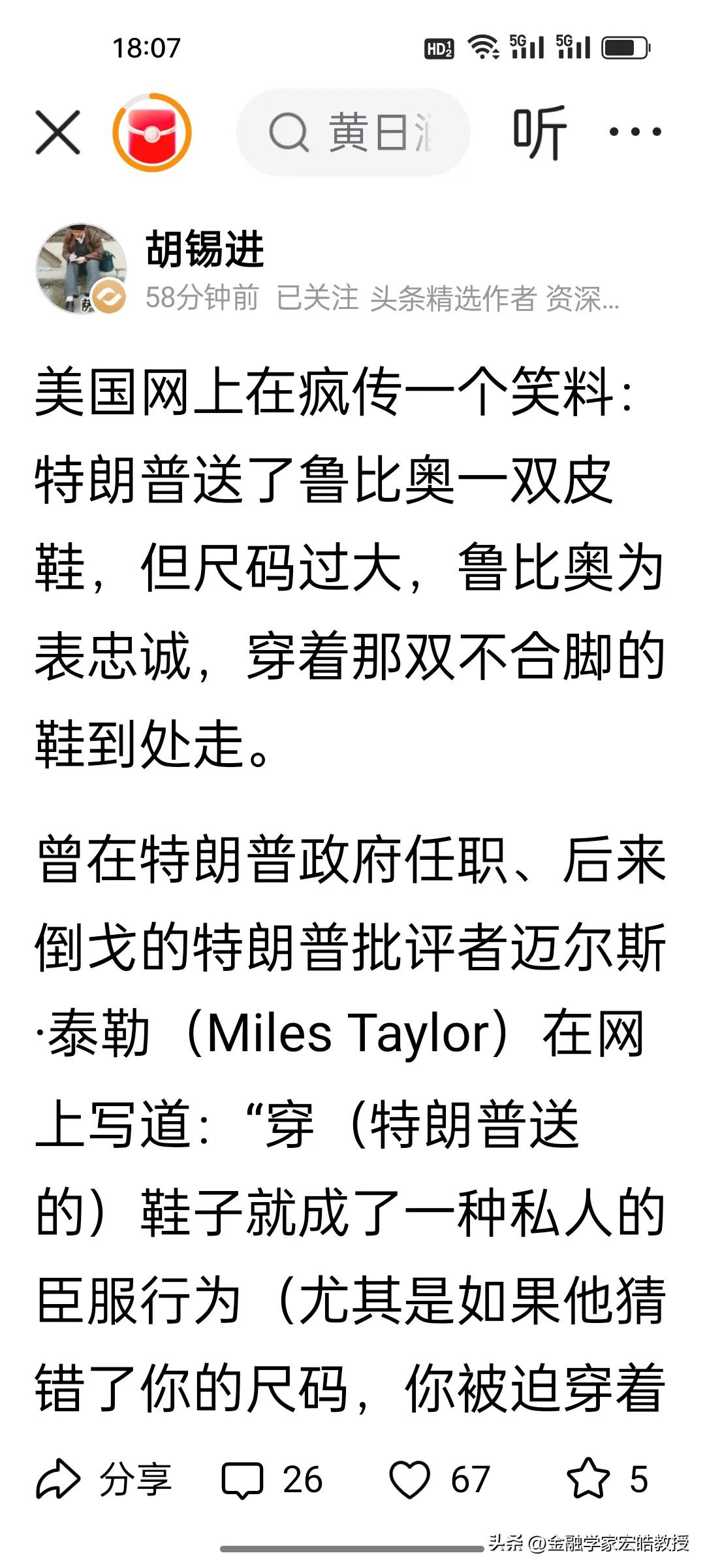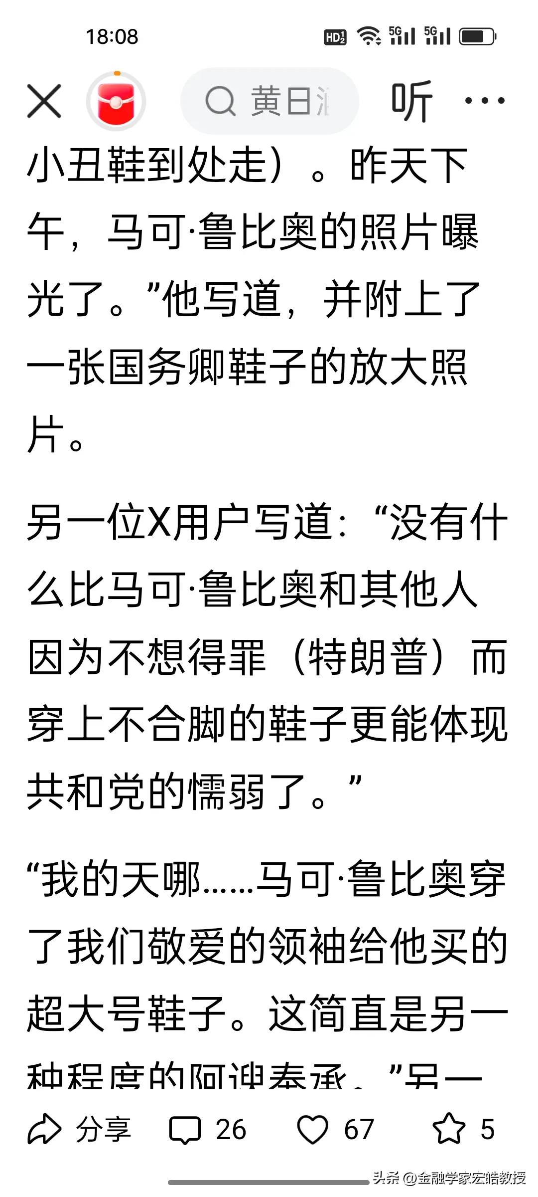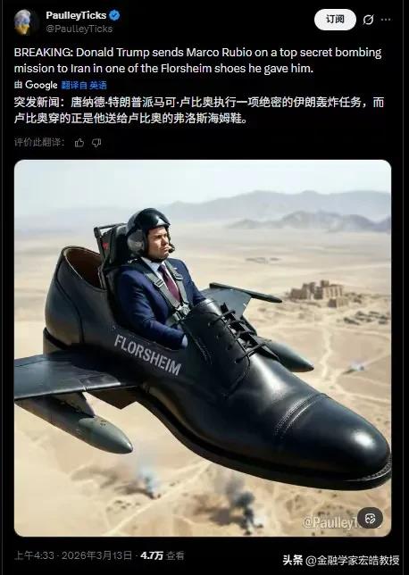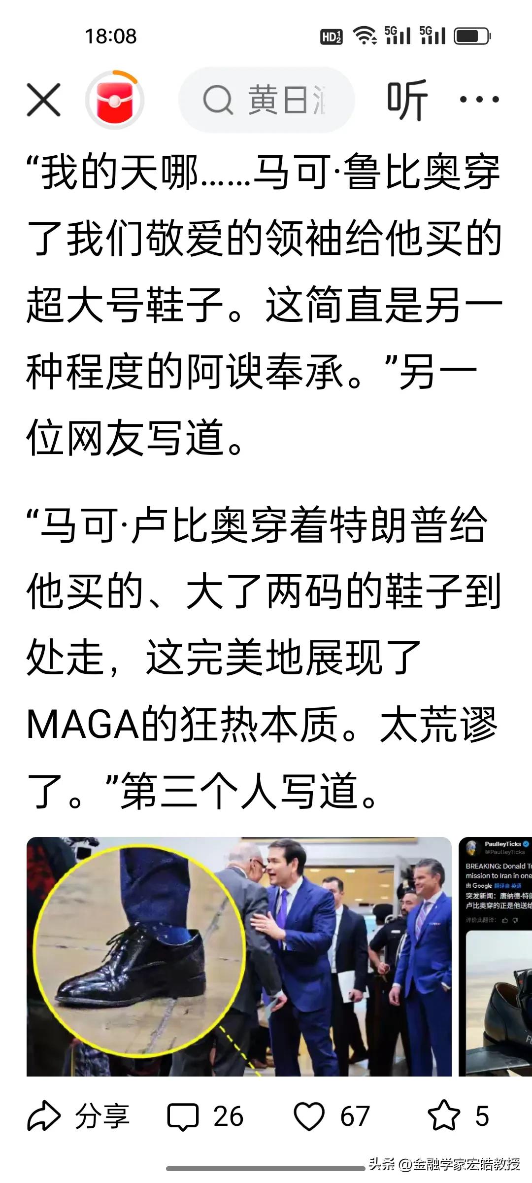 刚刚看到胡锡进晒出的这个料太绝了,特朗普送鲁比奥一双大码鞋,非常不合脚,鲁比奥愣是穿着到处走,活脱脱现实版“穿小鞋”反向名场面。 这哪是送鞋,分明是把“臣服”印在了脚上。网友调侃还好送的是大鞋,要是小鞋,鲁比奥怕是要把脚挤变形也得硬撑。鲁比奥不止一次在公众场合夸特朗普是好总统,说自己多幸运,共和党一众政客对特朗普的“忠心”,全被这双不合脚的鞋暴露无遗,荒诞又好笑。