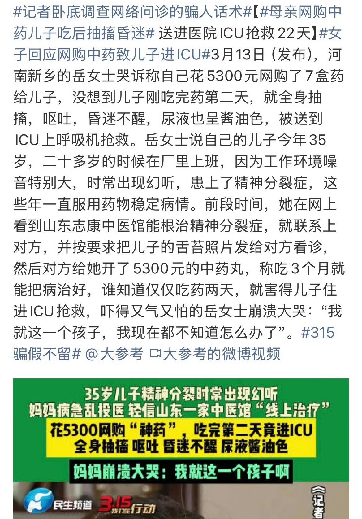 3月13日曝光的这事儿太让人痛心!河南新乡岳女士为治35岁儿子的精神分裂症,花5300元从山东志康中医馆网购中药丸。儿子仅吃两天,就全身抽搐、呕吐昏迷,尿液呈酱油色,被送进ICU靠呼吸机抢救22天。 精神分裂症这么复杂的病,哪是吃几盒药就能根治的?这些骗子打着“中医根治”旗号,仅看舌苔就开方,连正规问诊流程都不走,简直草菅人命。岳女士治病心切,本想给儿子找条治愈路,却让孩子遭了罪。 相关部门迅速介入调查,发现这家中医馆根本没有正规的行医资质,所谓的“中医专家”也不过是一些没有专业知识的江湖骗子。他们利用患者和家属病急乱投医的心理,大肆行骗,不知坑害了多少人。 这样的事件并非个例,在医疗市场中,总有一些不法分子为了谋取暴利,打着各种旗号招摇撞骗。他们不仅损害了患者的健康和利益,也严重破坏了中医的声誉。希望相关部门能加大监管力度,严厉打击这类违法行为,让医疗市场回归正轨,也给患者和家属们一个安全可靠的就医环境。同时,也提醒广大患者和家属,治病一定要选择正规的医疗机构,切勿轻信那些所谓的“根治秘方”,避免重蹈岳女士一家的覆辙。 难治性精神疾病 精神分裂症鉴定 精神症 广州精神分裂症 中医治精神异常 青少年精神分裂 精神科真实案例 襄阳精神病人 怎么防范网络骗子 网络安全有你有我 来源:大参考