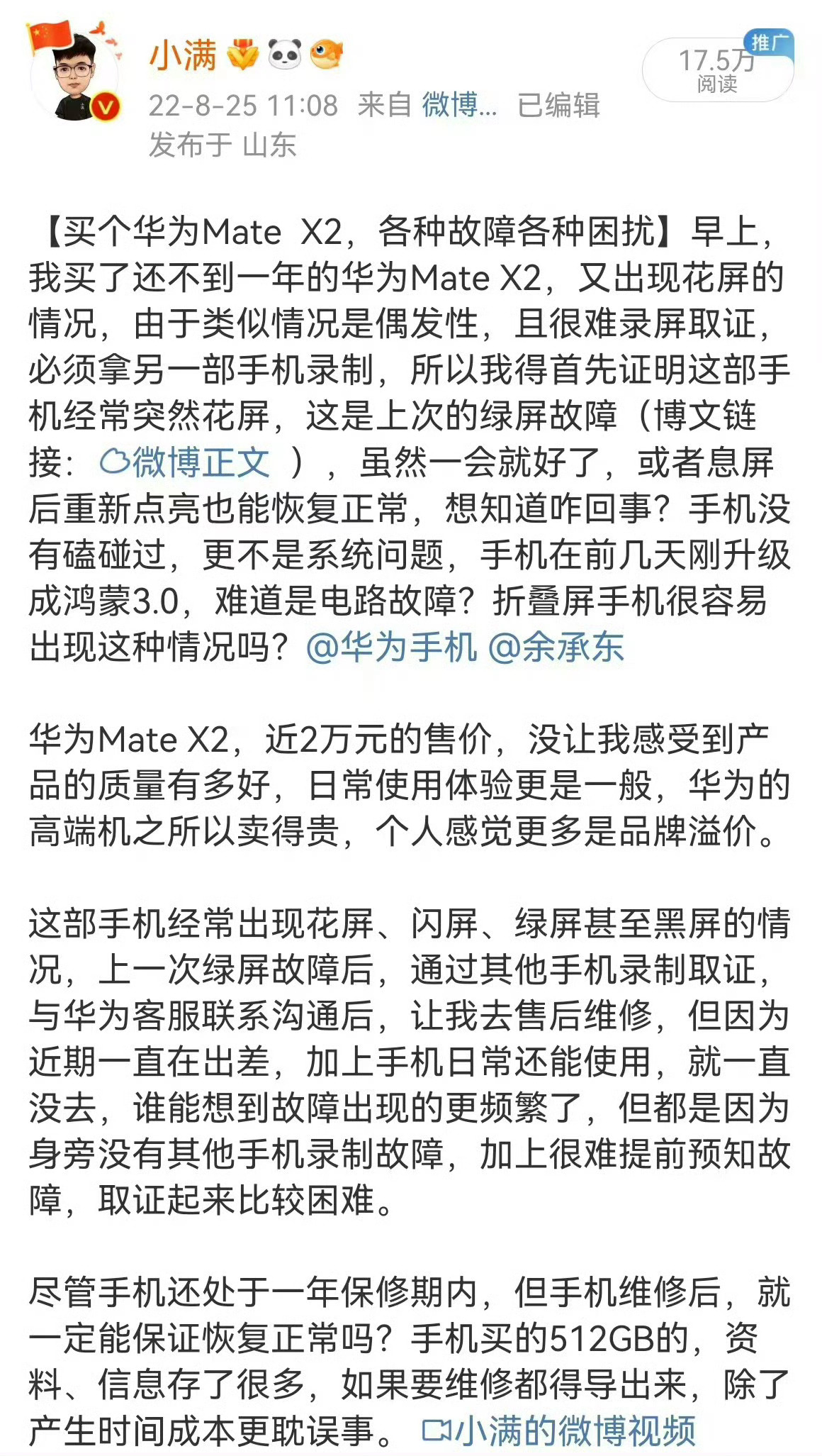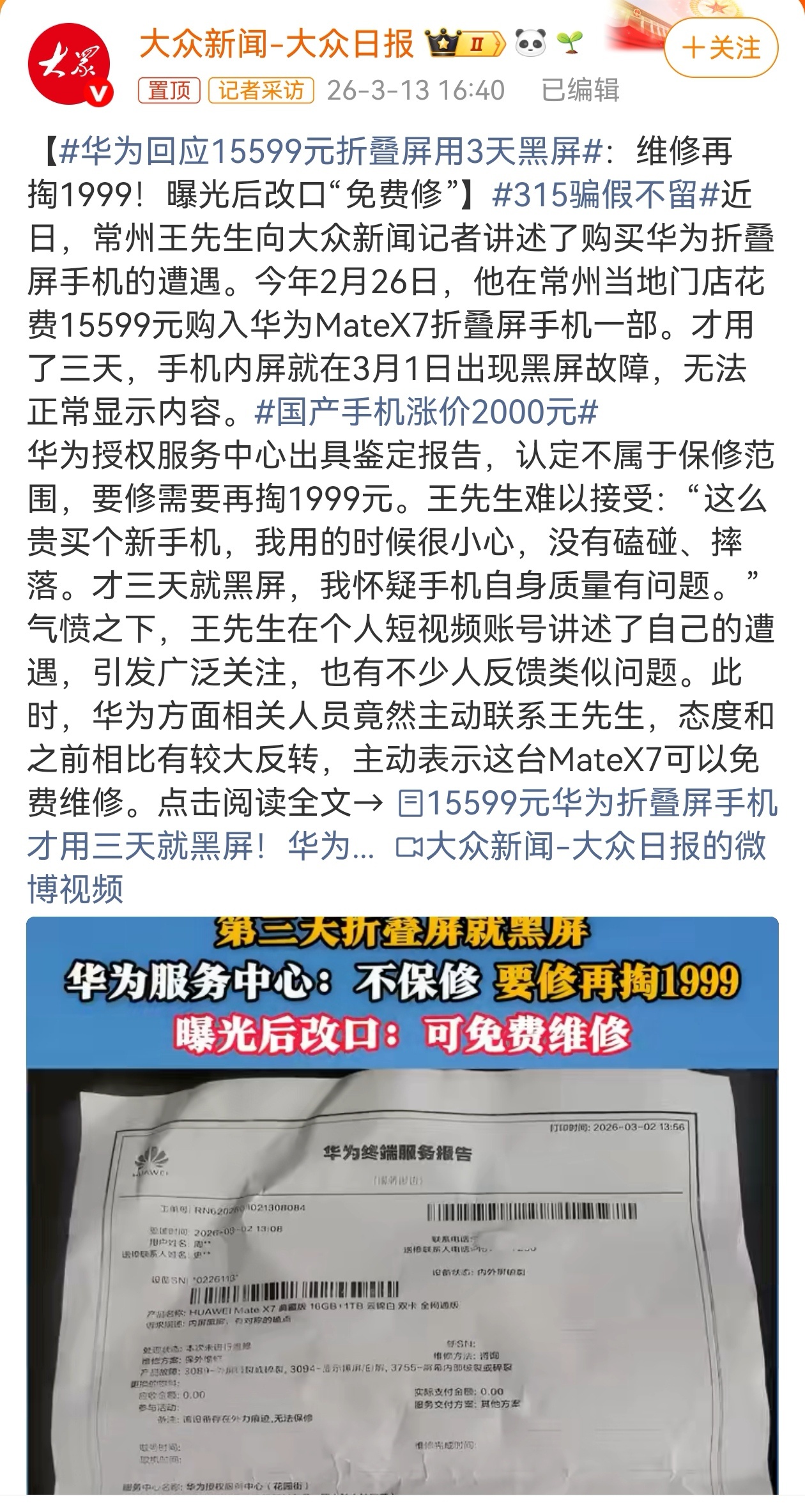 在日常使用过程中,最近还遇到过每天强行推送鸿蒙6.0更新的提醒,后给客服反馈过,相关升级提醒才取消(网页链接),针对15599元折叠屏用3天黑屏的情况,应该还是小概率事件,但售后的相关做法,有些让消费者寒心,手机有质量问题,应该客观解决,而不应该甩锅,让用户加钱维修。 华为回应15599元折叠屏用3天黑屏