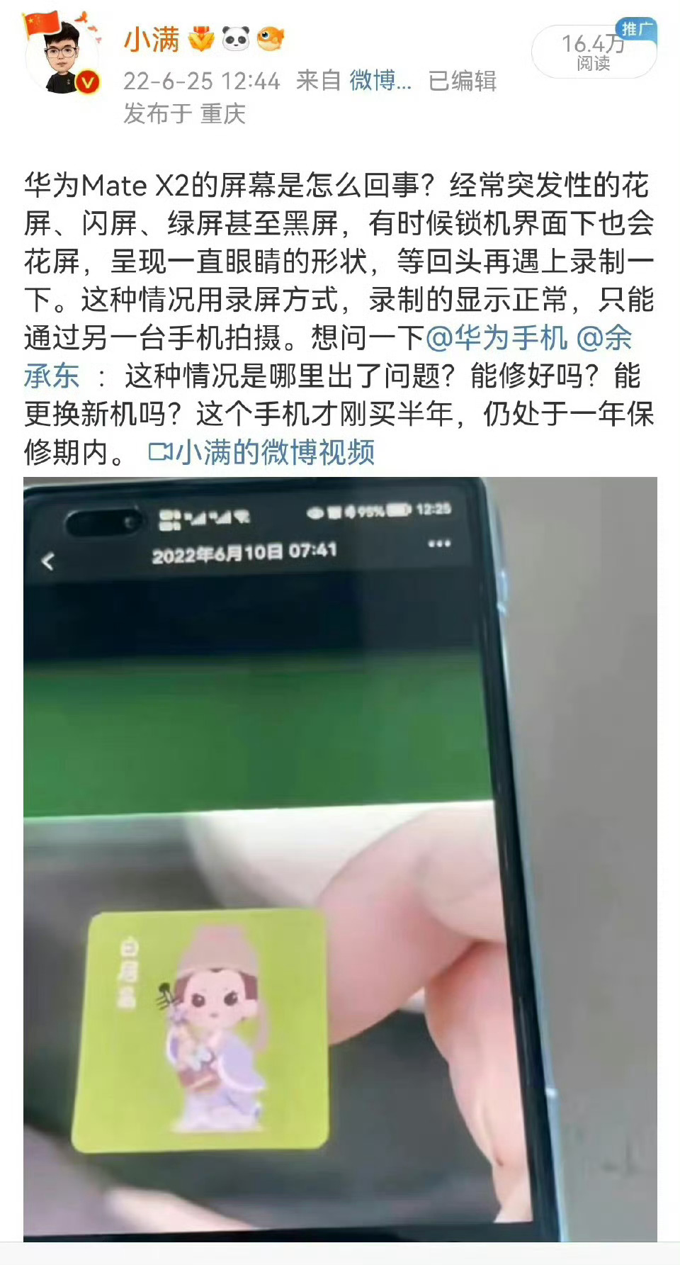 华为折叠屏出现黑屏、闪屏的情况,个人深有体会,之前使用华为Mate X2折叠屏手机,曾出现过偶发性的绿屏、花屏等不可预知情况,送到售后检查后,软硬件都没问题,万幸没有过一年质保期,更换了一部新的,屏幕问题才得到解决。(详情网页链接)华为回应15599元折叠屏用3天黑屏满谈手机