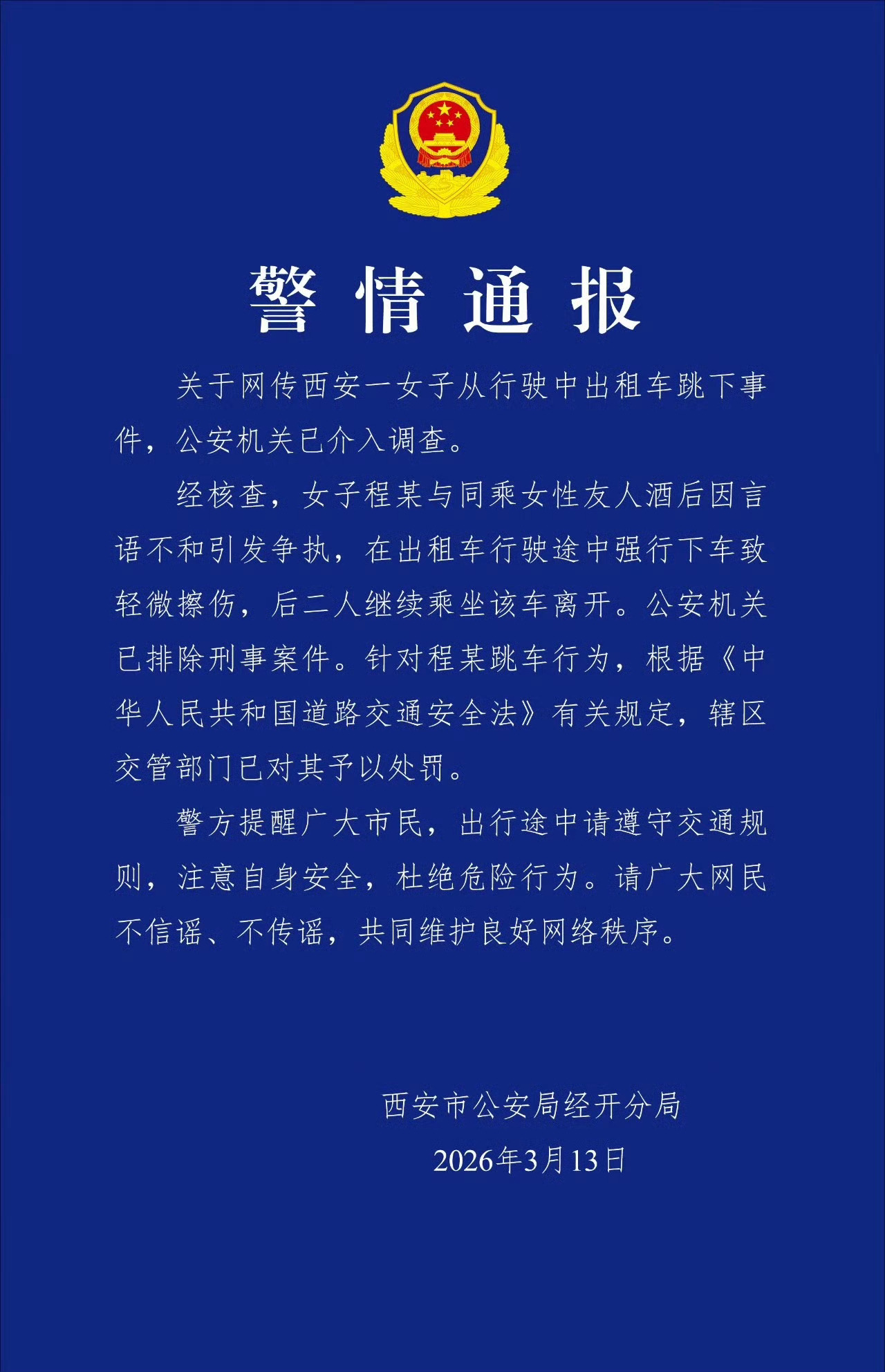 3月13日,针对网传西安一女子从行驶中出租车跳下事件,西安市公安局经开分局发布通报称,女子程某与同乘女性友人酒后因言语不和引发争执,在出租车行驶途中强行下车致轻微擦伤,后二人继续乘坐该车离开。警方通报女子从行驶中出租车跳下时事满谈