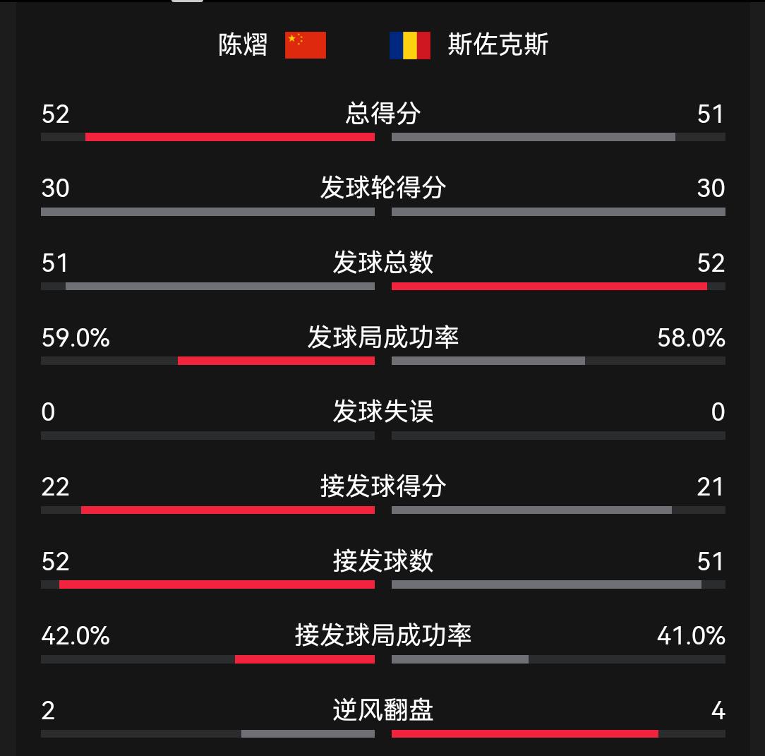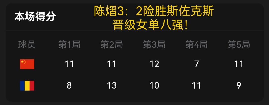 陈熠3:2险胜斯佐克斯,艰难挺进女单八强,将对阵日本选手大滕沙月,争夺一个四强席位。 五局比分分别为11:8,11:13,12:10,7:11,11:9。 在这场比赛中,陈熠打的比较挣扎,状态不是太好,失误较多,而斯佐克斯则发挥的不错! 陈熠四强的对手大滕沙月最近状态火热,比赛将异常激烈!中美将在法国举行经贸磋商 中方驳斥美方为释放黎智英提条件 生态环境法典守护百姓美好生活 贵州茅台副总经理蒋焰被查 司法部:将通过立法解决内卷式竞争 外交部回应美对台军售计划 万吨大驱新成员109舰首次海训 韩国将坚决严正应对日涉独岛不当言论 伊朗称“林肯”号航母失去作战能力 129岁老夫妻相恋百年系谣言 伊朗抓捕4名涉嫌向境外泄密人员 伊朗首都集会现场附近发生巨大爆炸 核磁患者被忘6小时 三甲医院岂能失守 中国女篮不敌比利时暴露什么问题 美强推对伊制裁会议 中俄投反对票 苹果税下调 今儿个是填仓节 《逐玉》樊长玉坠崖失踪 女子称“嫁给爱情”却发现老公出轨