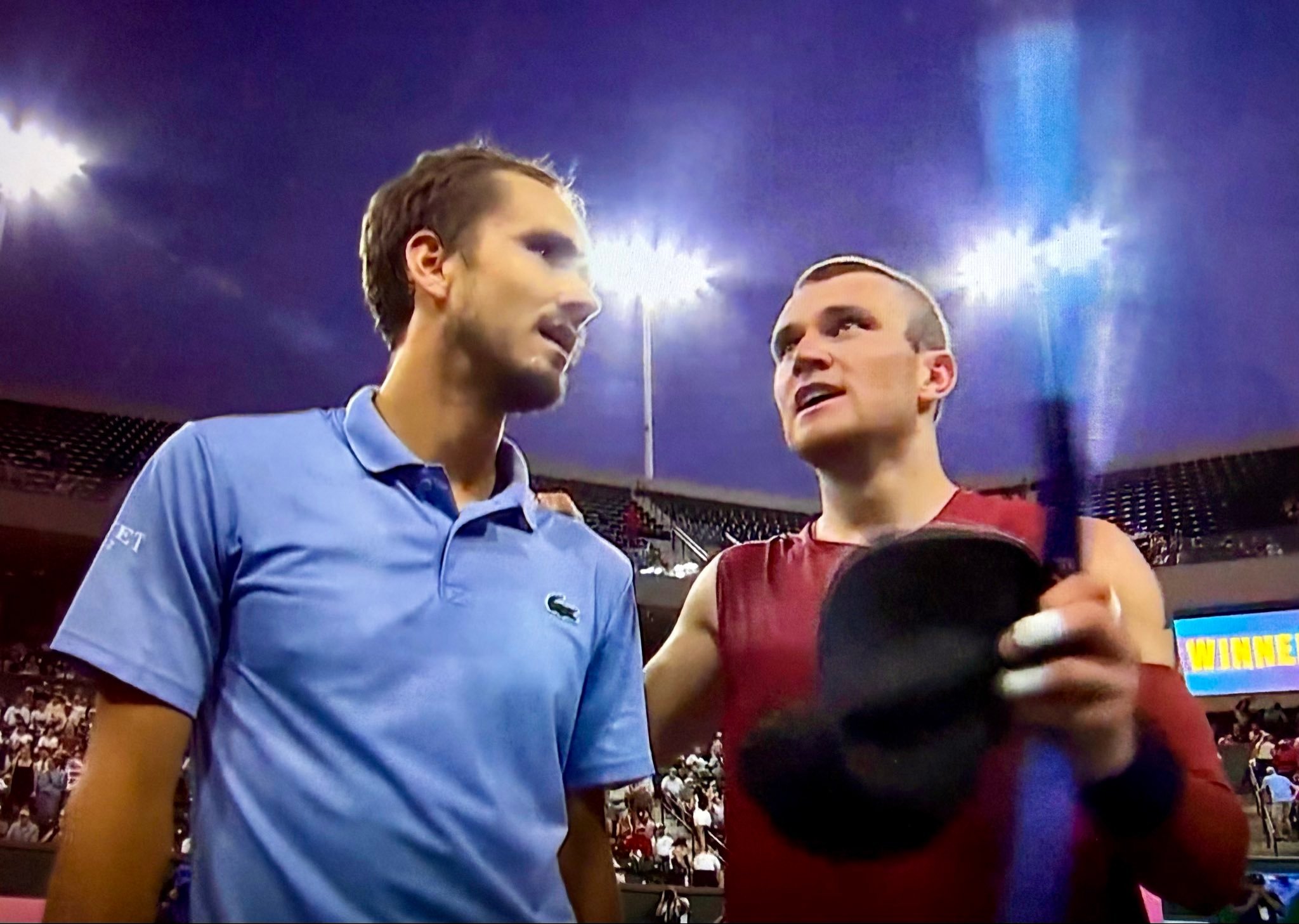 梅德维德夫谈到今天面对德雷珀时的争议判罚时说:“我感觉好吗?其实并不好。但我也不认为自己作弊了什么的……我这辈子遇到过很多不利于我的判罚,我通常都处理不好。这次能得到一个有利于我的,感觉也还不错。”