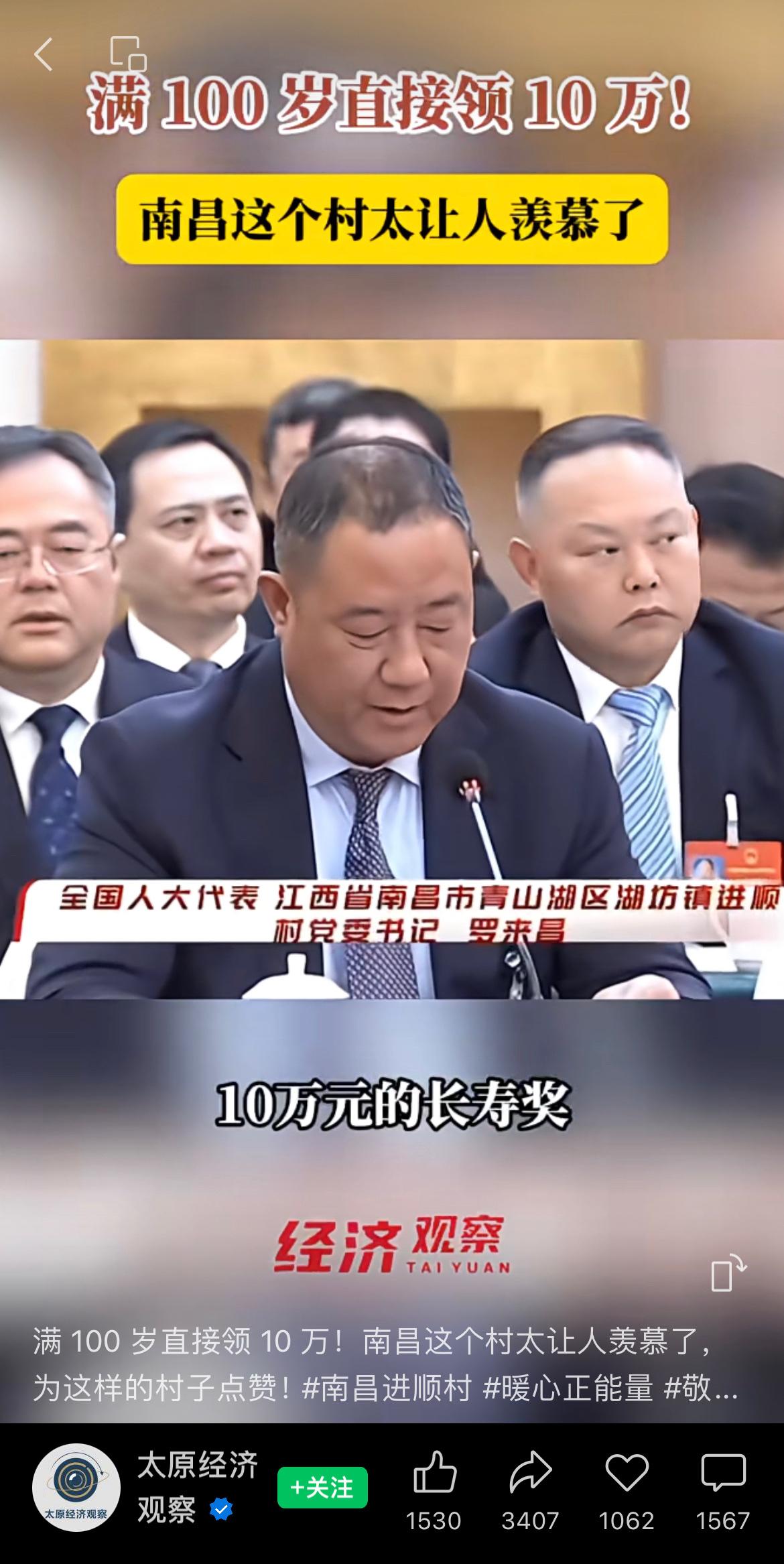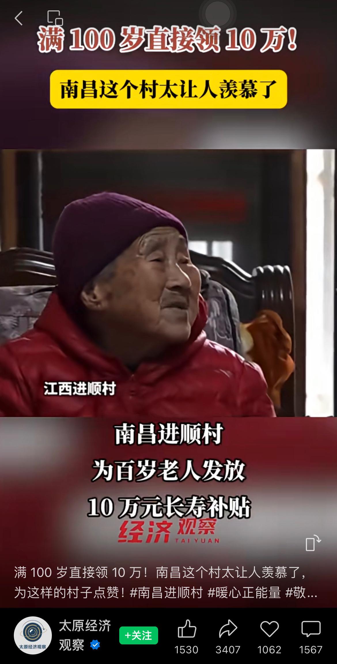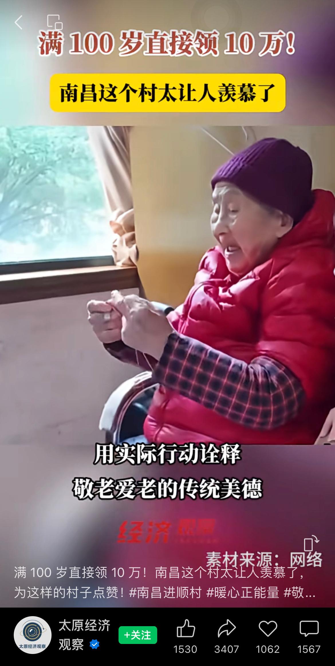 满 100 岁直接领10万!南昌进顺村有了一位百岁老人以后设长寿奖,一次性给老人发了10万块钱[赞] 百岁老人