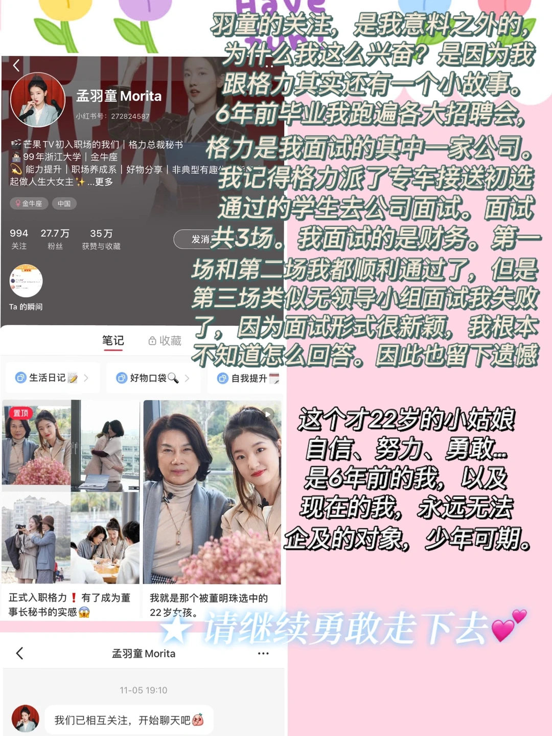 4️⃣收获——除了短短3个月收获6.5万粉丝,我还意料之外收获了格力总裁董明珠秘书孟羽童宝藏博主的关注。她是一个特别努力上进的22岁女孩。22岁,她人生的开场,已是我一辈子无法企及的高度。大家看到她的年轻、漂亮、可爱、幸运,但我更多的,是看到她的坚持,每一次光鲜亮相大众内心深处积攒的勇气。我相信,她的努力配得上她的运气,运气就是实力的一种。还有另外两位宝藏博主,从我关注她们,最后都变成了“互相关注”,感恩。