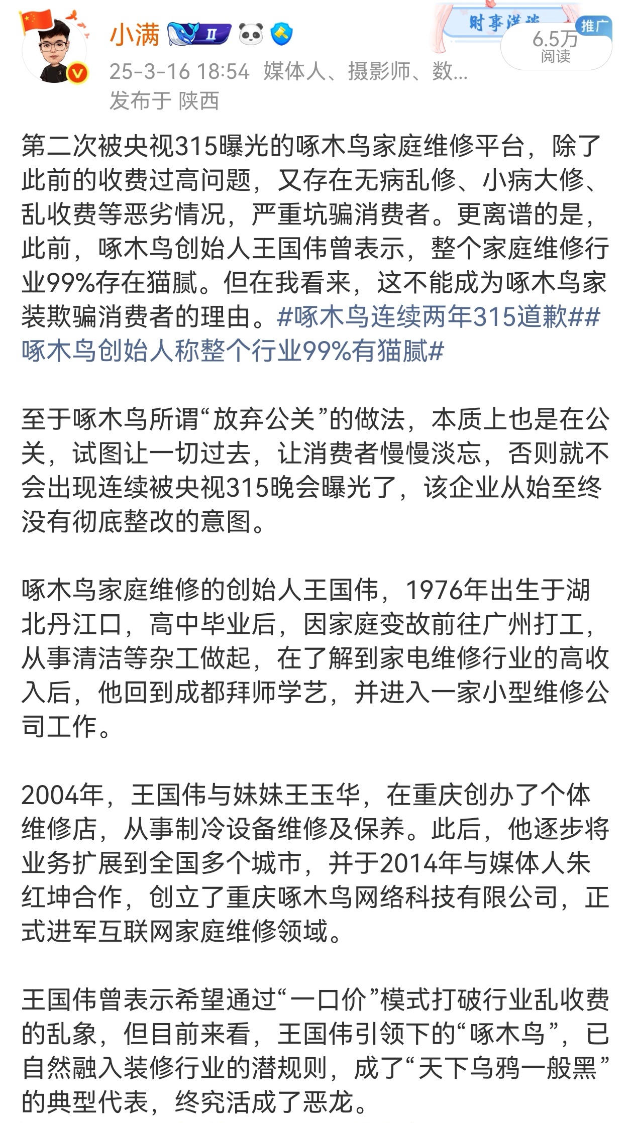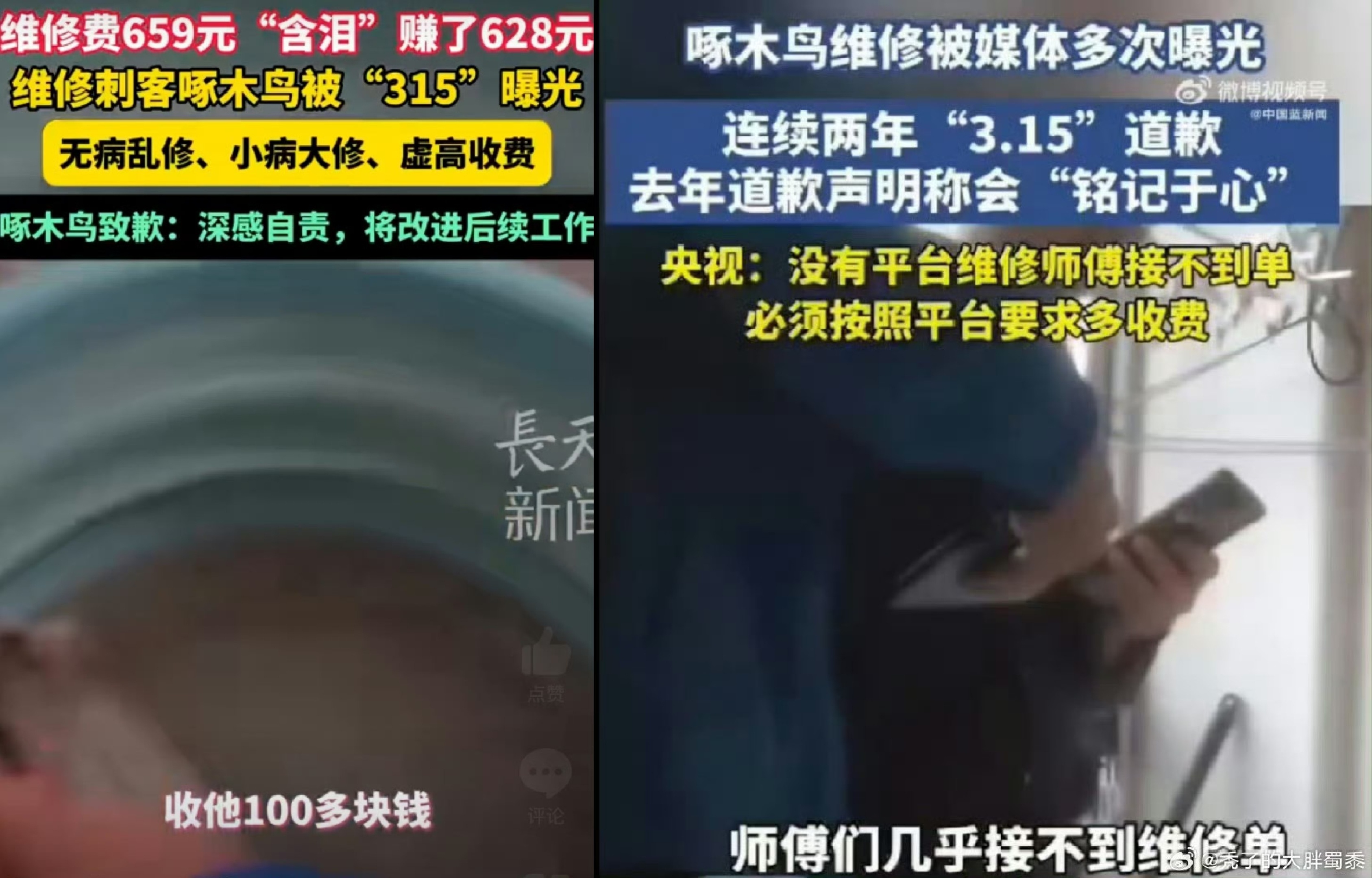 又是一年315,央视315曝光过两次的啄木鸟家庭维修平台,收费过高的旧毛病不改,居然又出现无病乱修、小病大修、乱收费等新问题,面对消费者对于啄木鸟“装修刺客”的质疑,创始人王国伟是从维修工做起的,把啄木鸟做成行业头部,本应该以身作则,深谙行业潜规则的他,却宣称整个行业99%有猫腻,平台抽成更高于同行两三倍。整改一年啄木鸟归来仍是维修刺客时事满谈