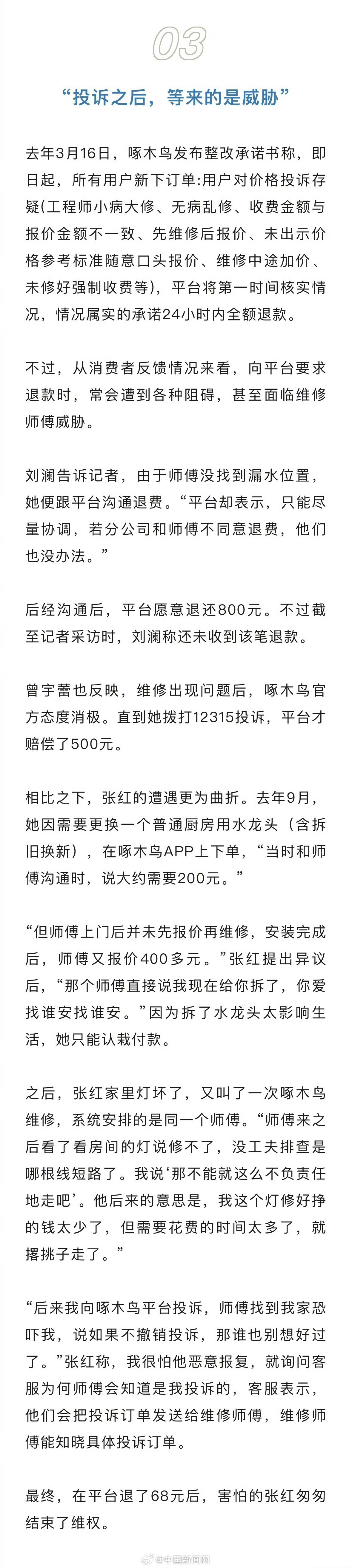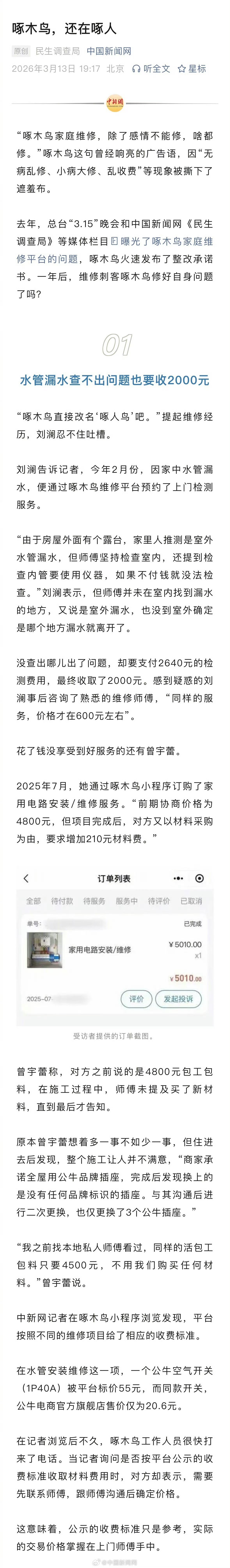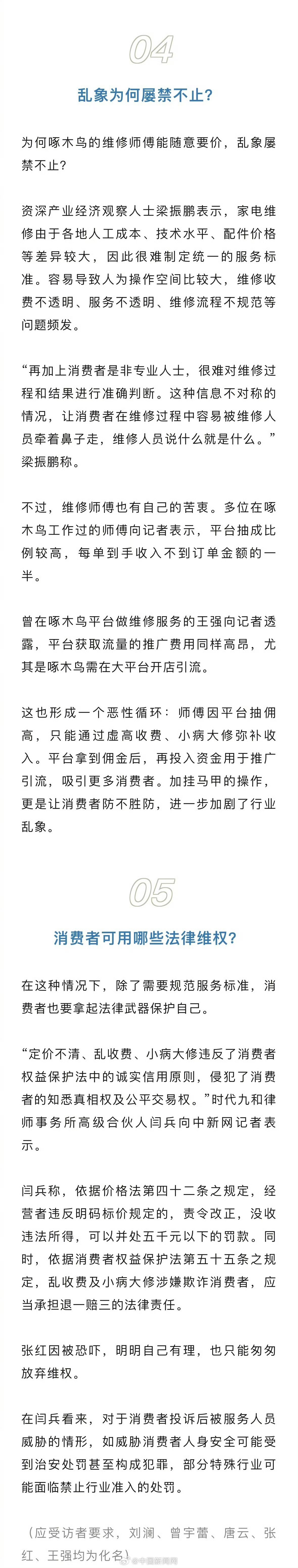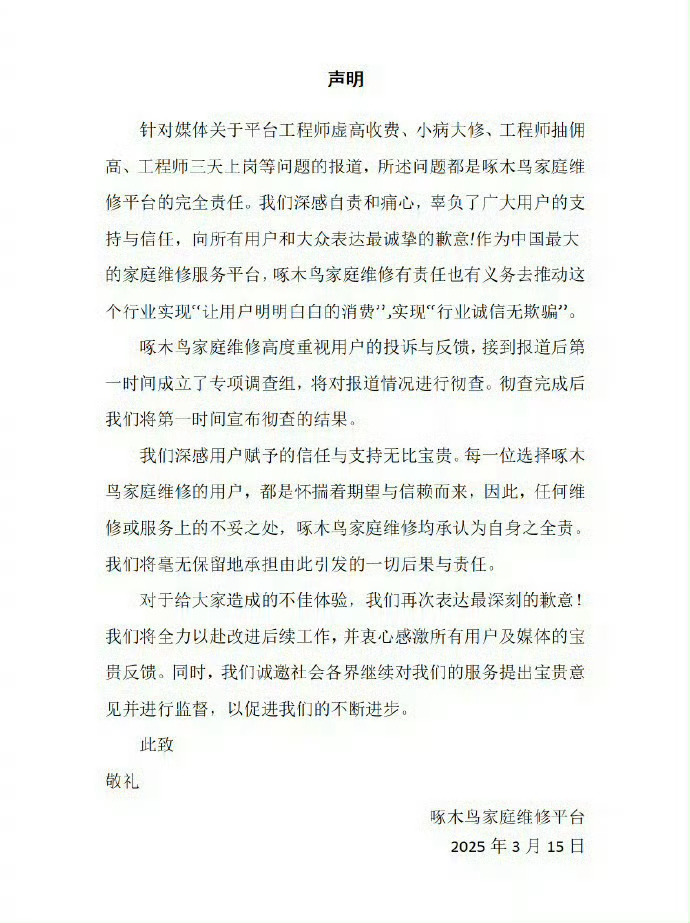 面对消费者质疑,央视315的连续曝光,啄木鸟成了“鸵鸟”,为了谋求暴利,压根没有彻底整改的决心。人最怕的是,忘了初心,忘了来时路,高中文化的王国伟,早年在广东从清洁杂工做起,后了解到家电维修行业的高收入后,转而回成都拜师学艺,再到2004年与妹妹王玉华创业,2014年以“啄木鸟”进军互联网家庭维修领域。