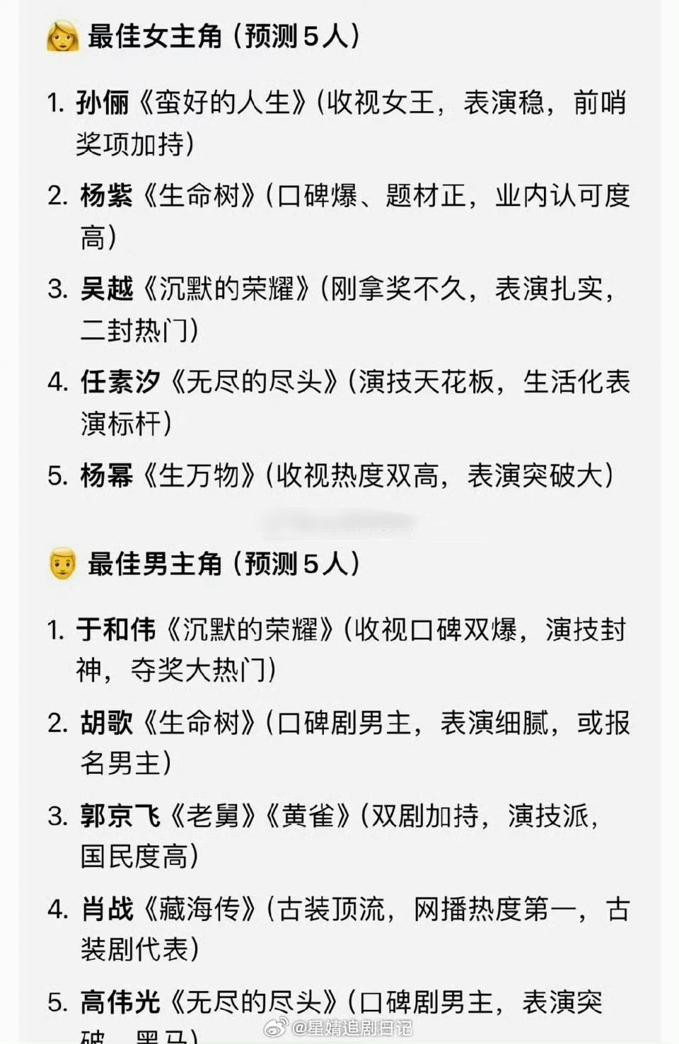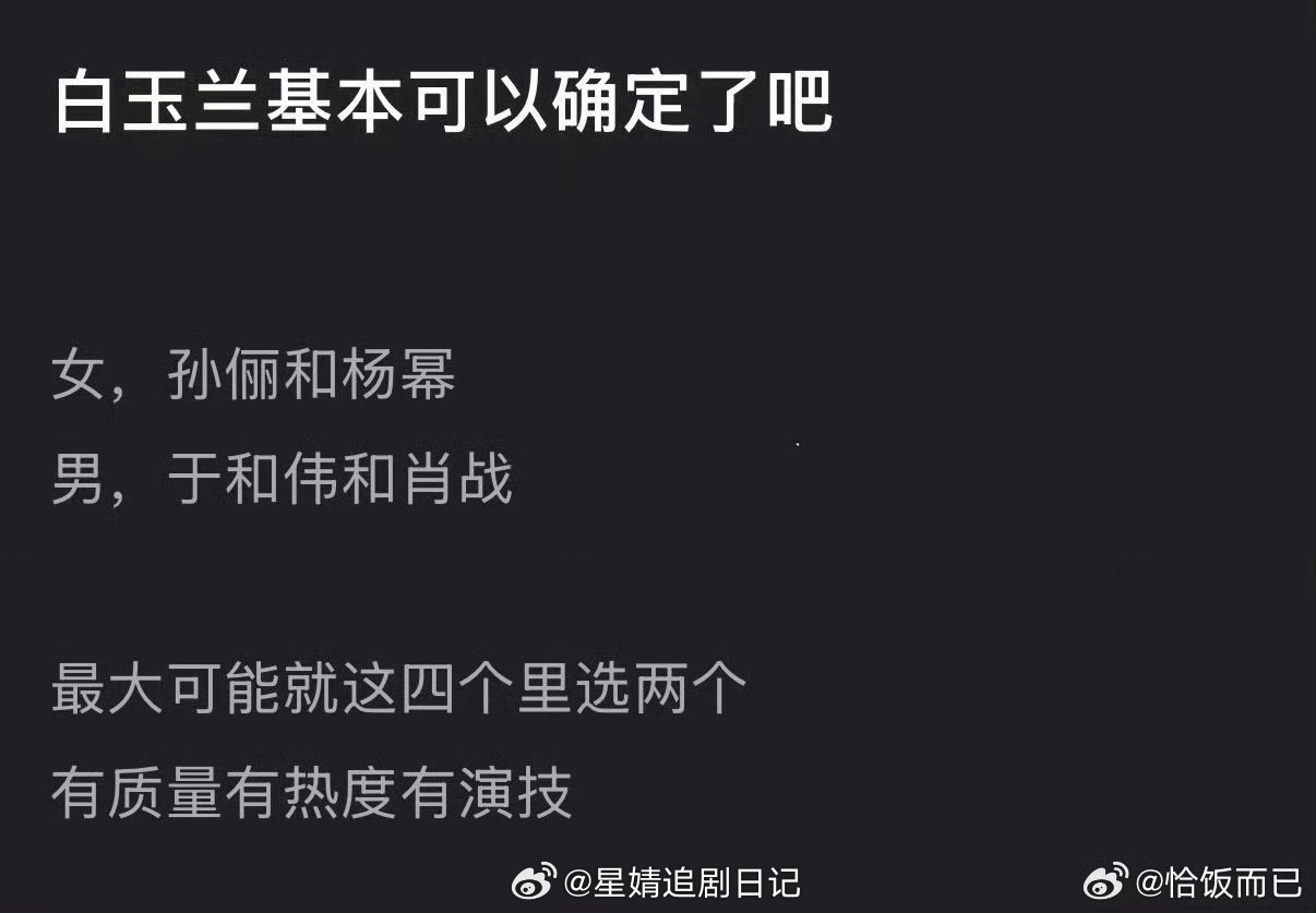 2026白玉兰提名名单预测 2026白玉兰视帝视后预测🈶,大家都看好谁? 孙俪杨幂竞争,于和伟肖战竞争……白玉兰视帝视后的种子选手,能提名白玉兰也很强了 大家都看好谁?视后提名:孙俪、杨紫、吴越、任素汐、杨幂视帝提名:于和伟、胡歌、郭京飞、肖战、高伟光