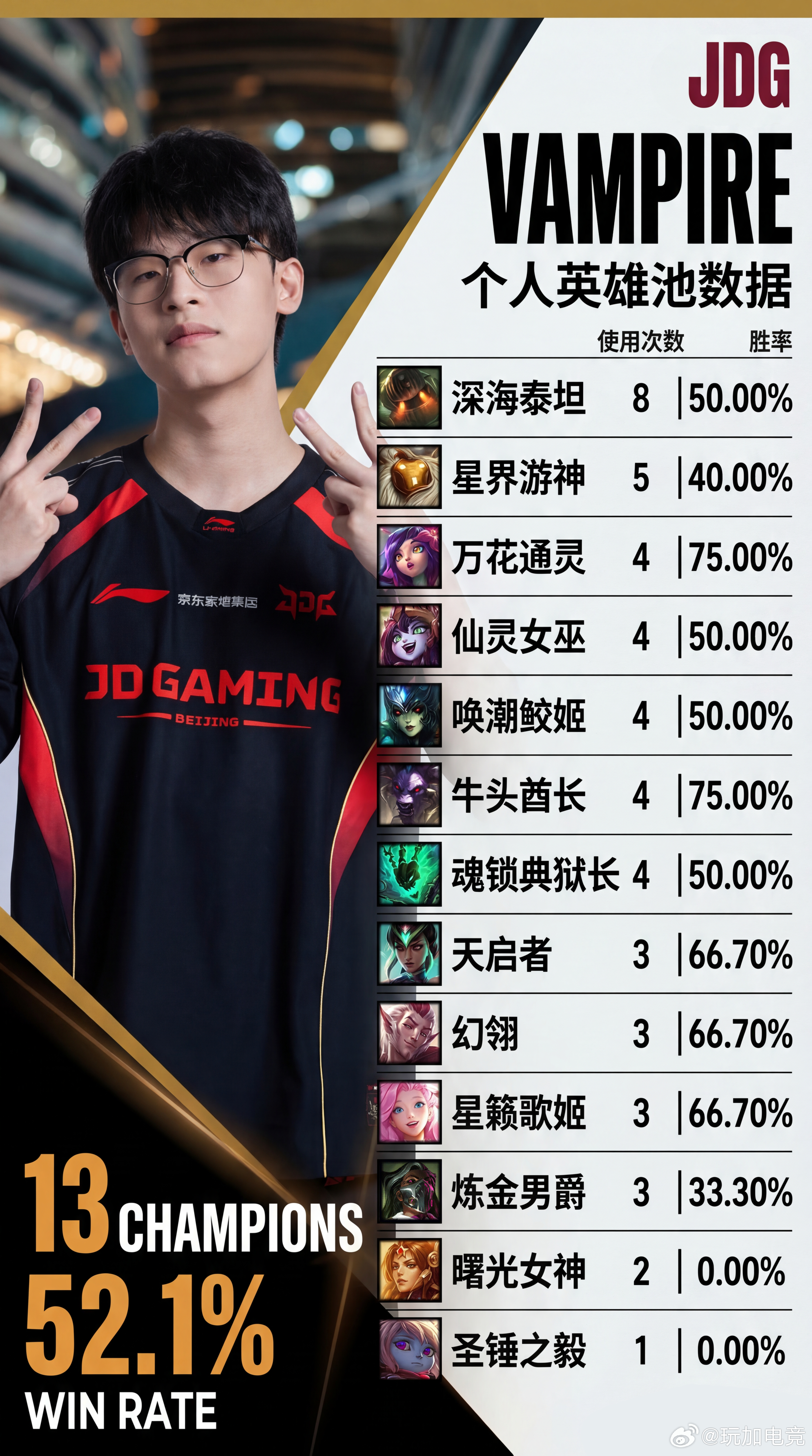 JDG Vampire 13个英雄,选用最多英雄为机器人(8次),胜率50%